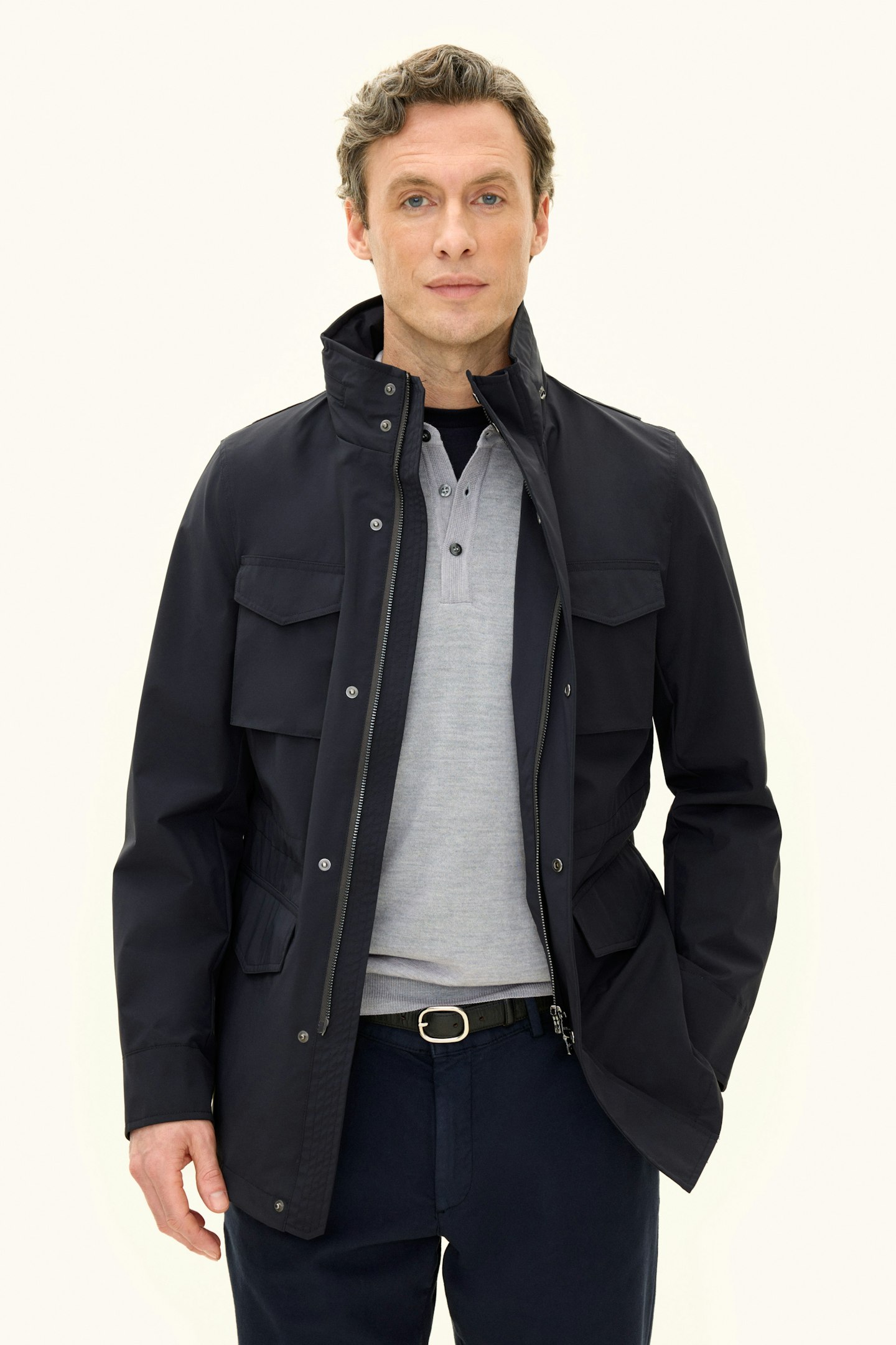 Our Field Jacket in Nylon Shell is a stylish and functional version of the classic M-65 jacket designed to complement both a blazer or a more casual knit sweater. With six external pockets and three inner pockets, you have space for everything you need to carry, and the option to protect your hands in tough weather conditions. The back is designed with an “action back” to give you additional mobility in the garment, and the waist is marked with adjustable drawstrings for a personalized fit. The inside is lined with ripstop fabric and includes buttons for attaching our liner vest. Nylon Shell is our three-layer outer shell material, developed to provide protection against weather and wind without compromising on mobility, breathability, or style.