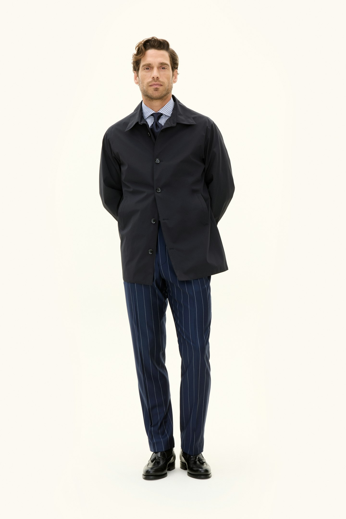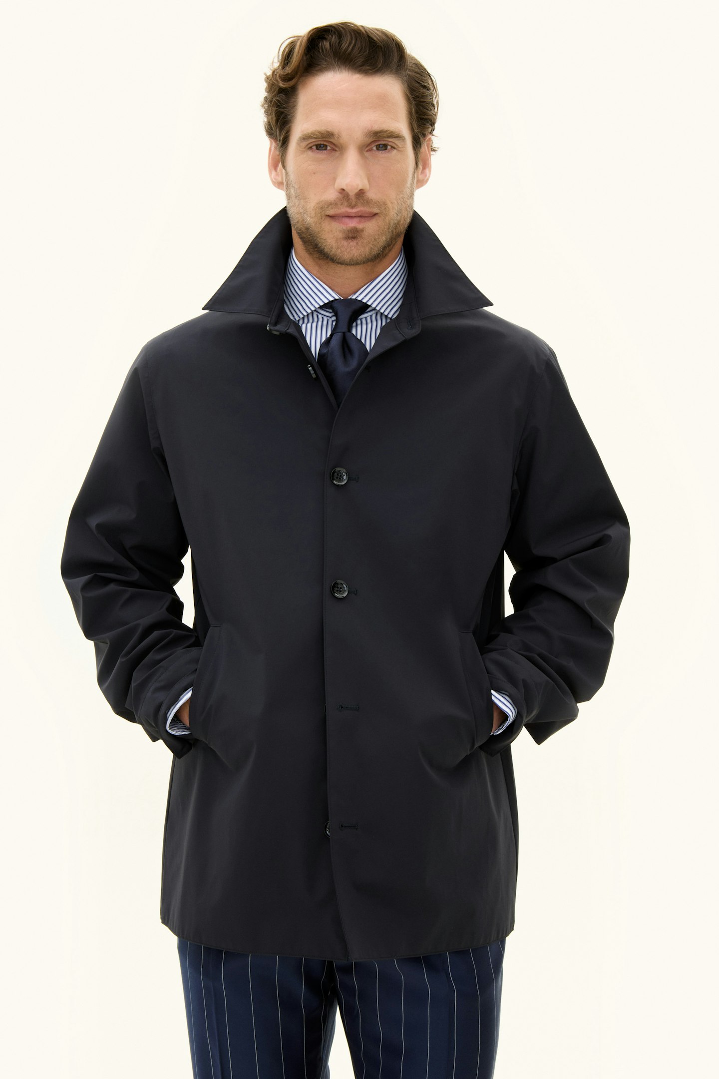 Denne korte Car Coat i vårt innovative trelagsmateriale Nylon Shell er designet for å være det ultimate skallplagget i hverdagen din. Den kombinerer funksjon og stil, noe som gjør den like naturlig over en formell dress som til et par avslappede jeans. Det vannavvisende og vanntette ytterstoffet beskytter deg mot regn og ruskevær, mens det slitesterke ripstop-fôret på innsiden gir økt holdbarhet. For ekstra funksjonalitet har jakken tre praktiske innerlommer. Med sin balanserte blanding av værbeskyttelse, bevegelsesfrihet og pusteevne er dette et plagg du kan stole på – uansett vær.
