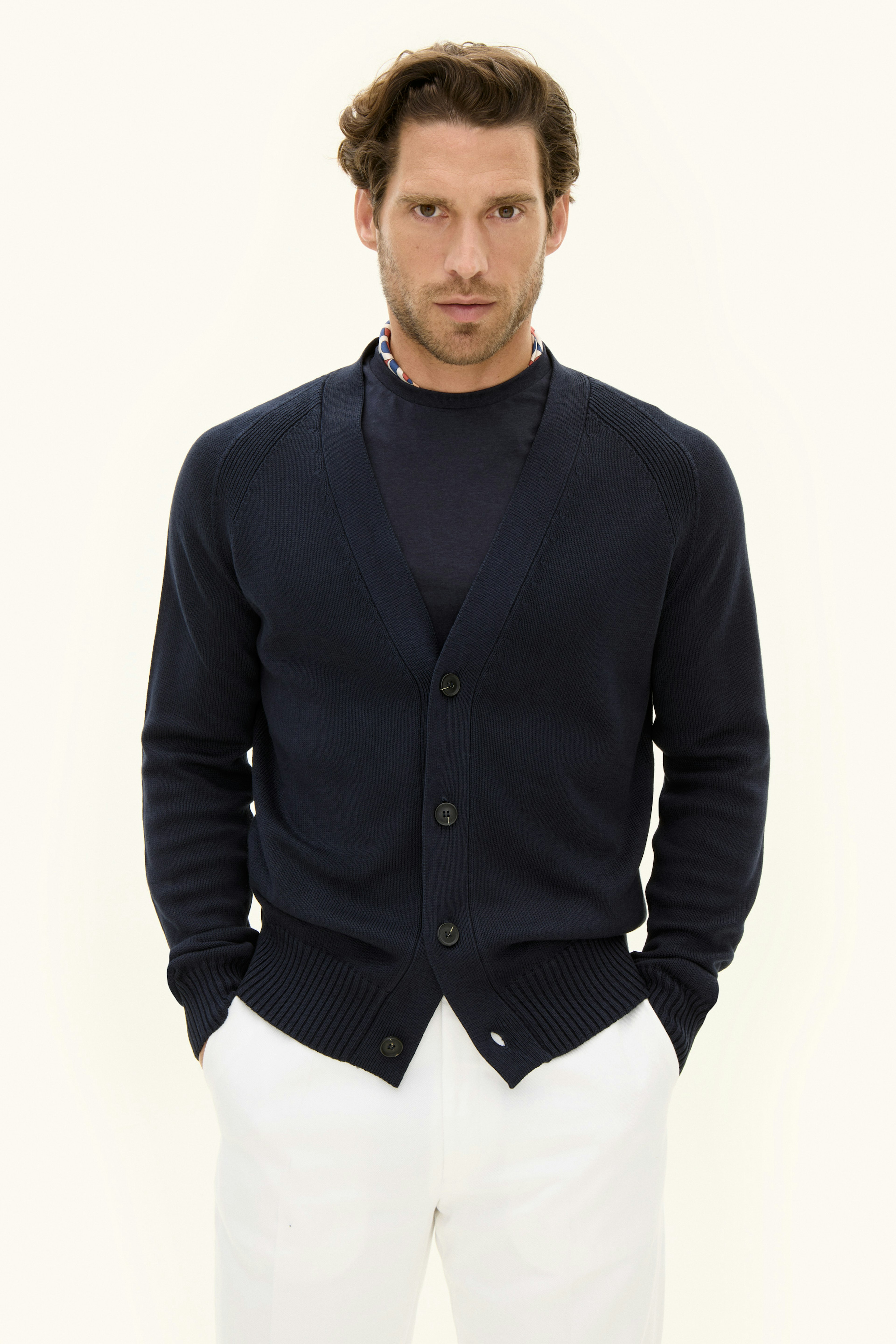 Laget av 100 % bomull, har dette strikkeplagget en regular fit. Det er designet med en sofistikert sjalskrage, stylet med et tidløst ensfarget mønster og laget med strikket konstruksjon. Designet for å komplementere enhver garderobe med sin tidløse eleganse.