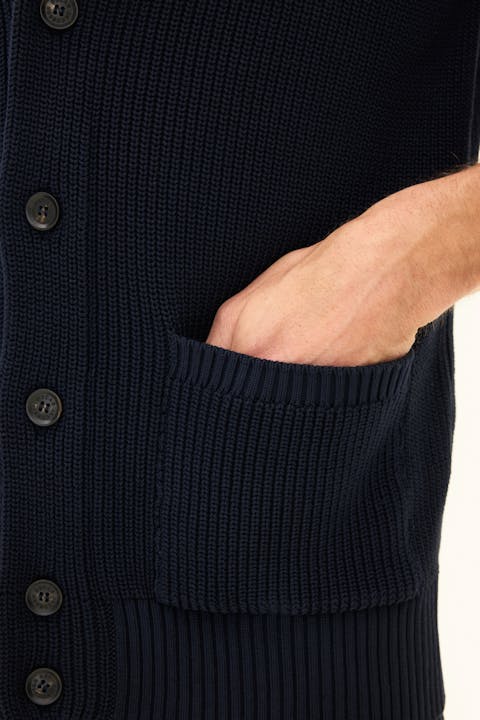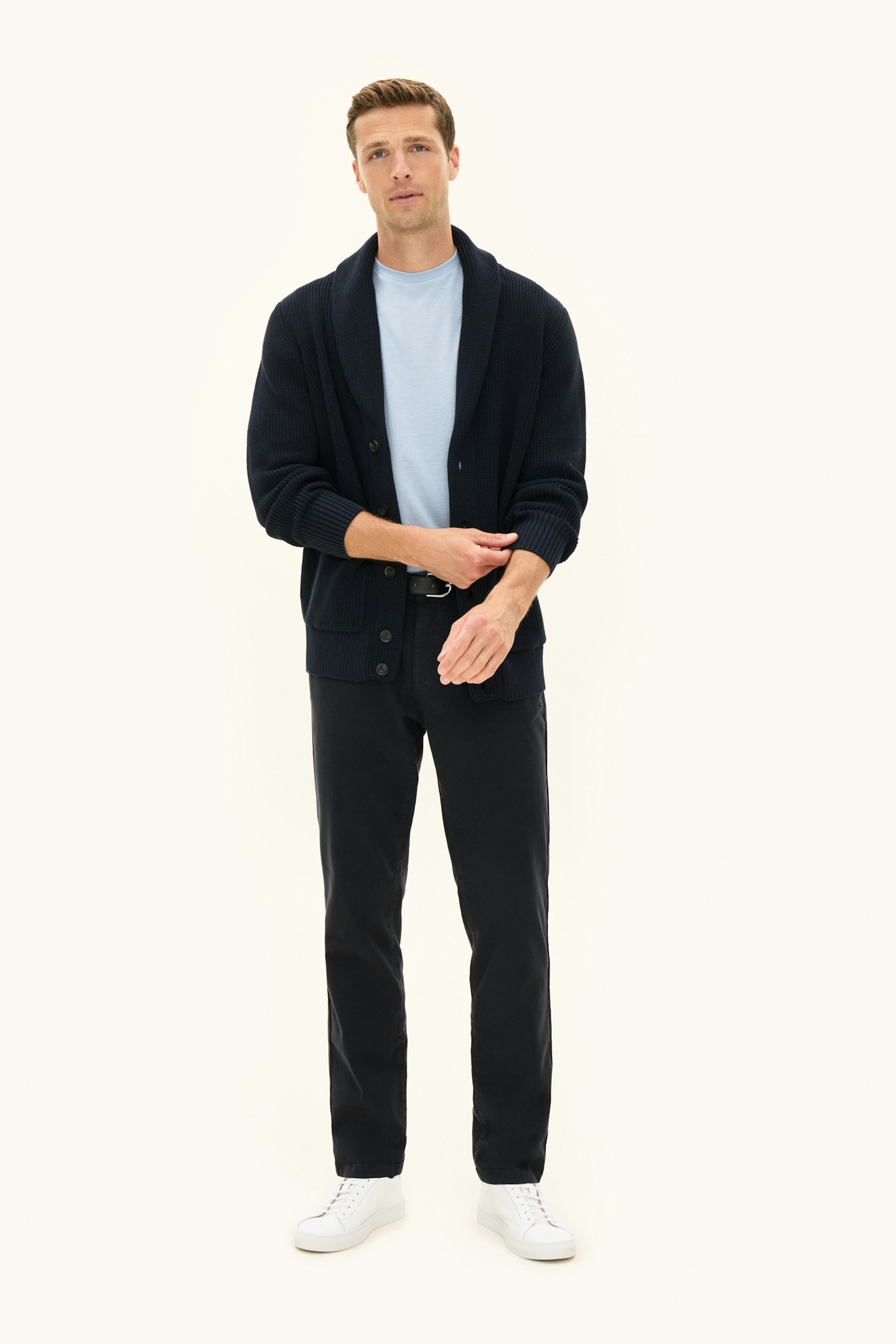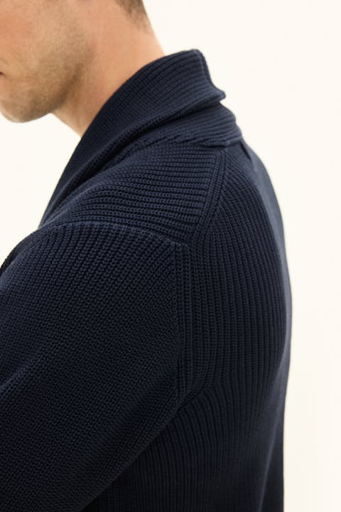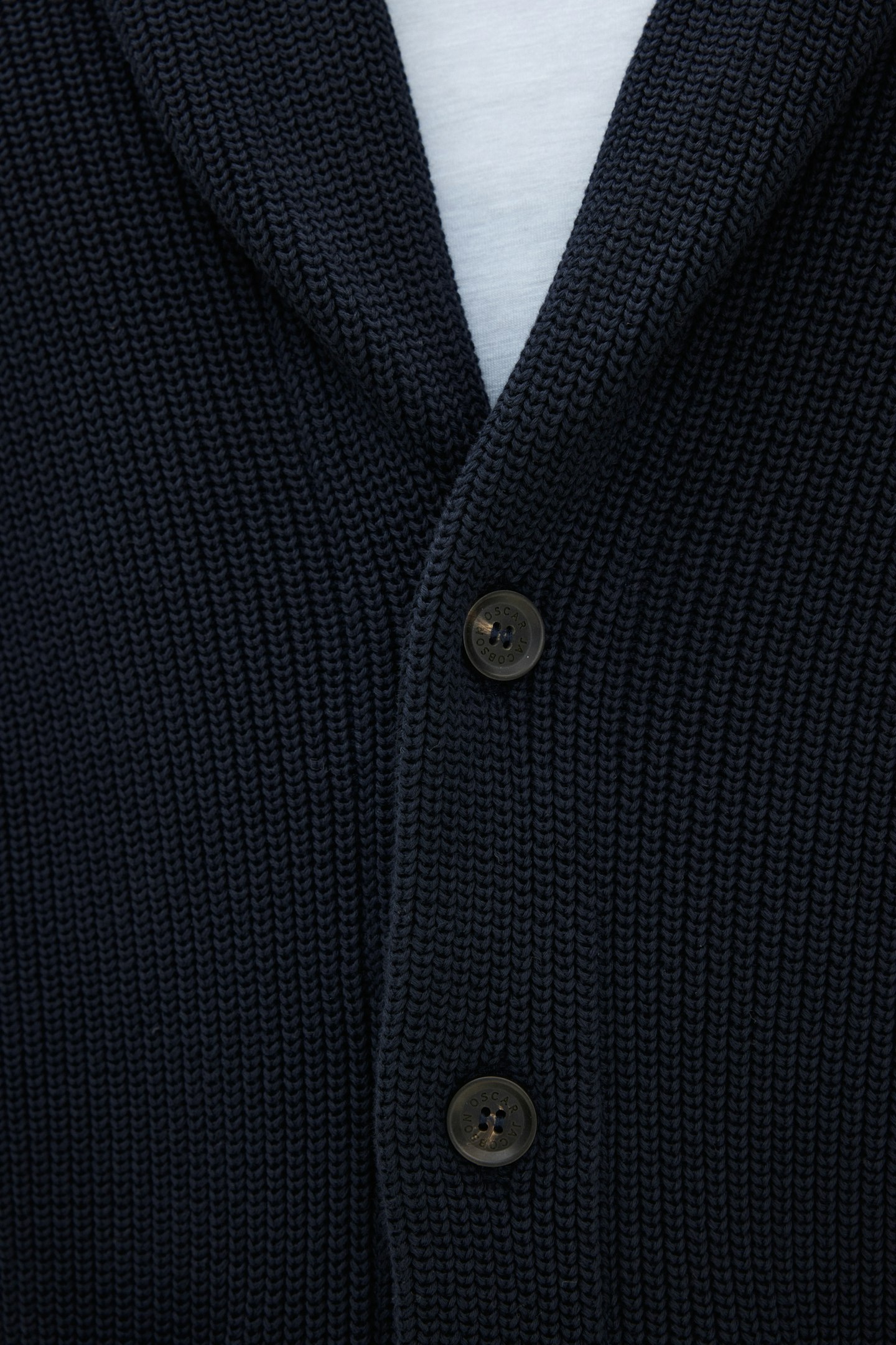 En ribbestrikket cardigan i 100 % bomull med sjalskrage og regular fit. Den myke strikken gir et avslappet, men stilig uttrykk, noe som gjør denne modellen ideell både som mellomlag og som et selvstendig plagg.