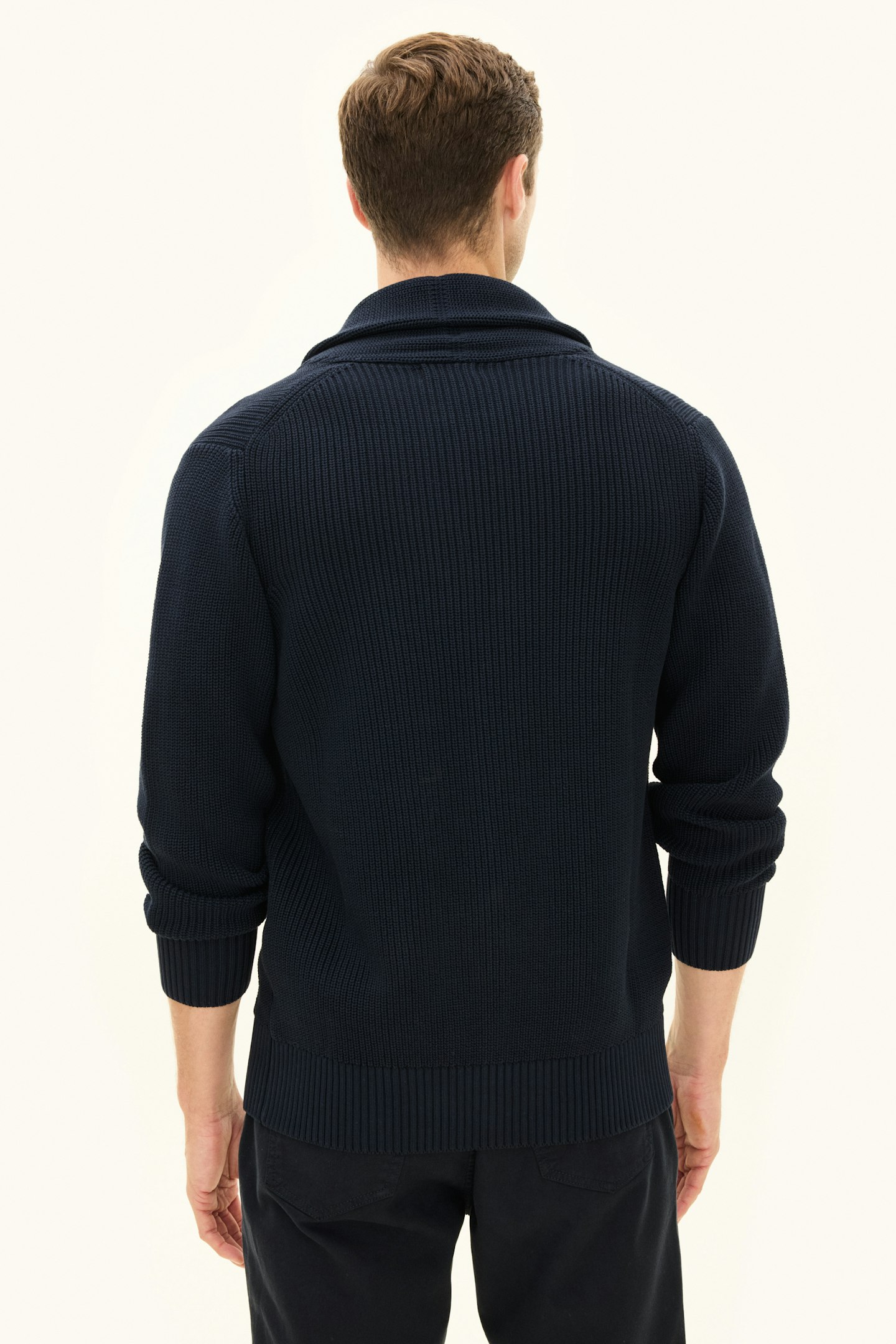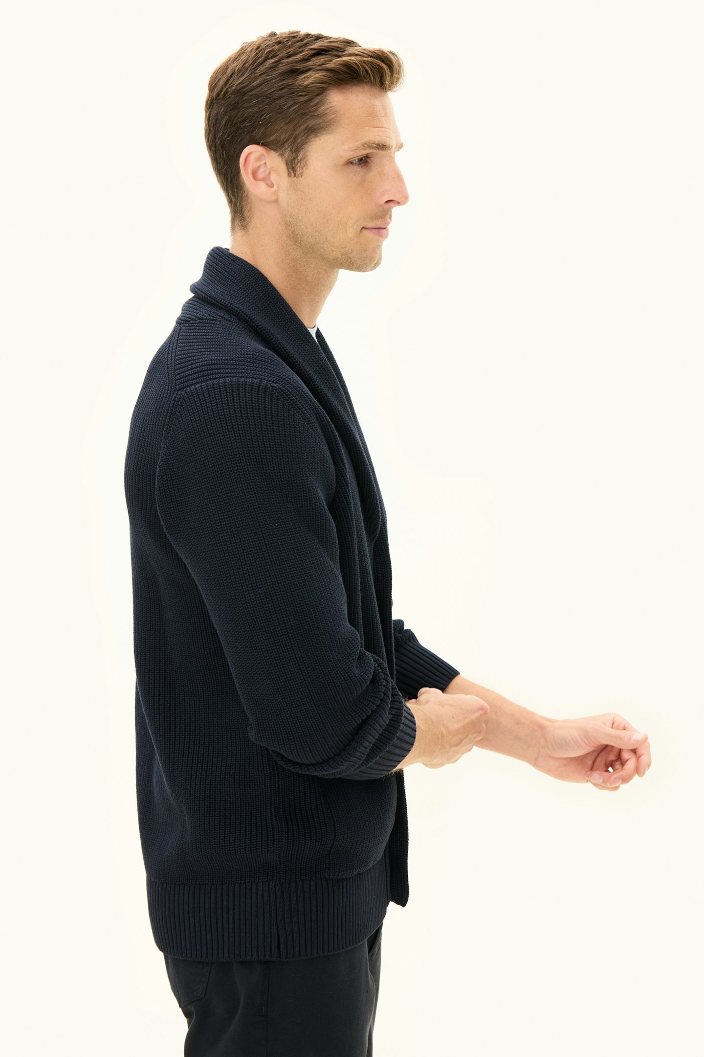 En ribbestrikket cardigan i 100 % bomull med sjalskrage og regular fit. Den myke strikken gir et avslappet, men stilig uttrykk, noe som gjør denne modellen ideell både som mellomlag og som et selvstendig plagg.
