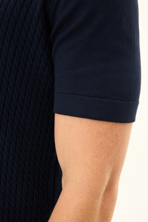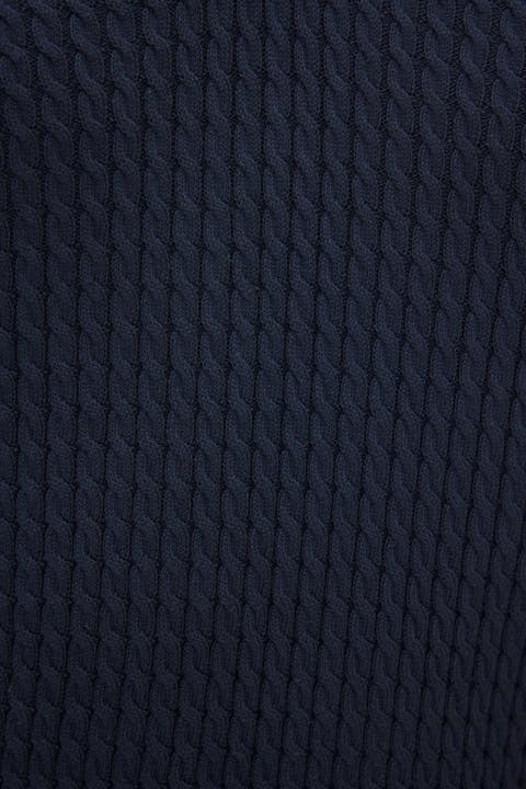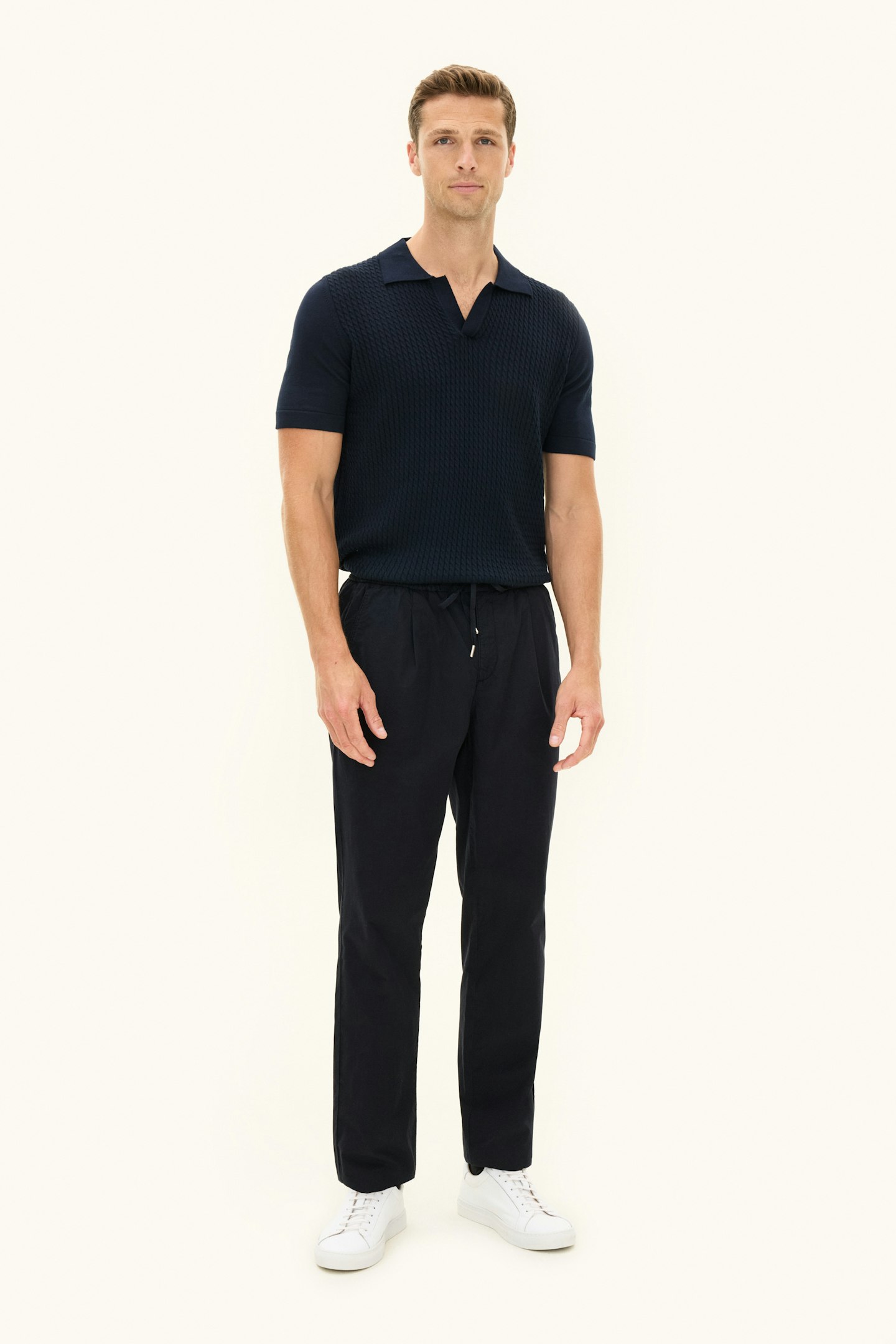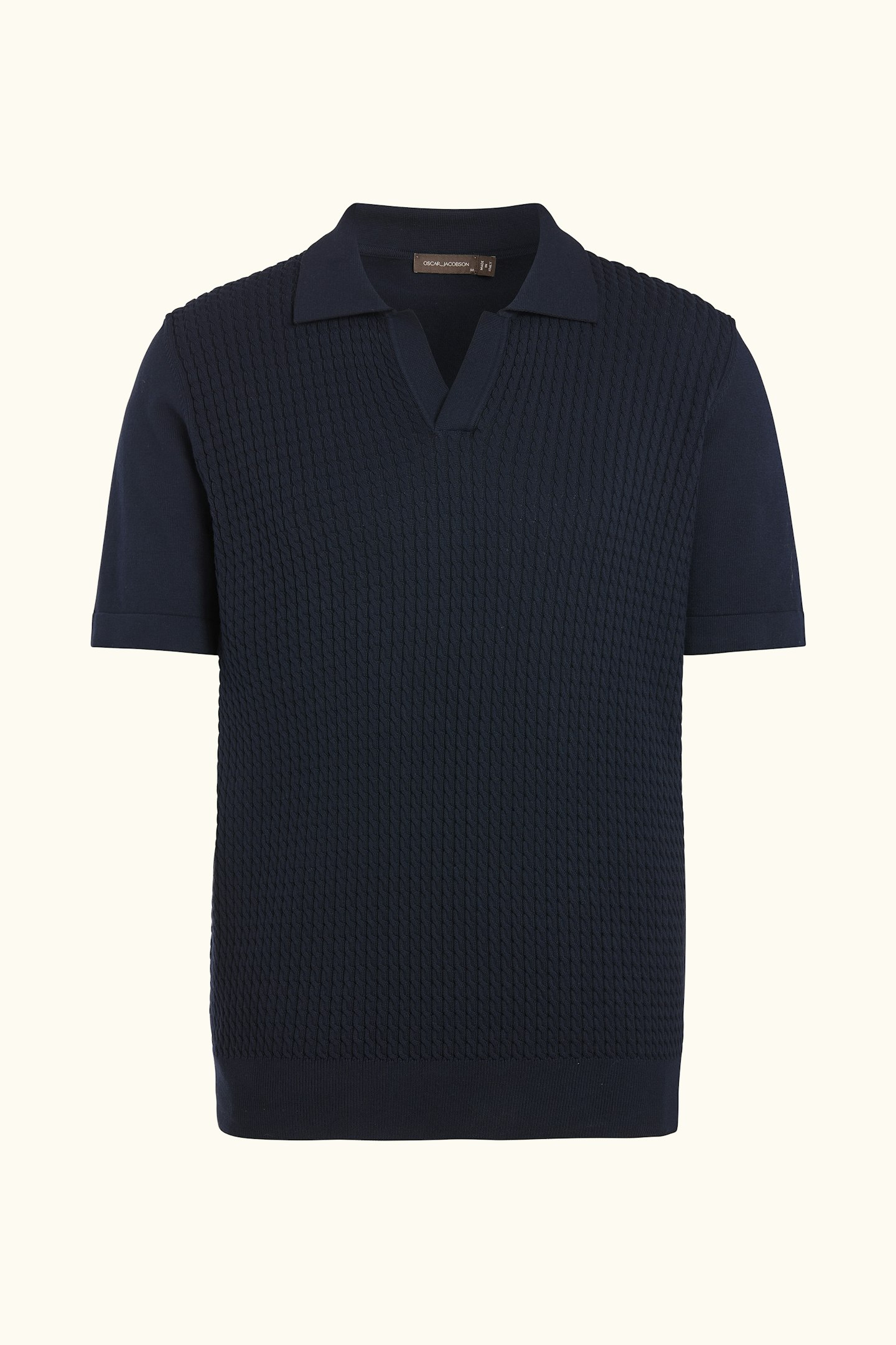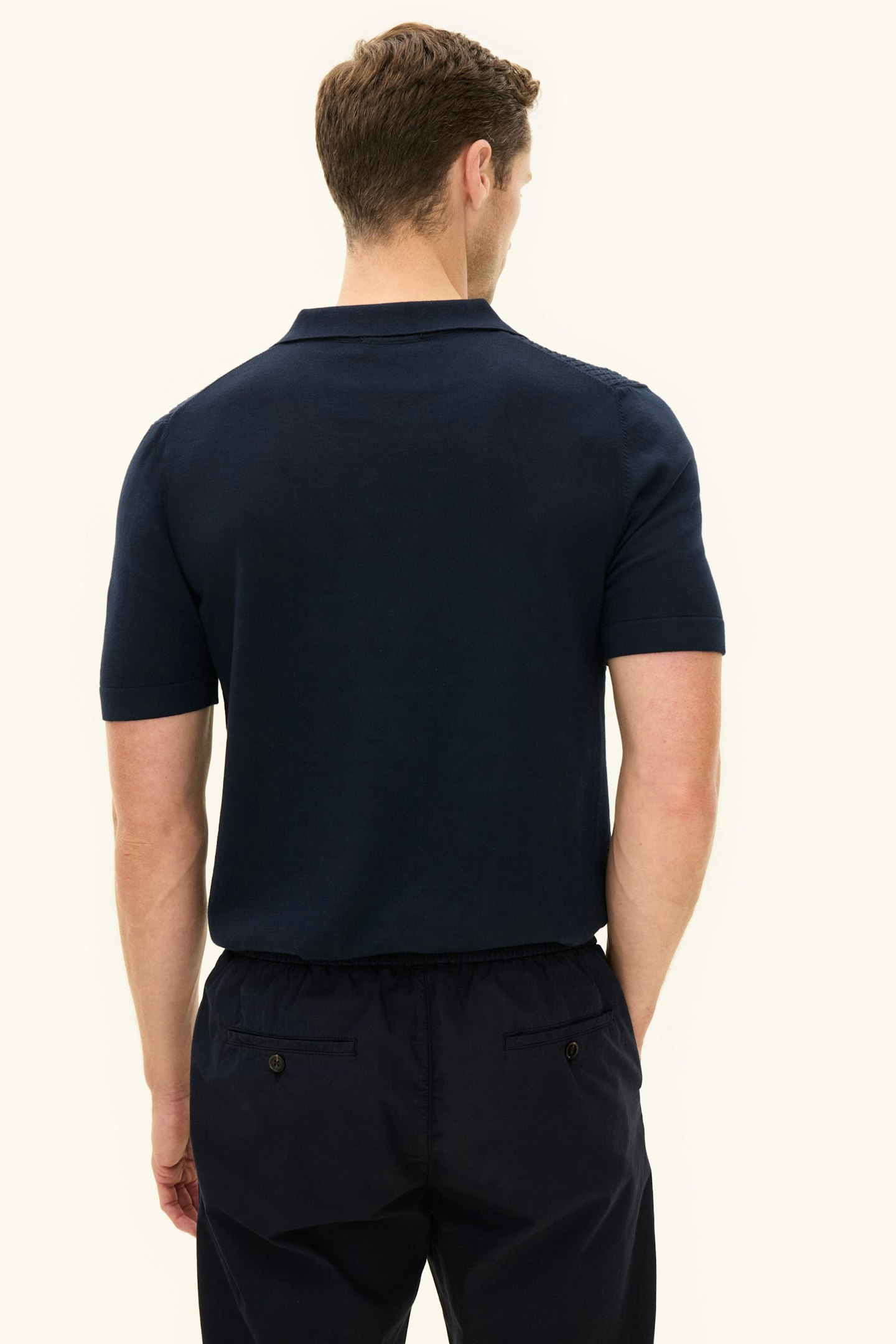 Kortermet strikket kragegenser i plaggfarget bomull. Strikket i 12gg med fin kabelstruktur på forstykket. Uten knapper foran, noe som gir et mer avslappet uttrykk. Et fint plagg å bruke til chinos, men kan like gjerne bæres under en avslappet dress eller blazer.