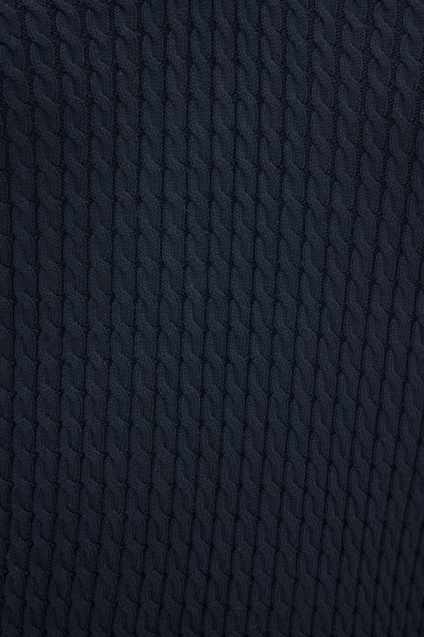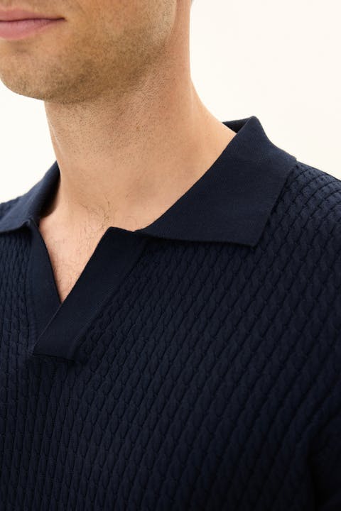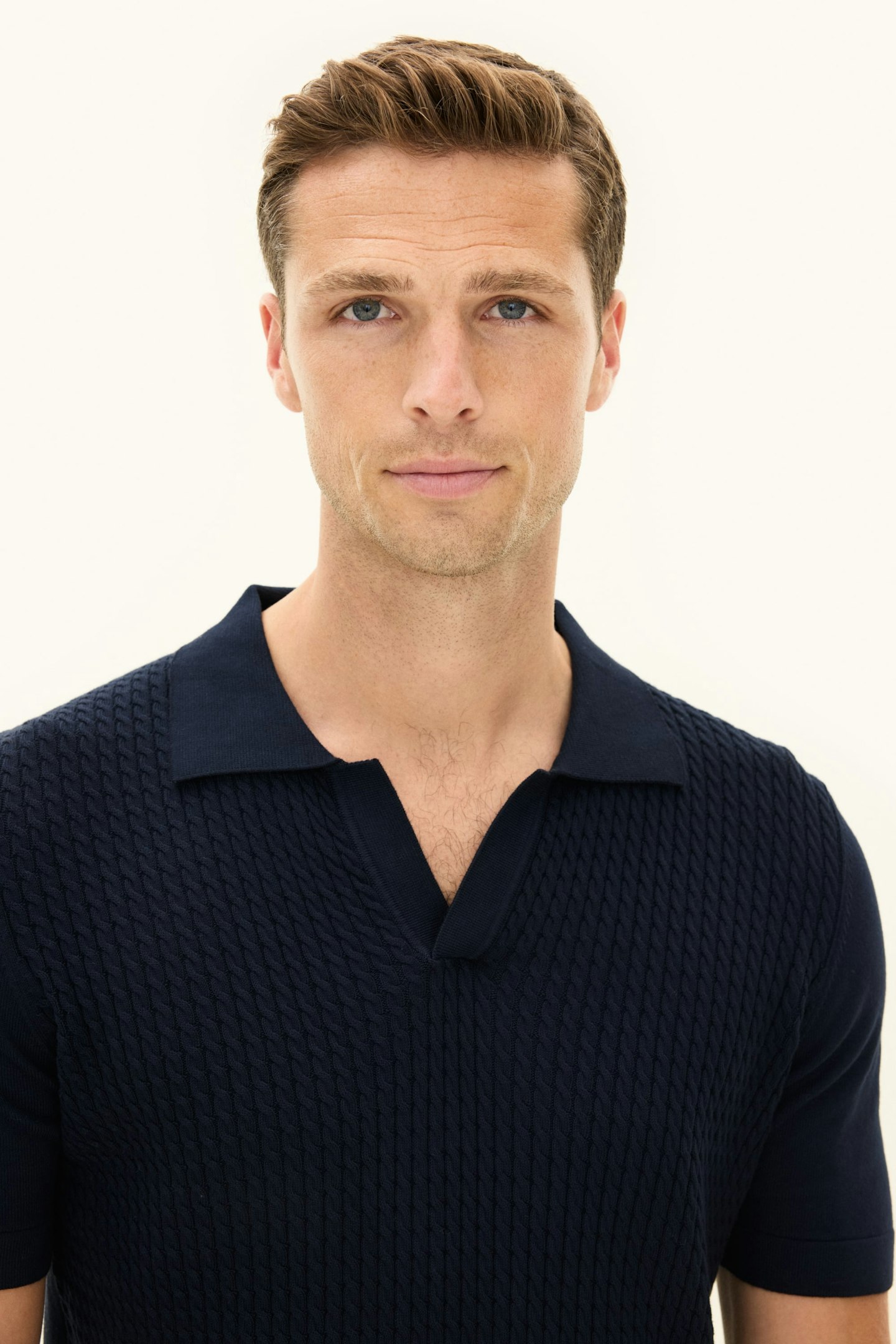 Kortermet strikket kragegenser i plaggfarget bomull. Strikket i 12gg med fin kabelstruktur på forstykket. Uten knapper foran, noe som gir et mer avslappet uttrykk. Et fint plagg å bruke til chinos, men kan like gjerne bæres under en avslappet dress eller blazer.
