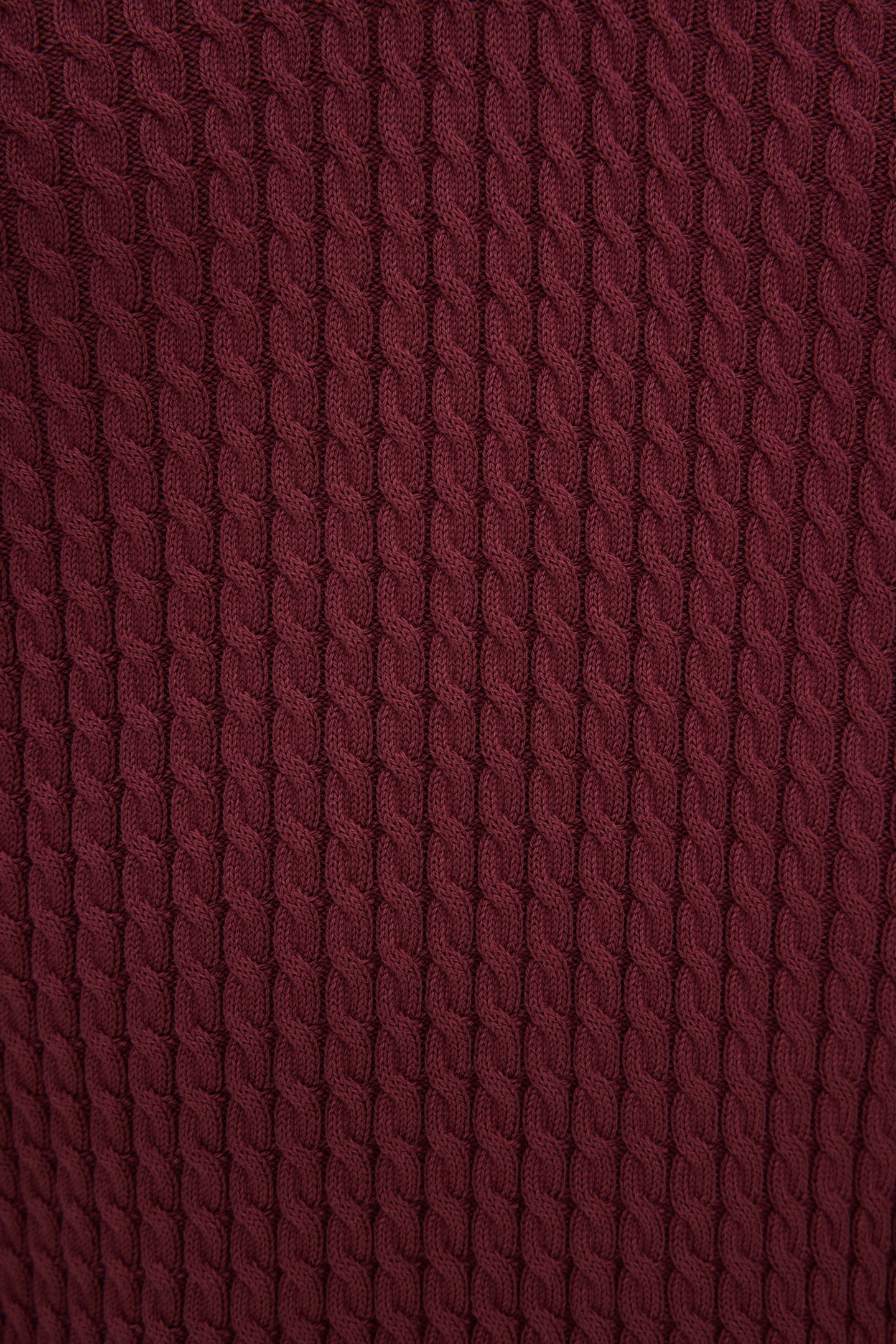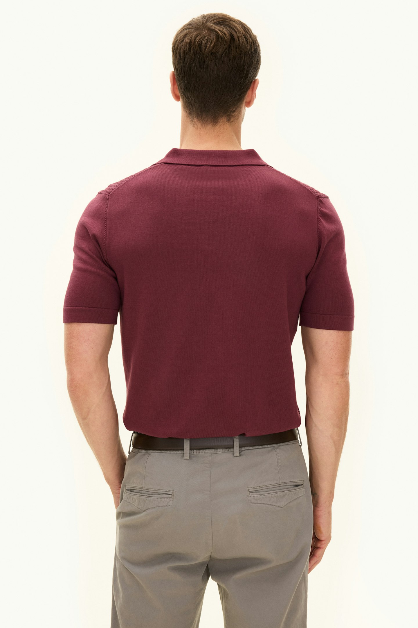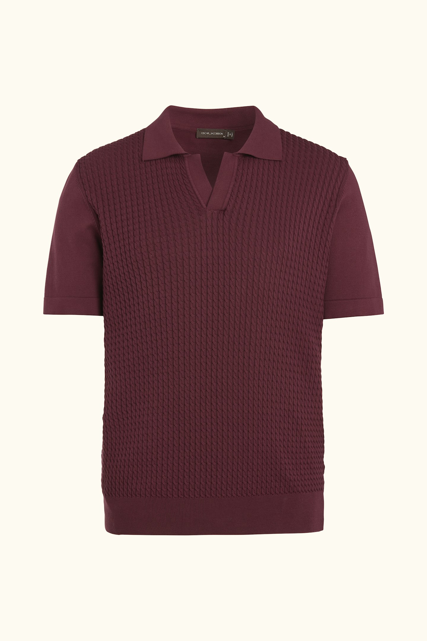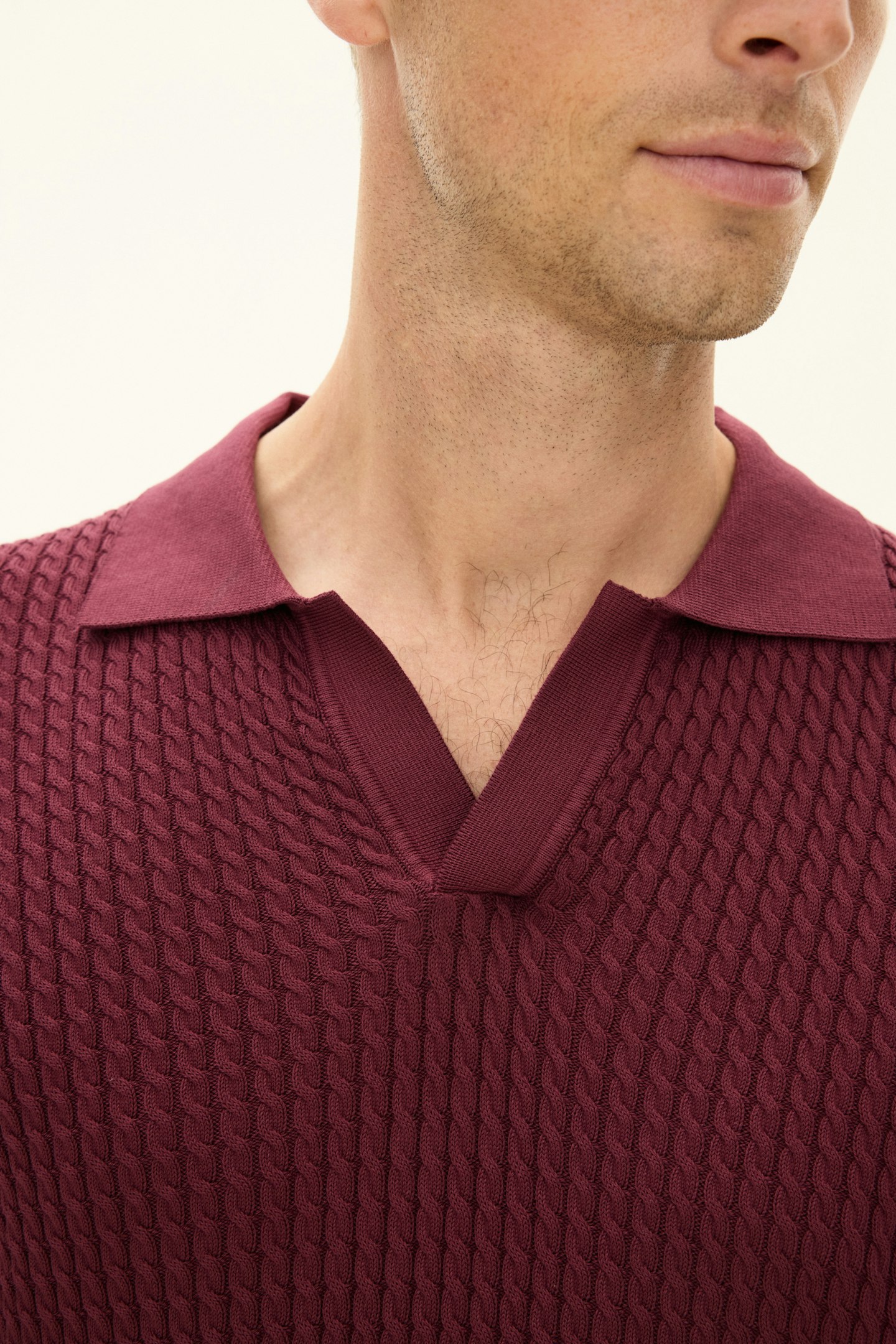 Kortermet strikket kragegenser i plaggfarget bomull. Strikket i 12gg med fin kabelstruktur på forstykket. Uten knapper foran, noe som gir et mer avslappet uttrykk. Et fint plagg å bruke til chinos, men kan like gjerne bæres under en avslappet dress eller blazer.