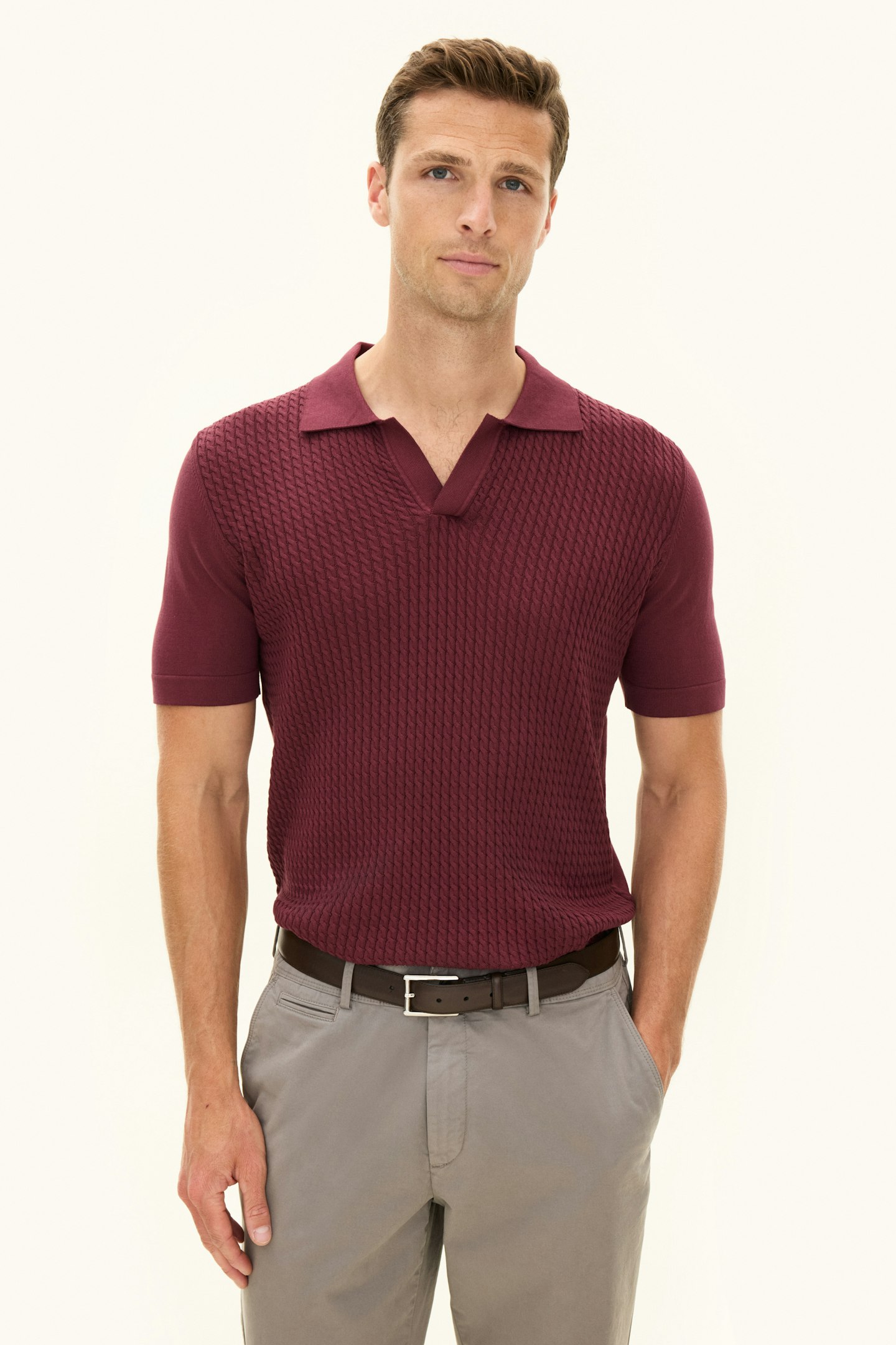 Kortermet strikket kragegenser i plaggfarget bomull. Strikket i 12gg med fin kabelstruktur på forstykket. Uten knapper foran, noe som gir et mer avslappet uttrykk. Et fint plagg å bruke til chinos, men kan like gjerne bæres under en avslappet dress eller blazer.
