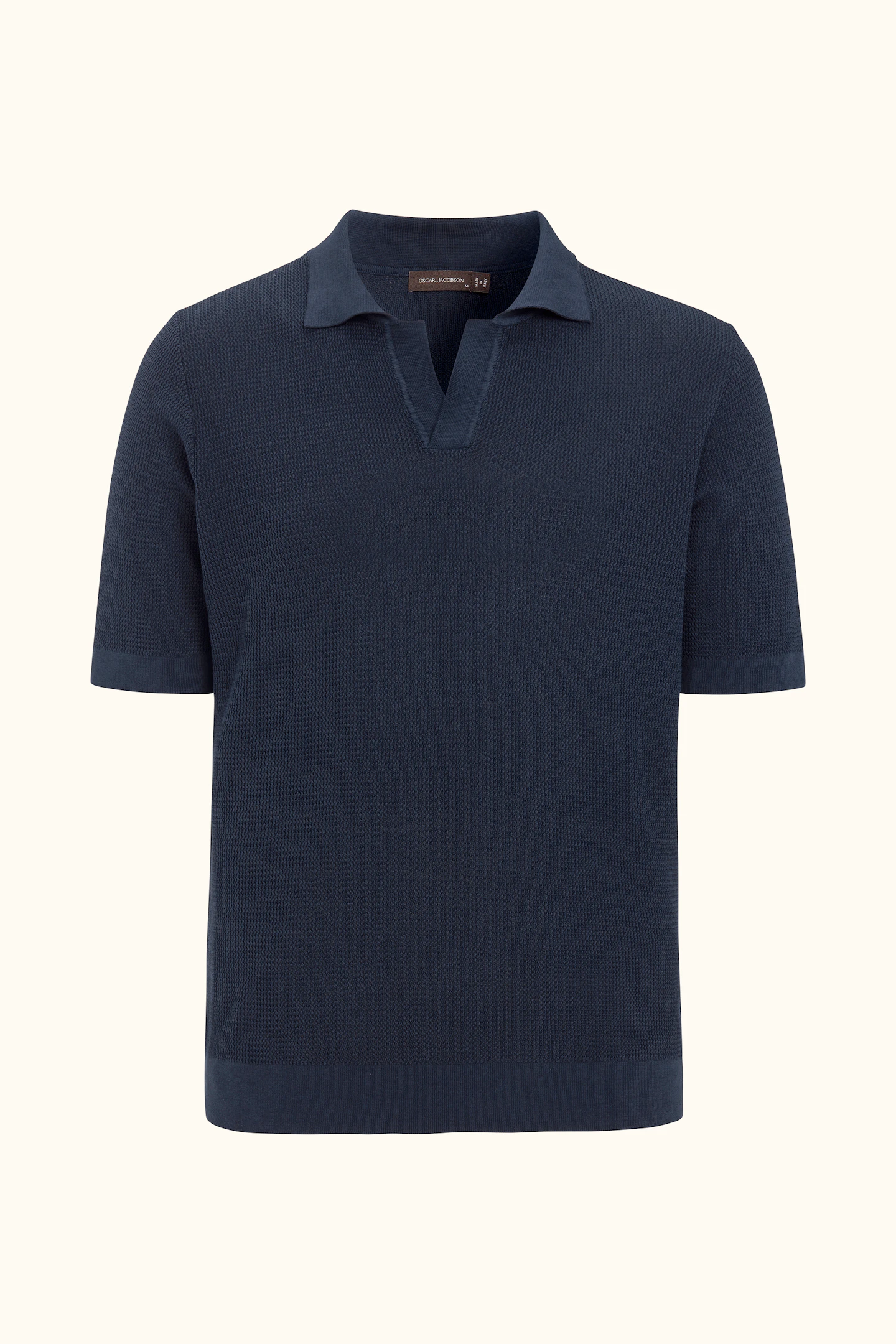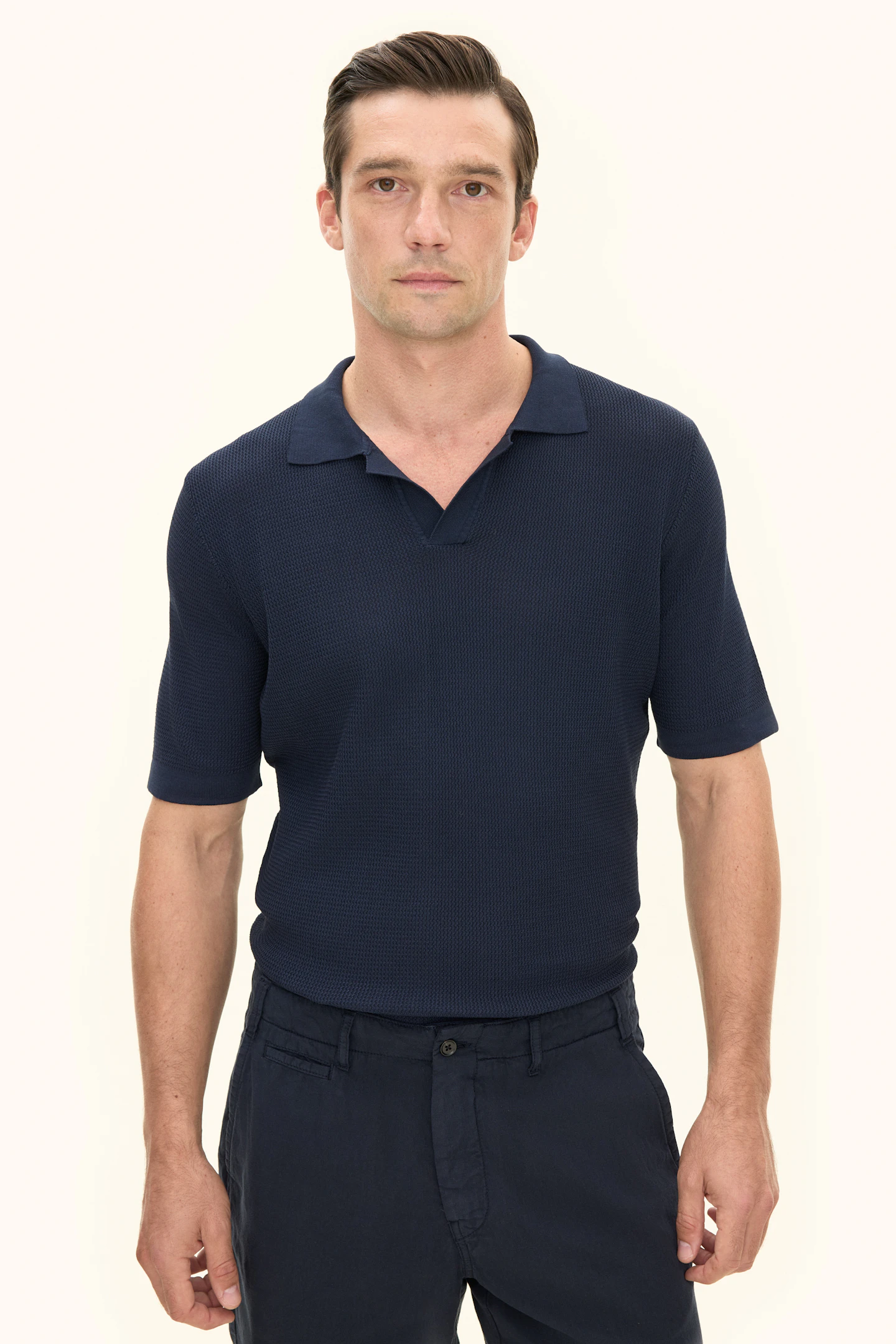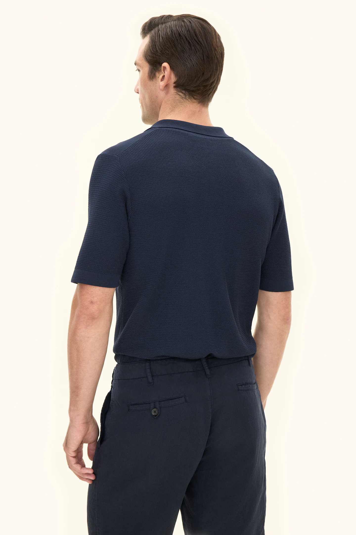 Kortermet strikket genser med krage i plaggfarget bomull. Strikket i 12gg med en liten, fin struktur over hele plagget. Designet er uten knapper foran, noe som gir et avslappet uttrykk. Plagget har ikke ribbestrikkede avslutninger, noe som gir en rettere silhuett. En flott genser til ulike typer bukser, men den kan like gjerne brukes under en uformell dress eller blazer.