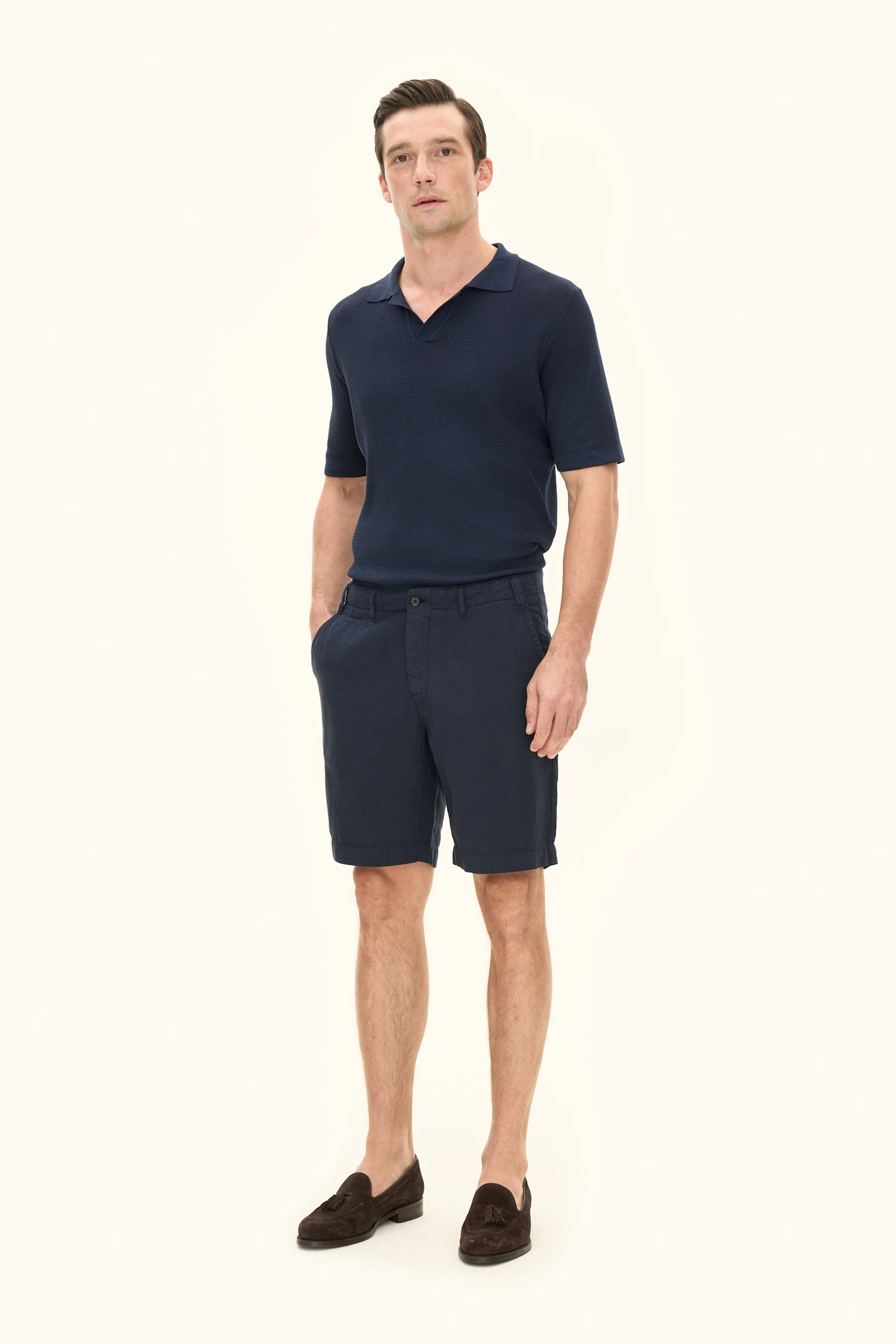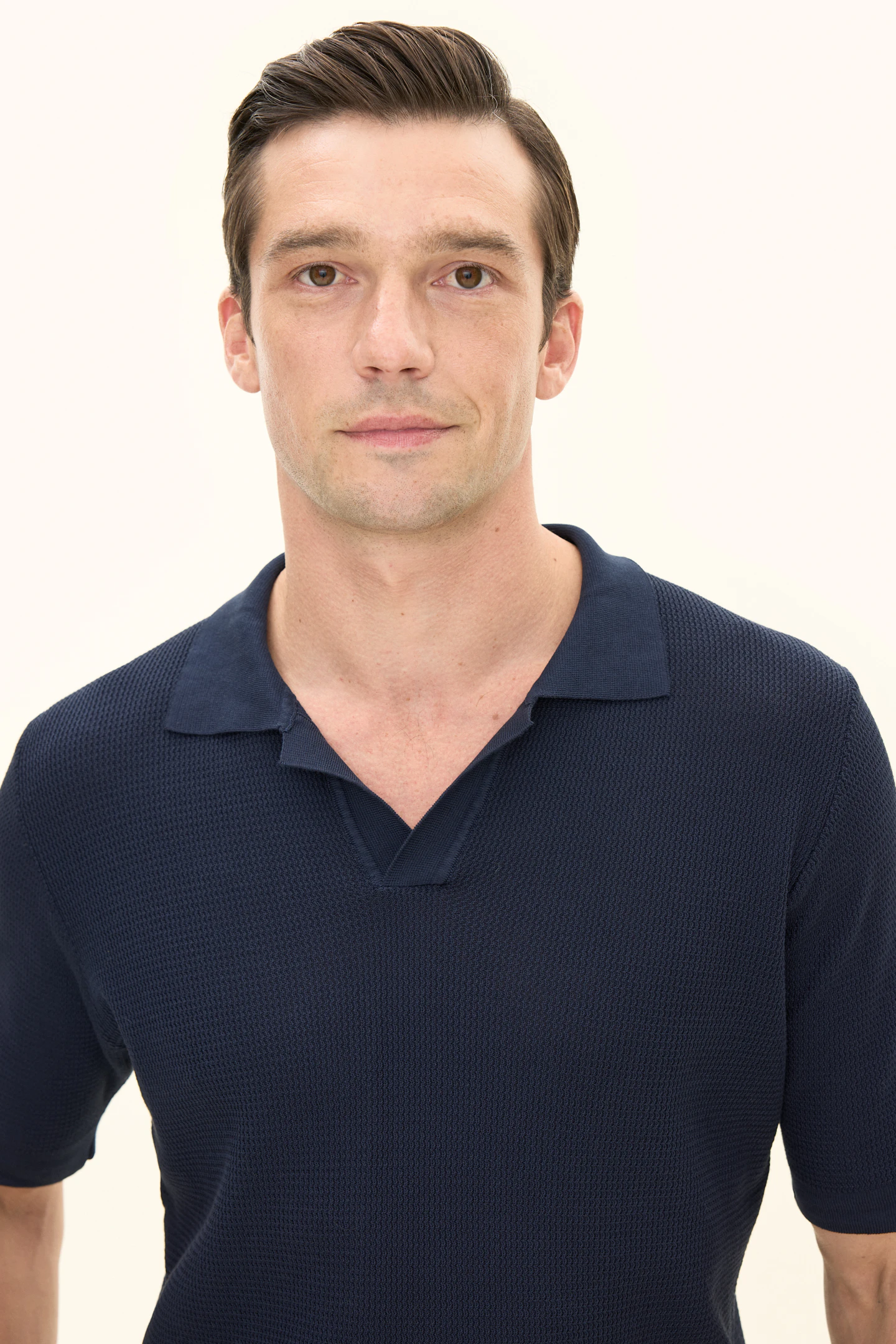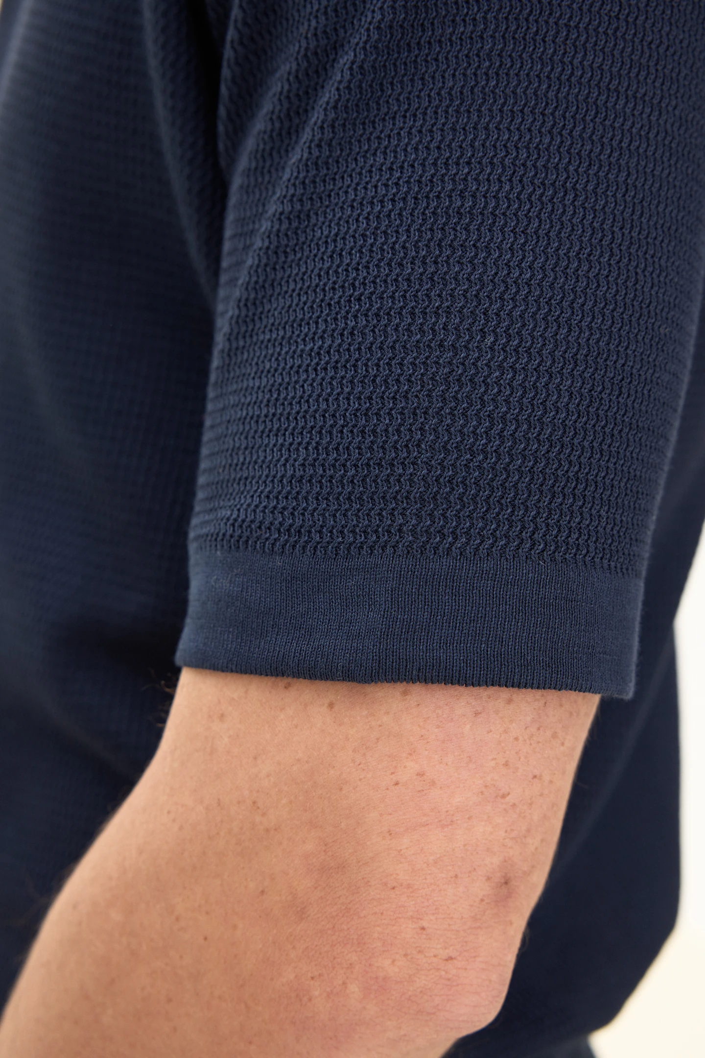 Kortermet strikket genser med krage i plaggfarget bomull. Strikket i 12gg med en liten, fin struktur over hele plagget. Designet er uten knapper foran, noe som gir et avslappet uttrykk. Plagget har ikke ribbestrikkede avslutninger, noe som gir en rettere silhuett. En flott genser til ulike typer bukser, men den kan like gjerne brukes under en uformell dress eller blazer.
