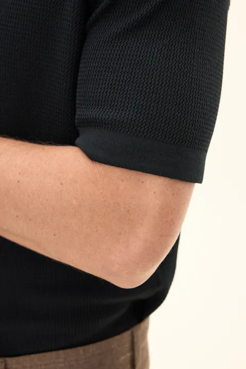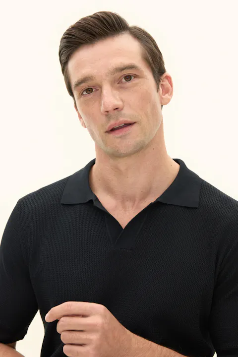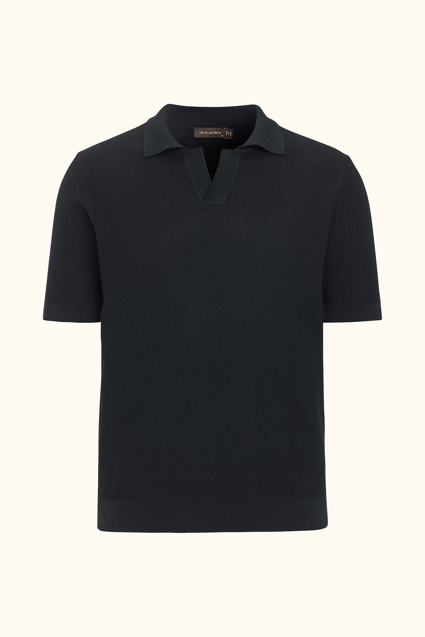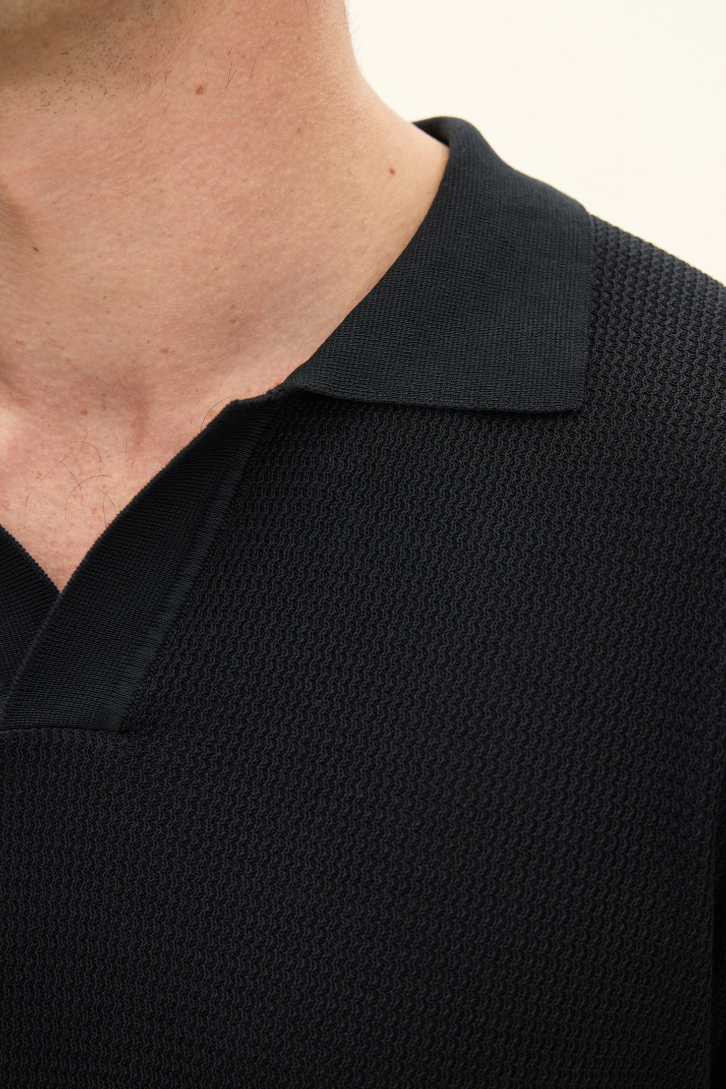 Kortermet strikket genser med krage i plaggfarget bomull. Strikket i 12gg med en liten, fin struktur over hele plagget. Designet er uten knapper foran, noe som gir et avslappet uttrykk. Plagget har ikke ribbestrikkede avslutninger, noe som gir en rettere silhuett. En flott genser til ulike typer bukser, men den kan like gjerne brukes under en uformell dress eller blazer.