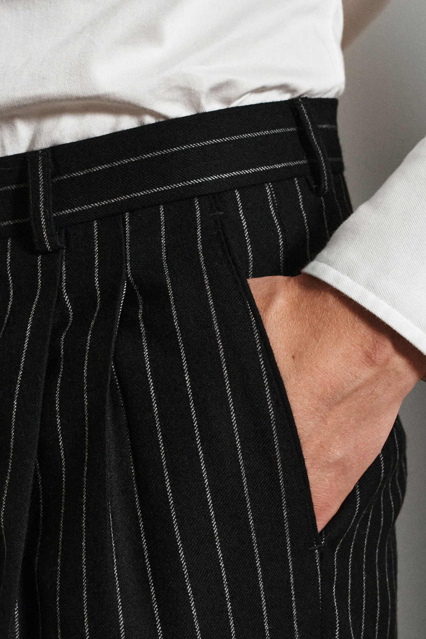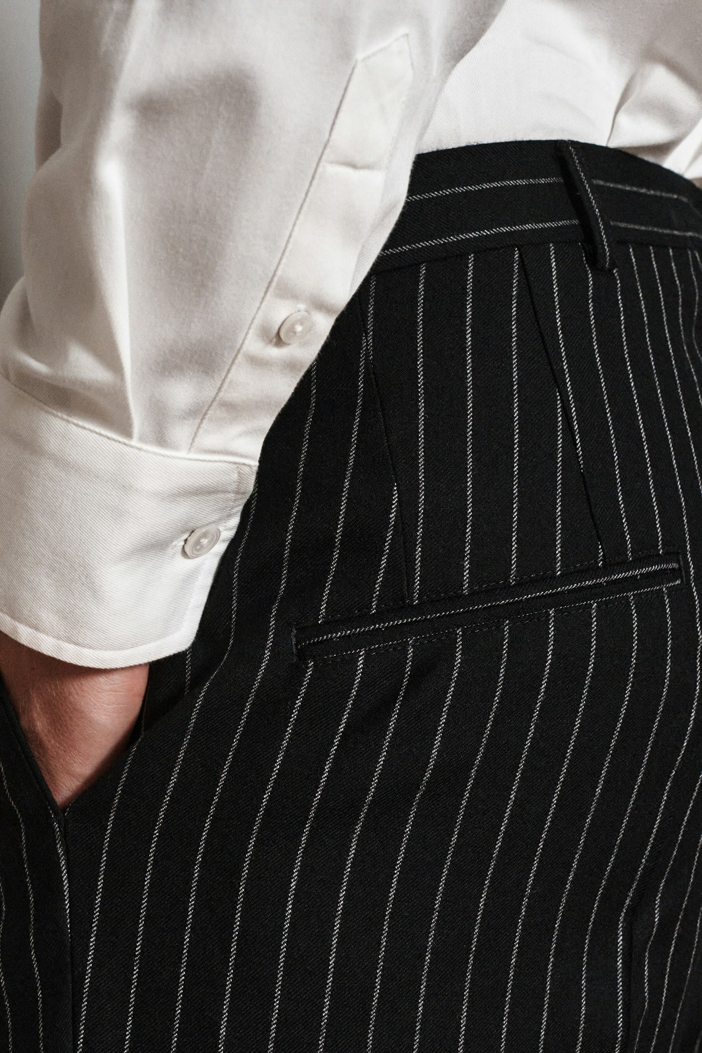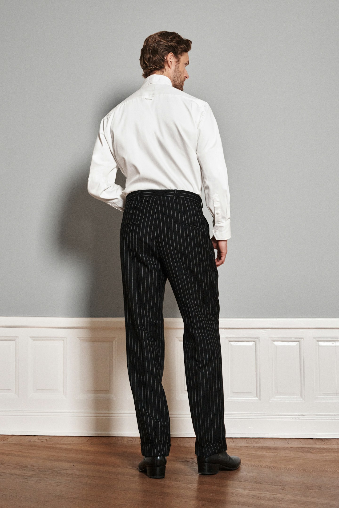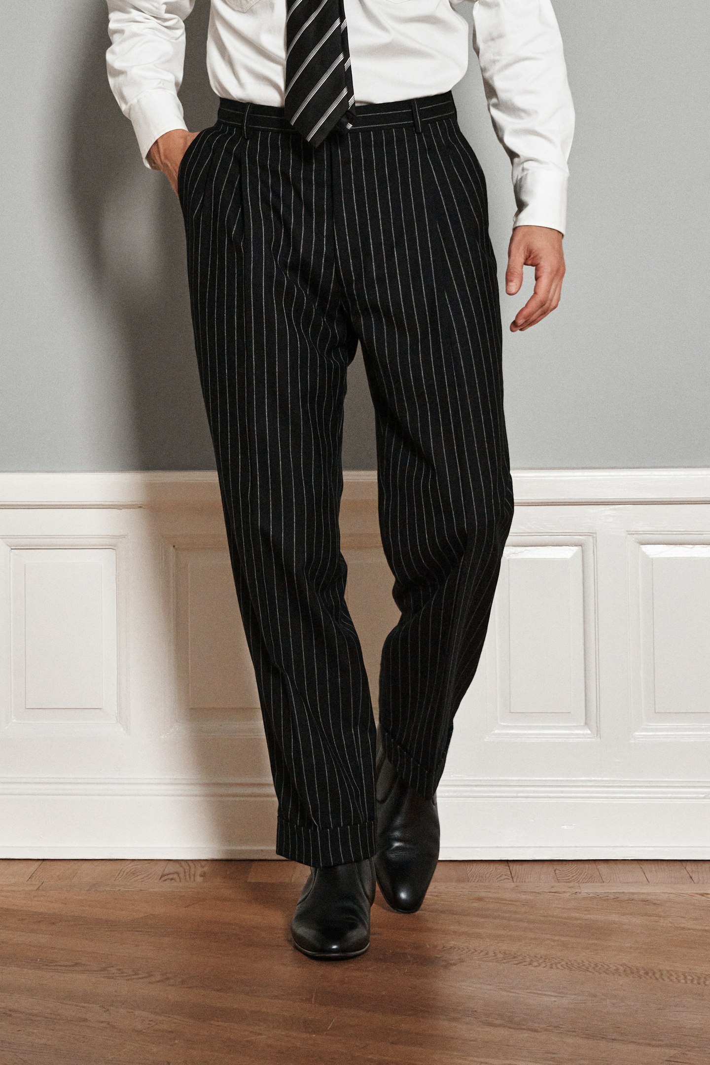 Dette produktet er en del av Oscar Jacobsons Legacy-kolleksjon, som har utspring i klassisk herremote og vår rike historie. Vi har hentet inspirasjon fra modeller i vårt omfattende arkiv og skapt moderne versjoner av eldre plagg, der vi kombinerer moderne stoffer og tekniske løsninger met et historisk utrykk. Bukser laget i en krittrandet ullkvalitet fra det tradisjonsrike britiske veveriet Alfred Brown. Passformen, med doble frontlegg, vide ben og en høyere livplassering, er inspirert av klassiske buksemodeller fra vårt arkiv, men er omformet med moderne proporsjoner og presise detaljer for en oppdatert silhuett. Et plagg som forener tradisjonelt mønster med moderne design.