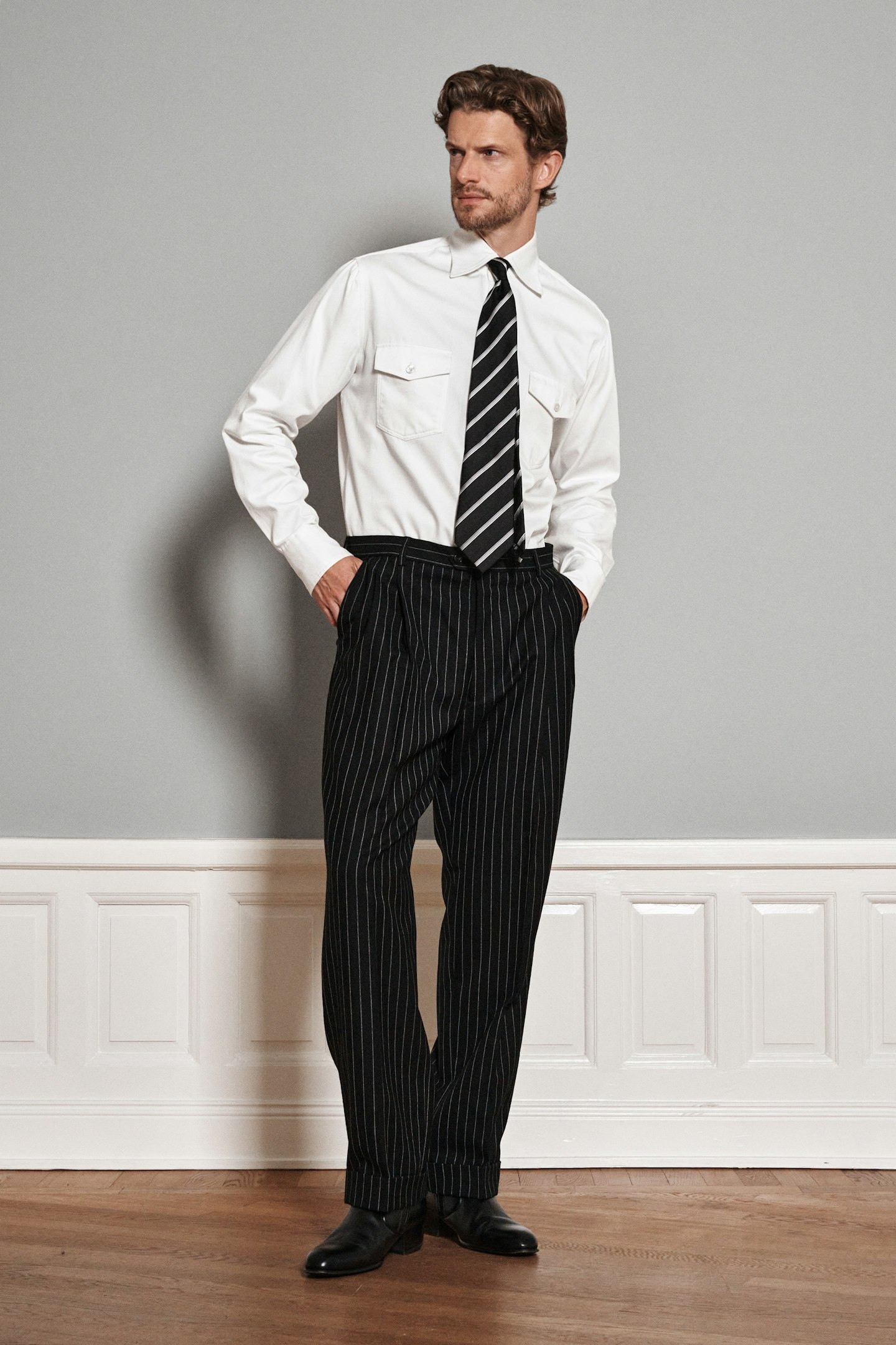 Dette produktet er en del av Oscar Jacobsons Legacy-kolleksjon, som har utspring i klassisk herremote og vår rike historie. Vi har hentet inspirasjon fra modeller i vårt omfattende arkiv og skapt moderne versjoner av eldre plagg, der vi kombinerer moderne stoffer og tekniske løsninger met et historisk utrykk. Bukser laget i en krittrandet ullkvalitet fra det tradisjonsrike britiske veveriet Alfred Brown. Passformen, med doble frontlegg, vide ben og en høyere livplassering, er inspirert av klassiske buksemodeller fra vårt arkiv, men er omformet med moderne proporsjoner og presise detaljer for en oppdatert silhuett. Et plagg som forener tradisjonelt mønster med moderne design.