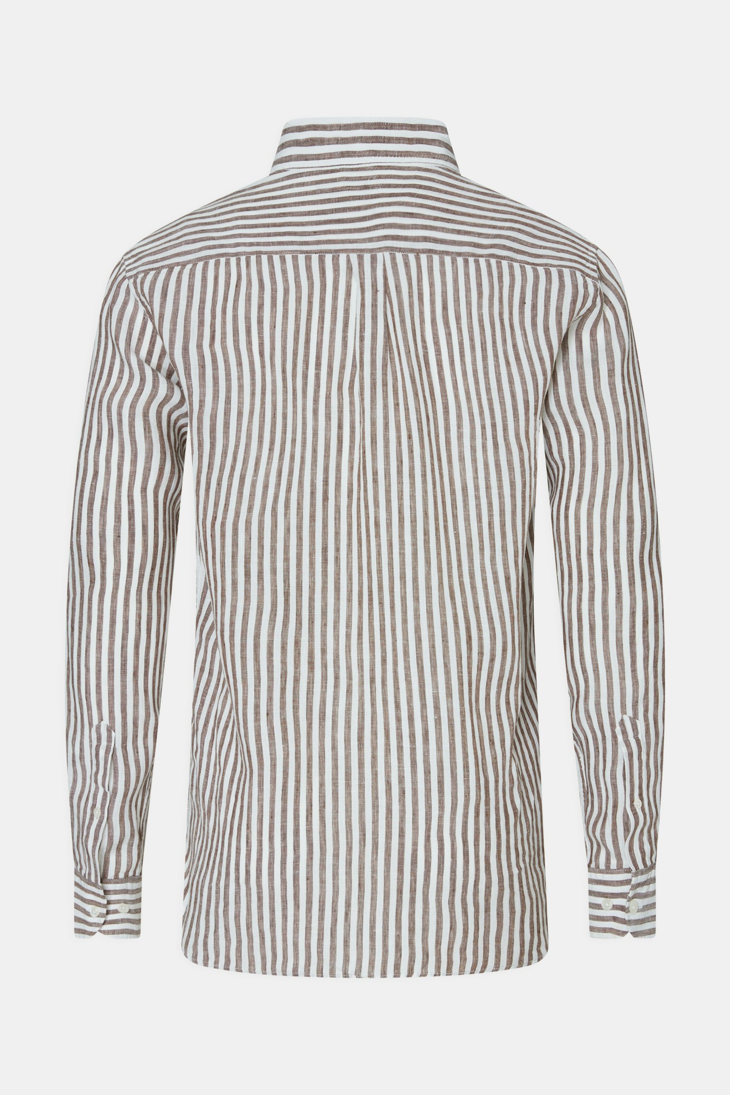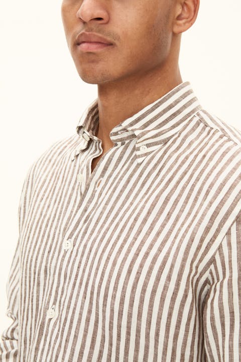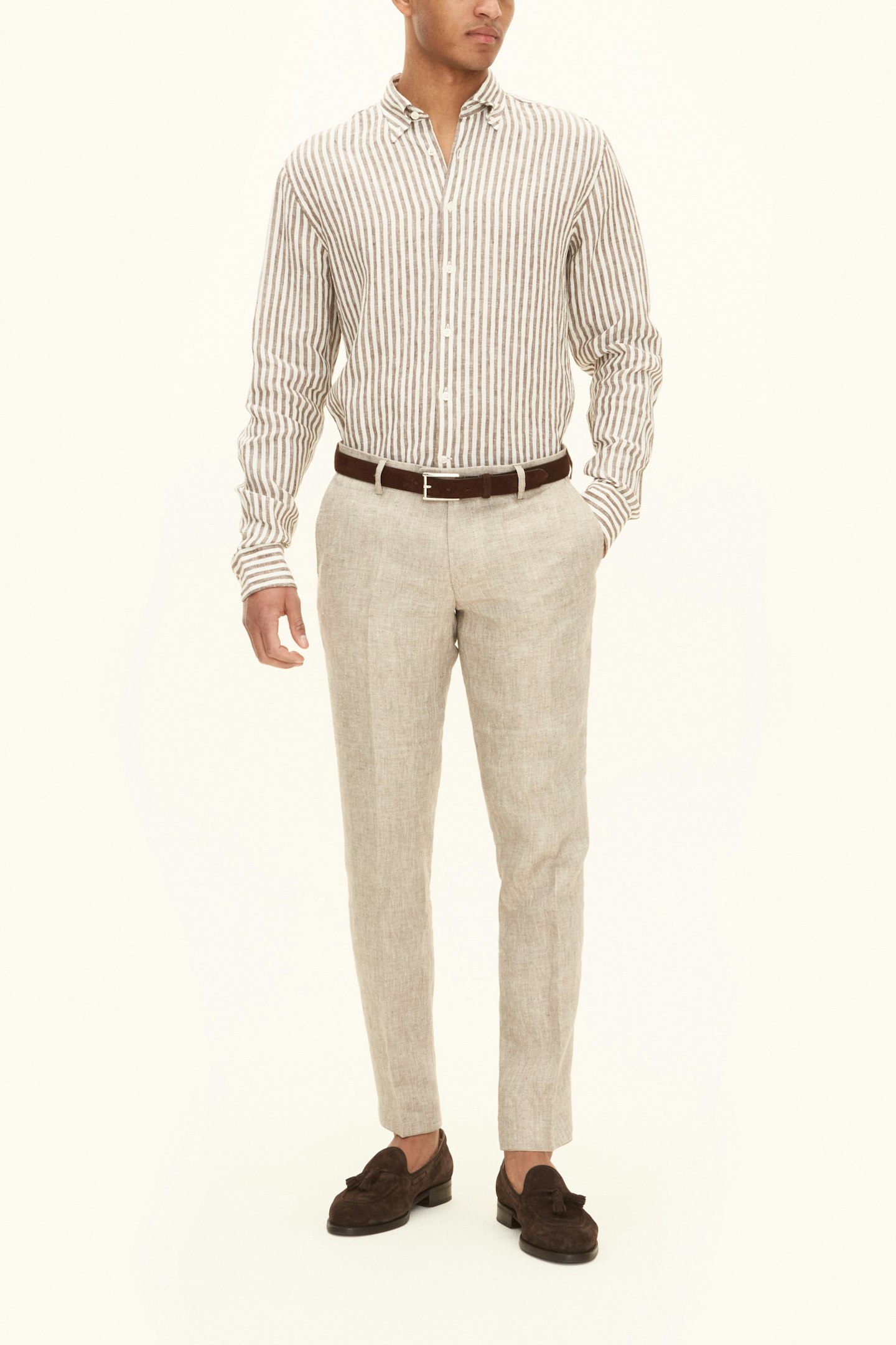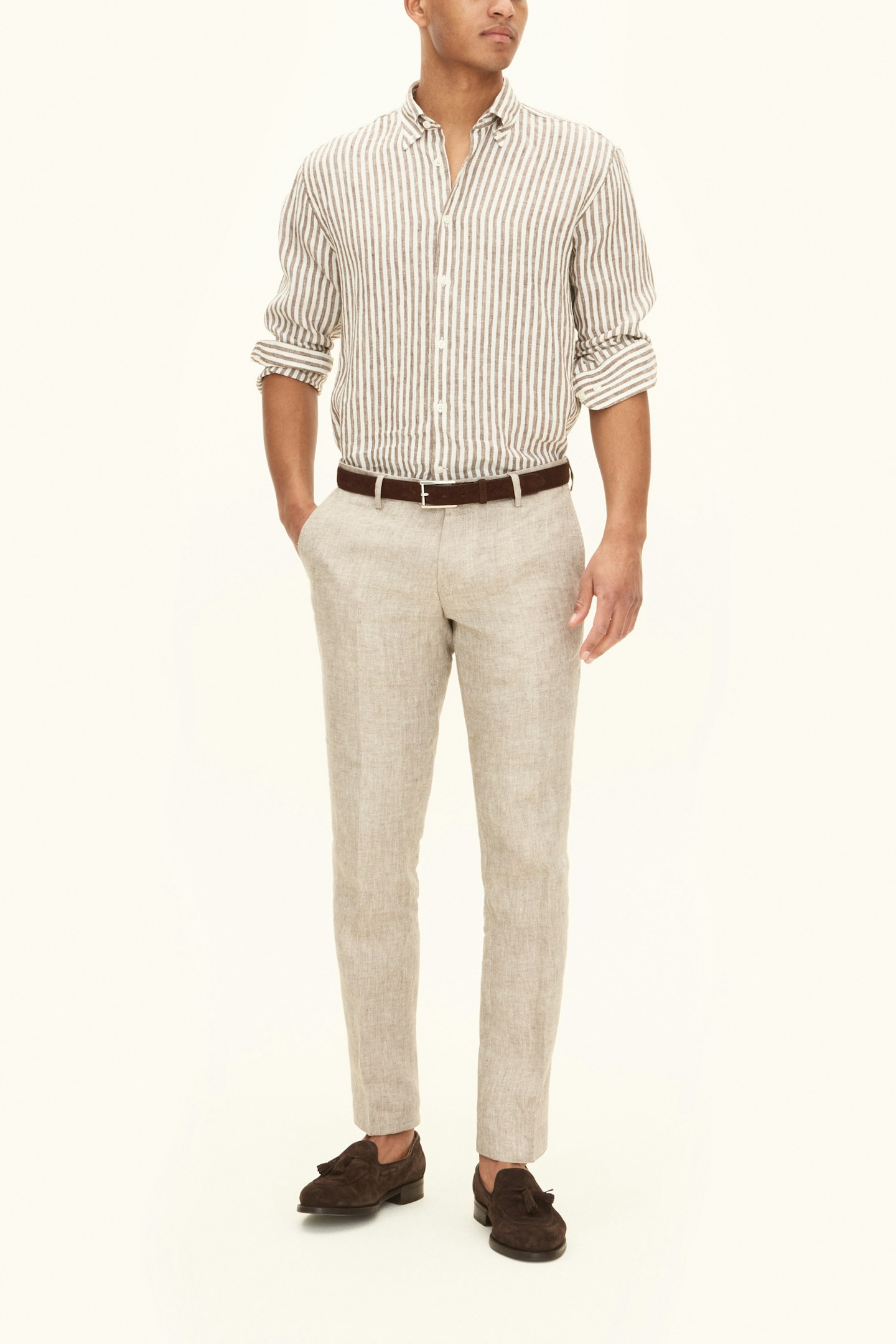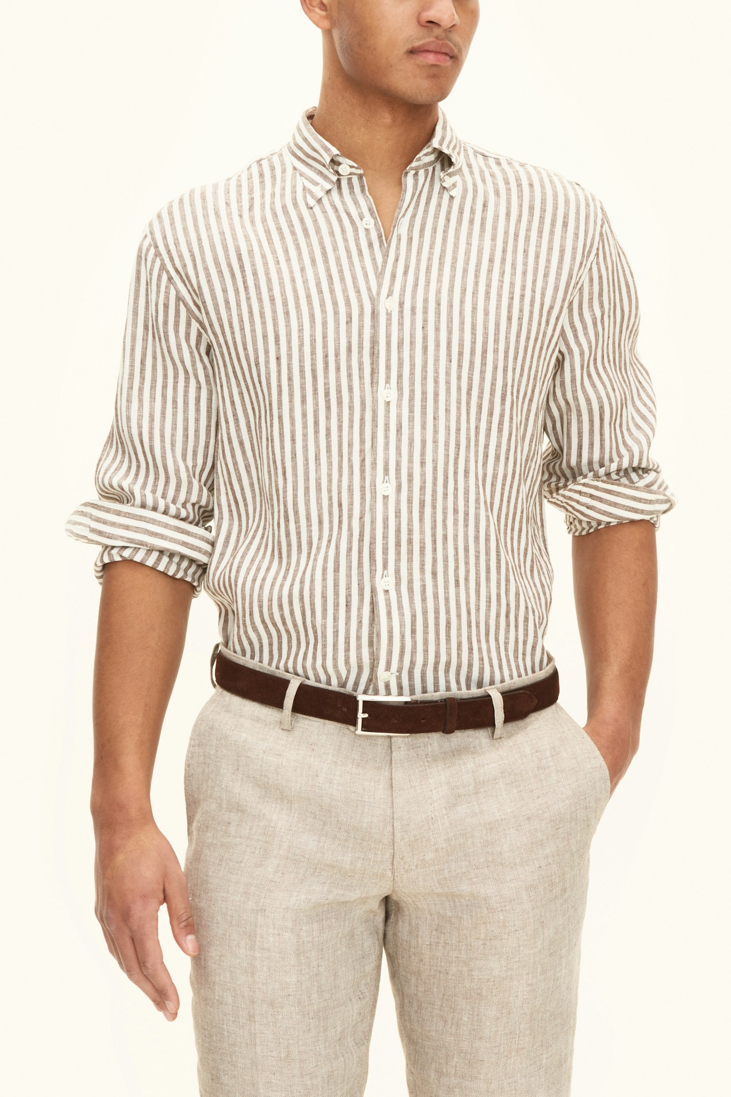 Vår stripete linskjorte i regular fit er et stilig valg for enhver anledning. Den har en button down-krage og en enkelt brystlomme. Skjorten er laget av 100% lin og har et stripemønster. Perfekt for et polert utseende.