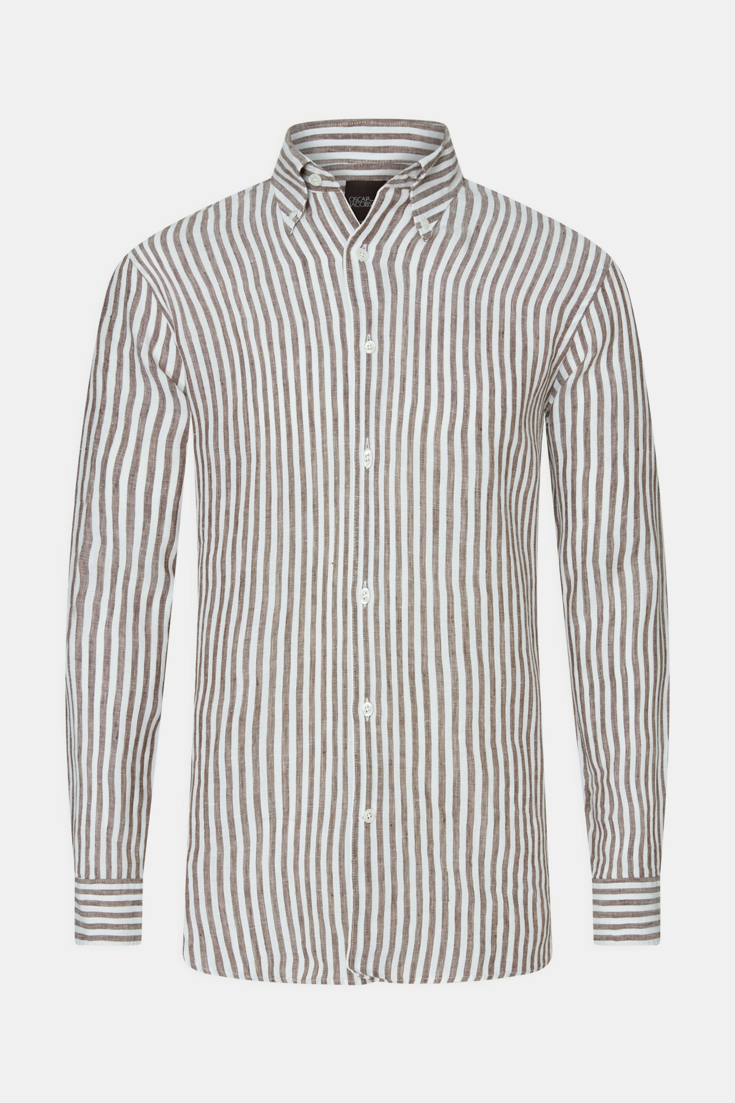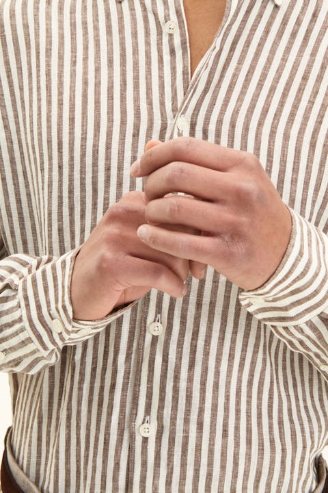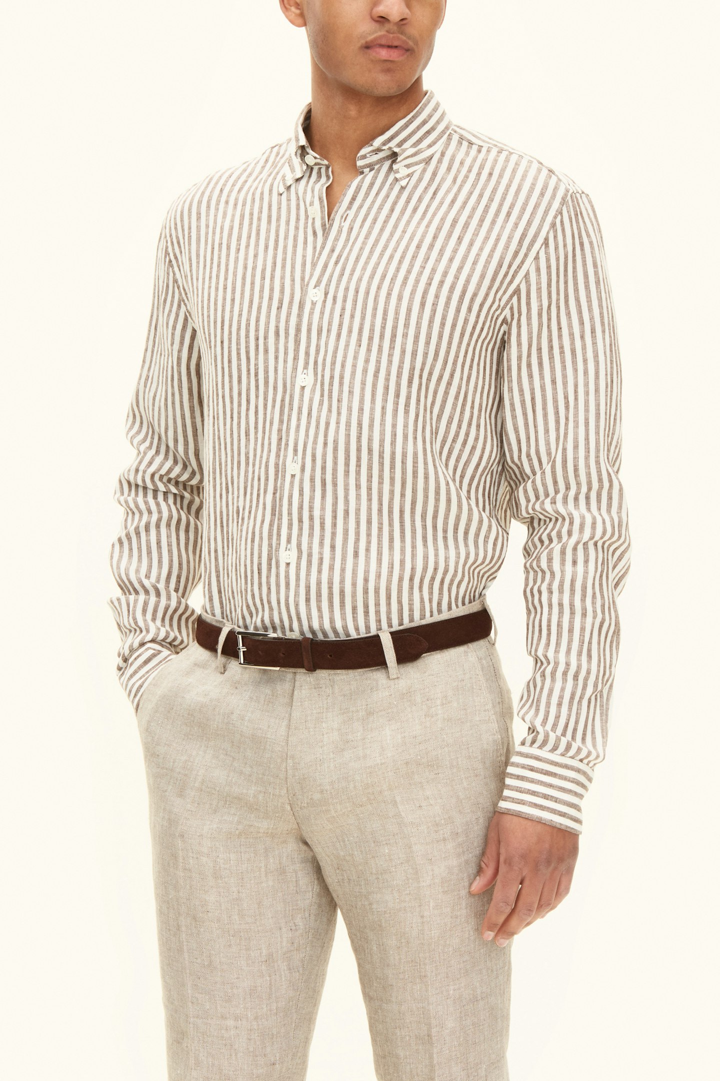 Vår stripete linskjorte i regular fit er et stilig valg for enhver anledning. Den har en button down-krage og en enkelt brystlomme. Skjorten er laget av 100% lin og har et stripemønster. Perfekt for et polert utseende.