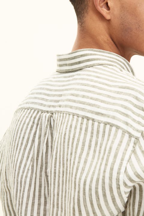 Vår stripete linskjorte i regular fit er et stilig valg for enhver anledning. Den har en button down-krage og en enkelt brystlomme. Skjorten er laget av 100% lin og har et stripemønster. Perfekt for et polert utseende.
