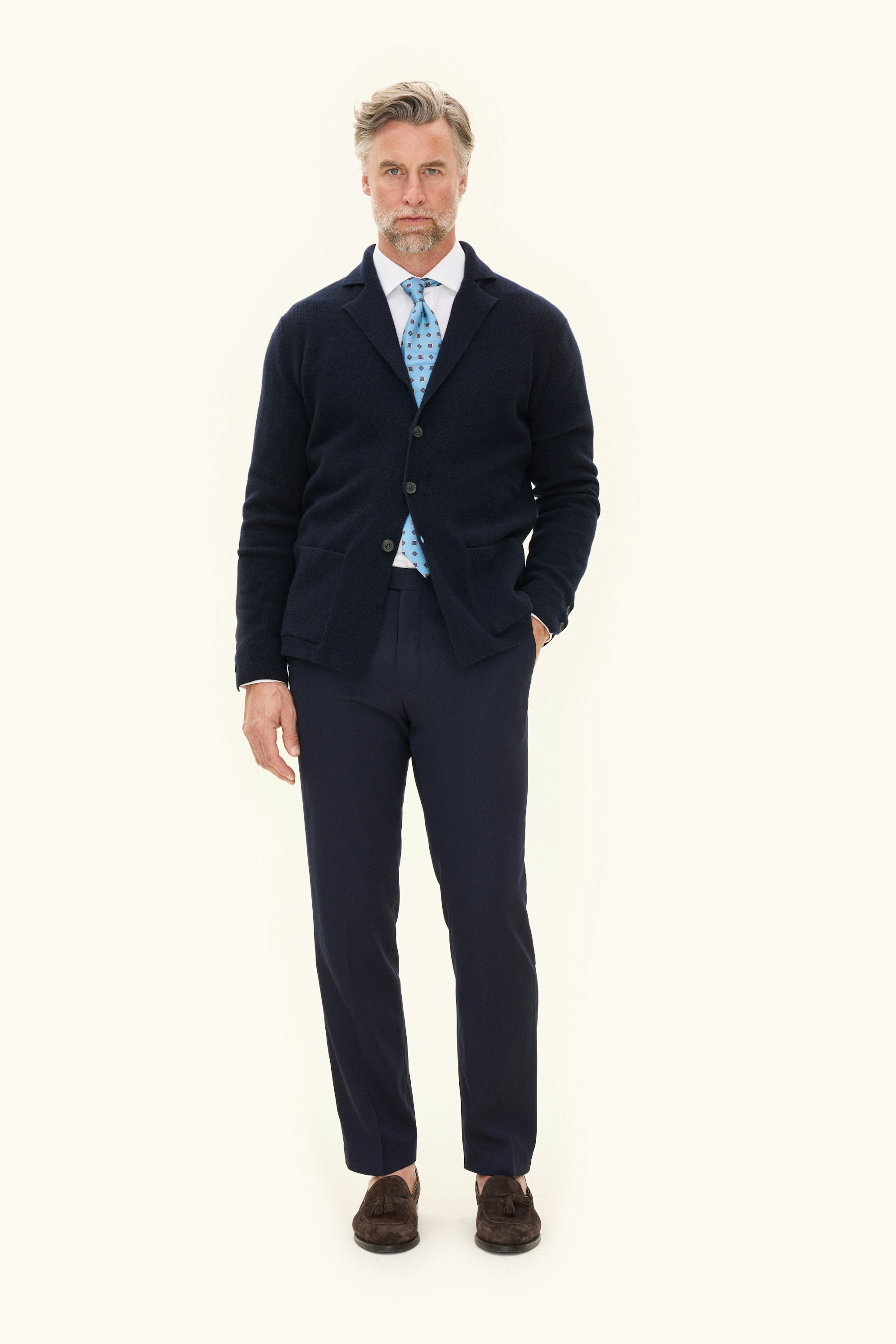 En strikket blazer i klassisk modell med utvendige lommer og 3 brune knapper foran. Strikket i 7gg med såkalt 'english rib', som gir en tydelig ribbeeffekt og en deilig tyngde i plagget. Samme komfortable passform og følelse som en strikket genser, men med et elegant uttrykk som gjør plagget perfekt til mange anledninger. Kan brukes utendørs på kjølige sommerkvelder og innendørs om høst og vinter.