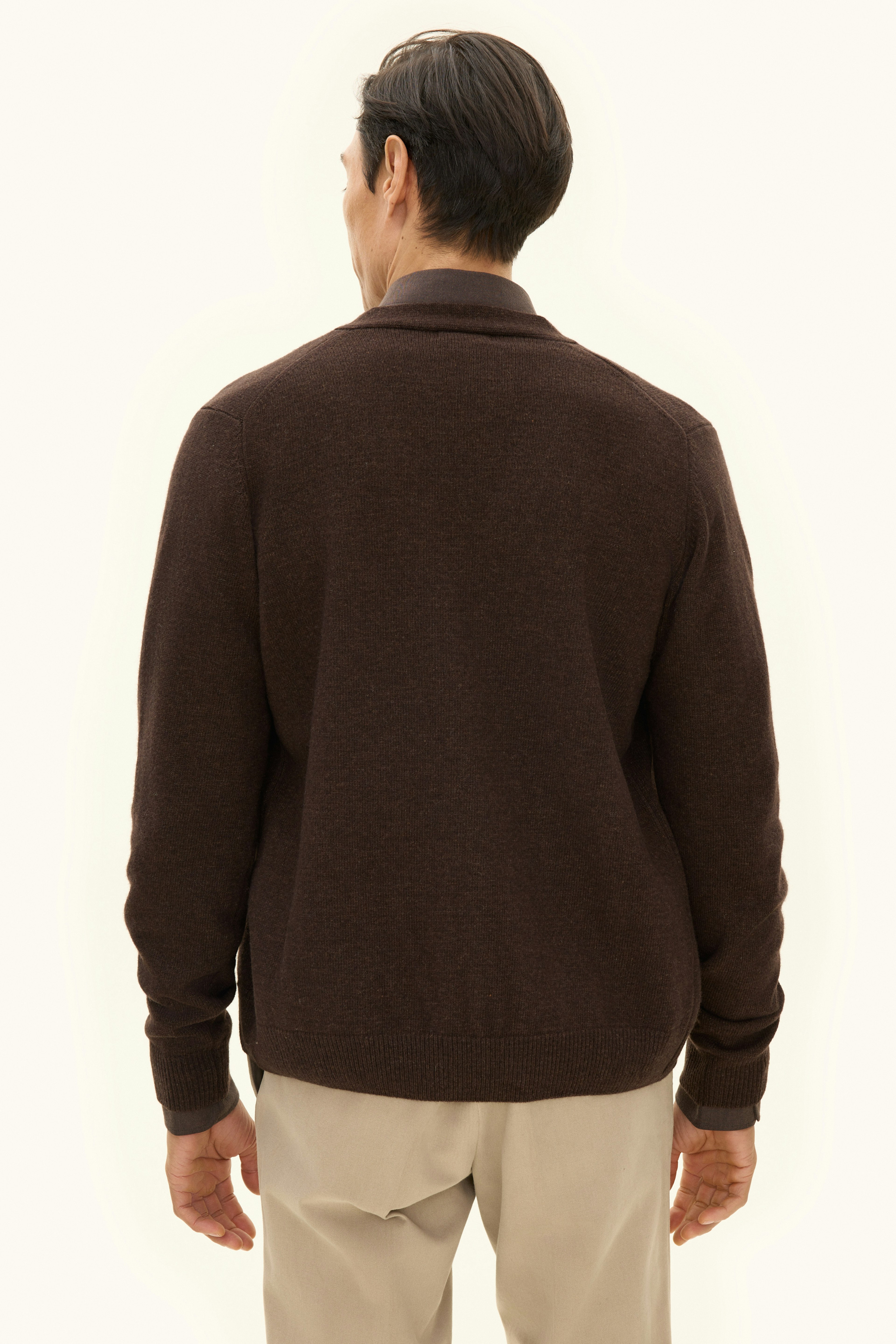 Klassisk cardiganmodell med brune knapper foran. Tradisjonell 1x1-ribb på både ermavslutning og nederkant. Passformen er regular fit, noe som gjør den perfekt å bruke både over skjorte og t-skjorte. Strikket i 7gg i en myk og fin blanding av lammeull.