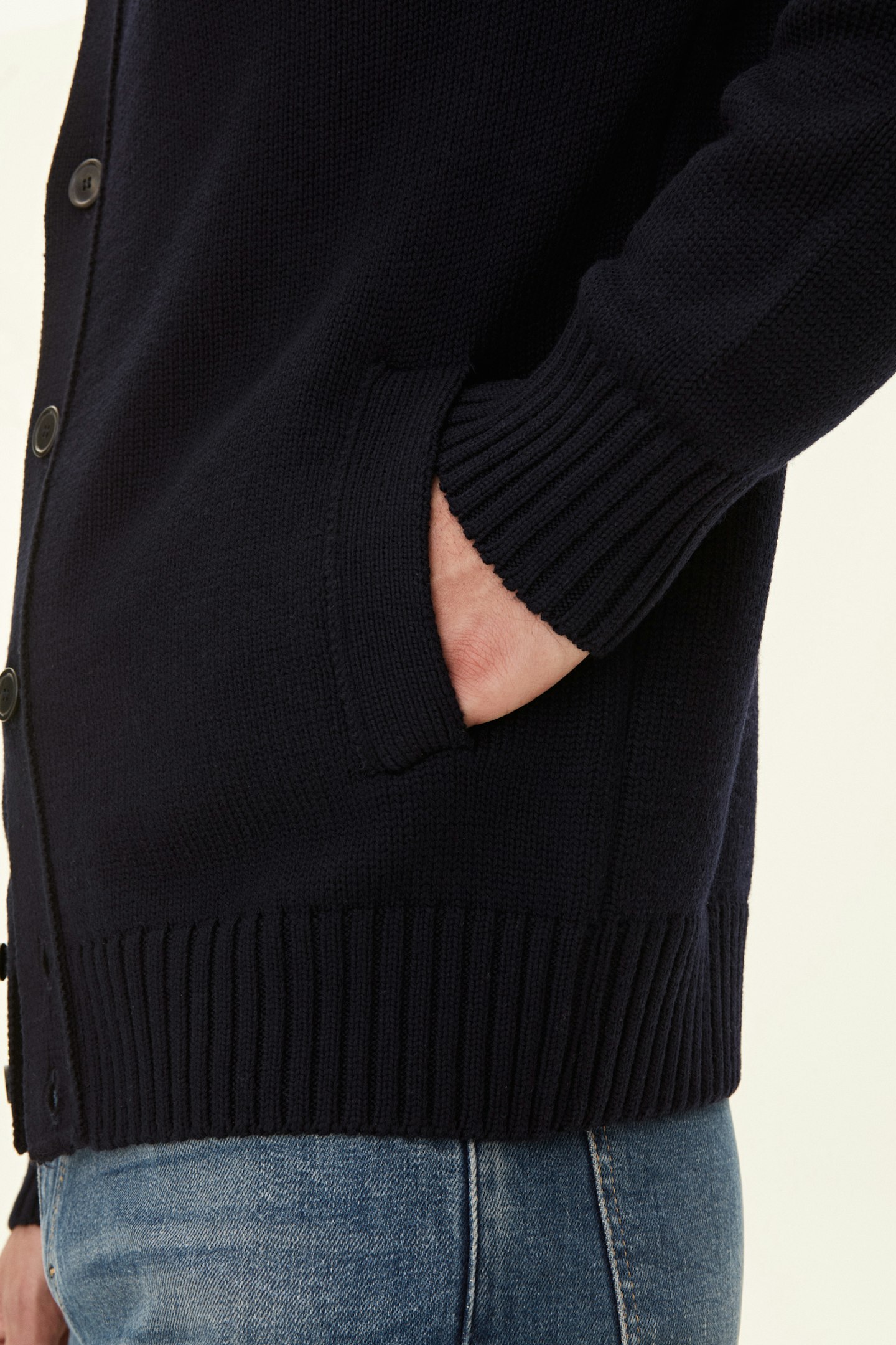 Rustikk cardigan i ekstra fin merinoull fra Lanerossi, Italia. Grovstrikket i 5gg med knapper foran og praktiske lommer. Perfekt for både innendørs og utendørs bruk tidlig på høsten eller våren.