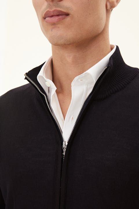 Klassisk cardigan i ekstra fin merinoull fra Tollegno, Italia. De lange ullfibrene gir plagget en luksuriøs og lett blank overflate. Strikket i 12gg, gjør den perfekt til å ha over en t-skjorte eller skjorte, eller under en jakke.