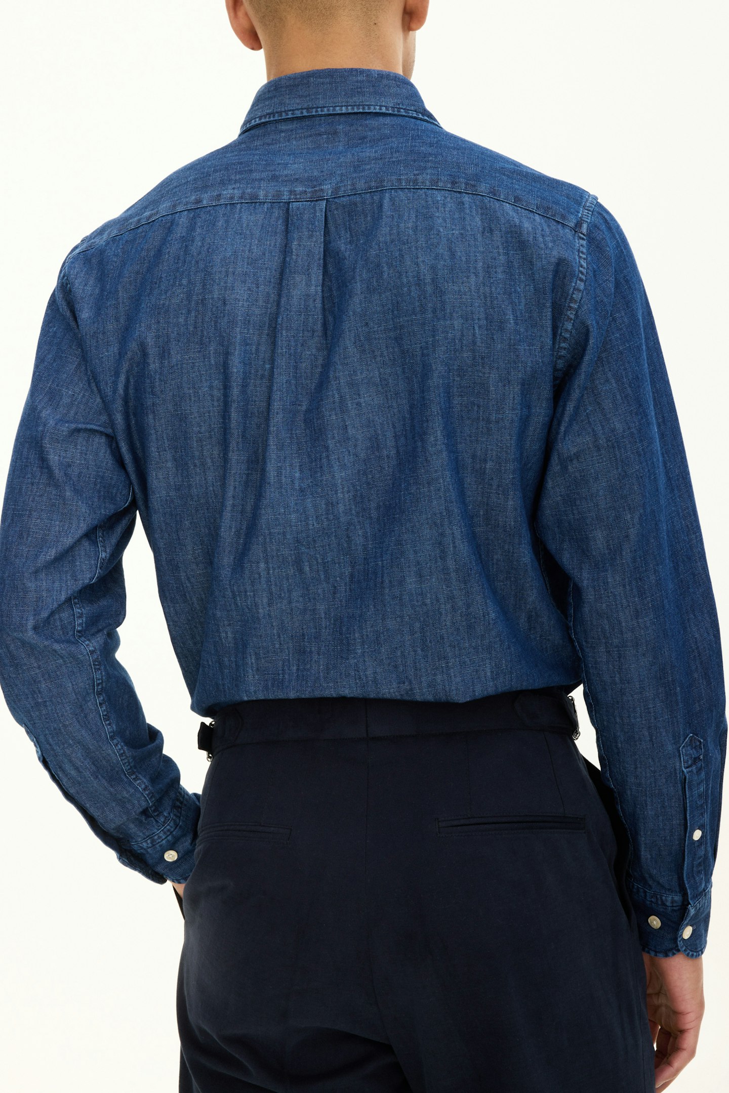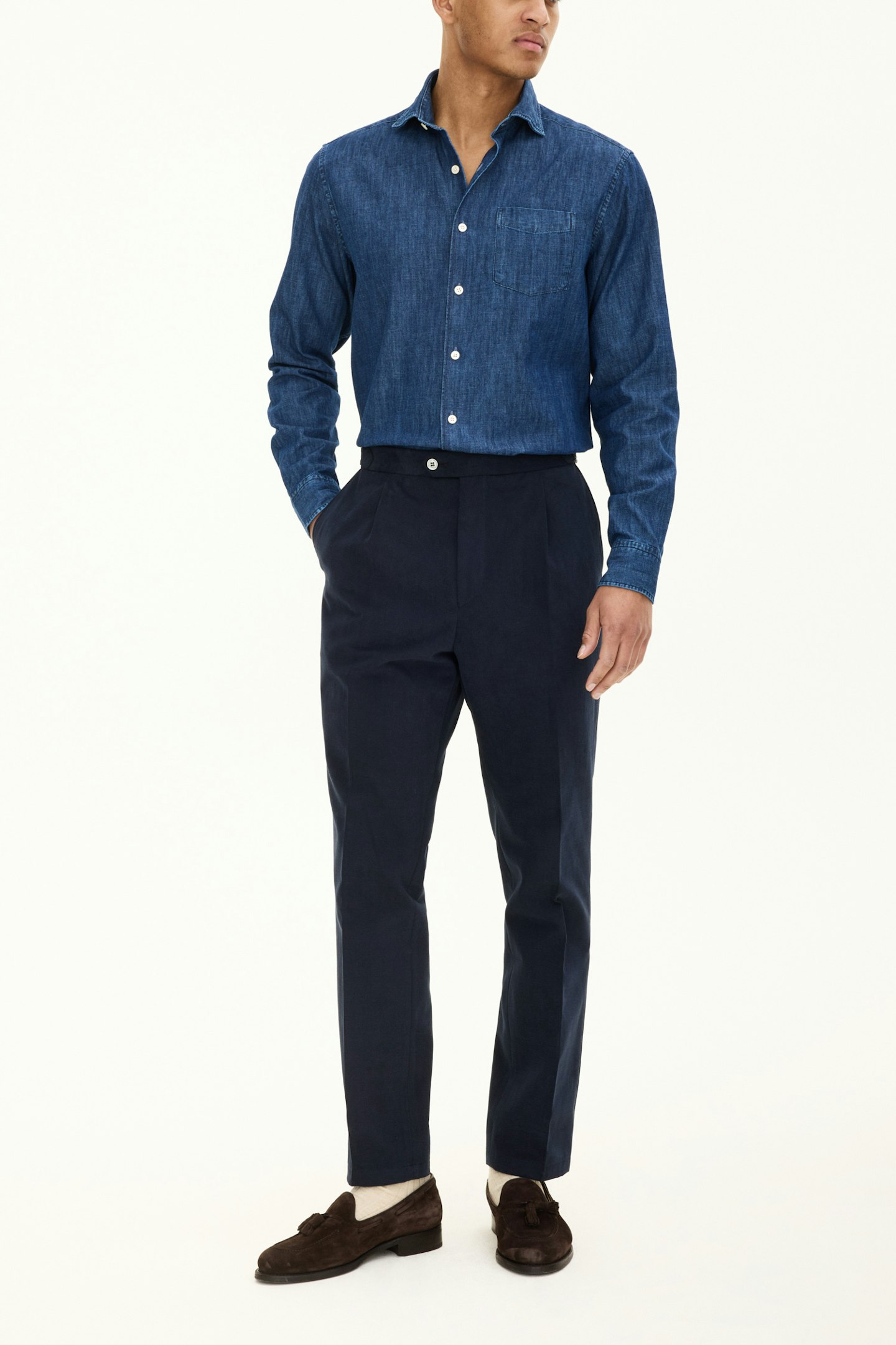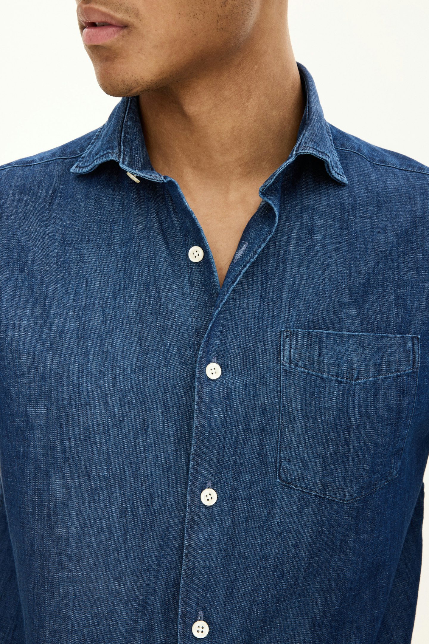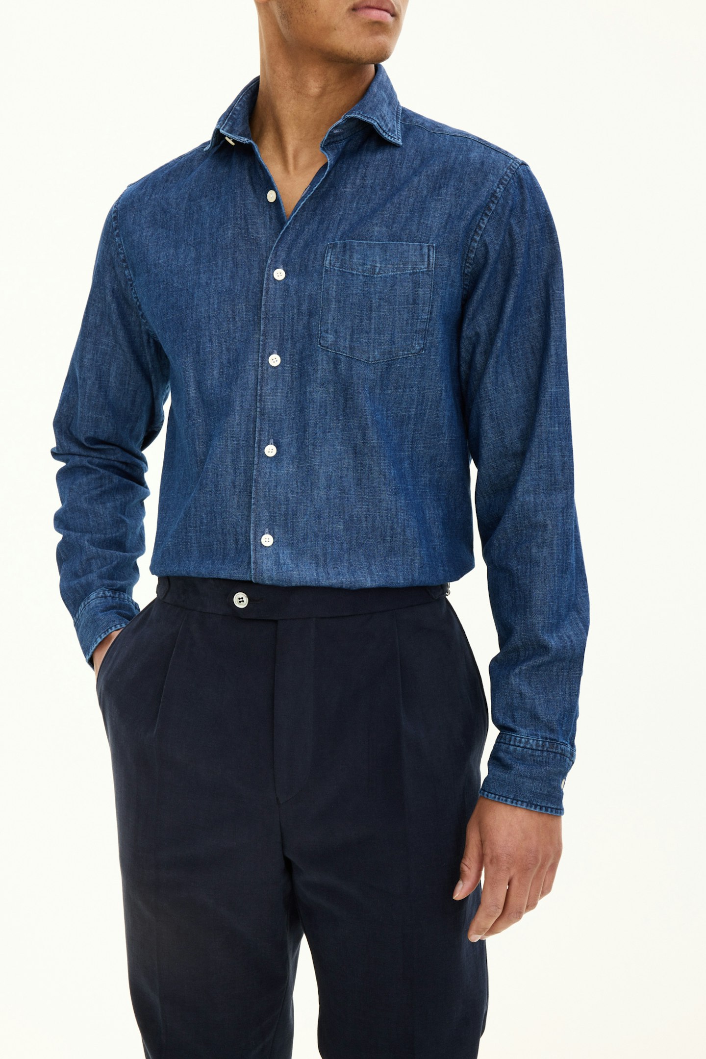 Vår regular fit Denim skjorte er et allsidig plagg som kan dresses opp eller ned. Laget av 100% bomullsdenim, har den en cut away-krage og en enkelt brystlomme. Det ensfargede vevde stoffet legger til en touch av sofistikasjon til dette klassiske designet.