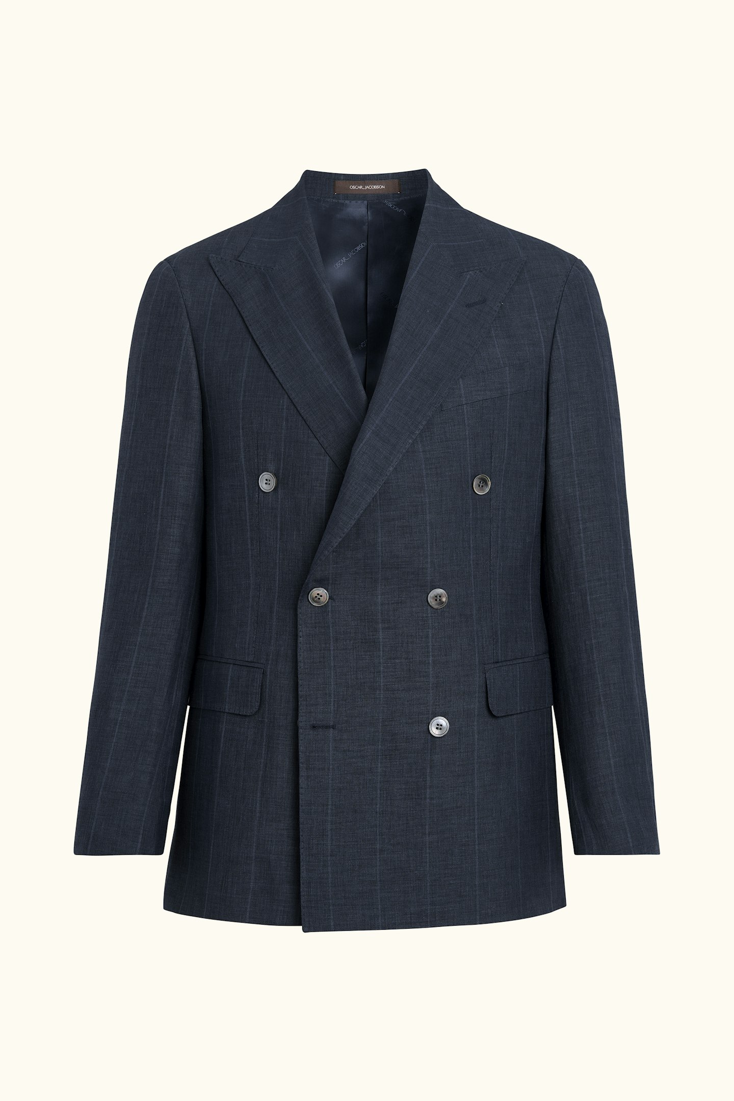 Blazer Richard er dobbelkneppet og utformet som del av en dress. Stoffet fra Lanificio Zegna er vevd i en twillstruktur med subtil stripe, hvor ull, lin og silke samarbeider for å gi stabilitet, tekstur og en lett glans. Silhuetten er balansert med noe bredere skuldre og spisse slag. Konstruksjonen er bygget med fokus på fall og proporsjoner, med detaljer som understøtter modellens form og føyelighet