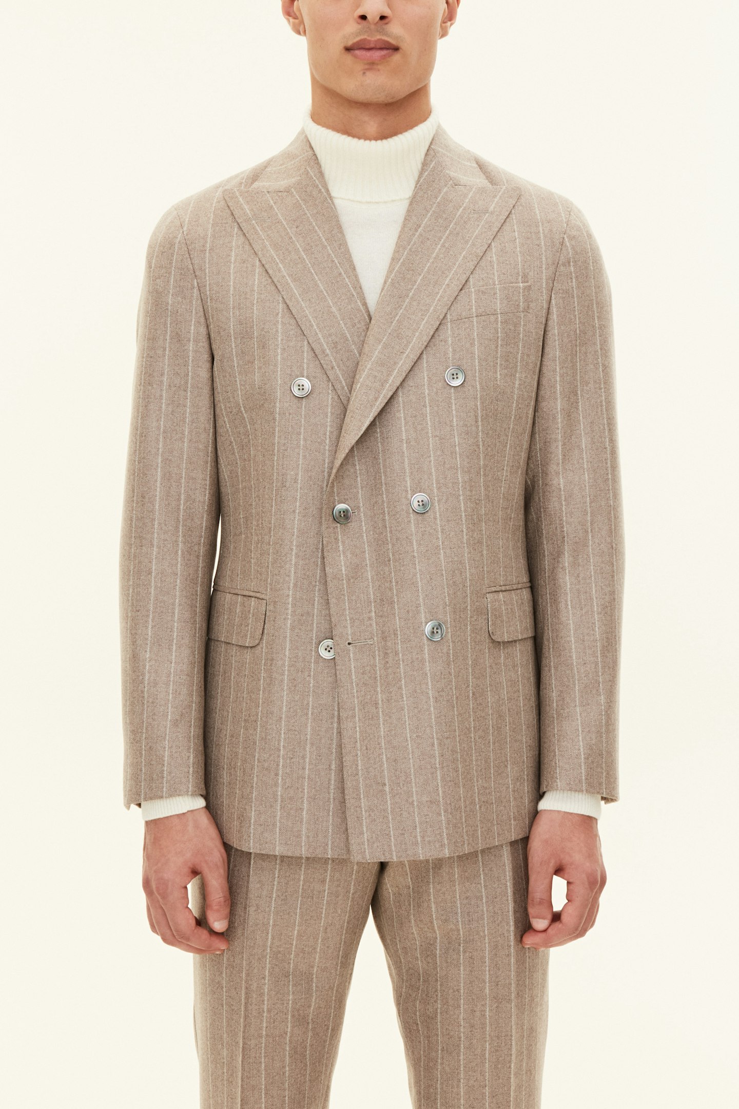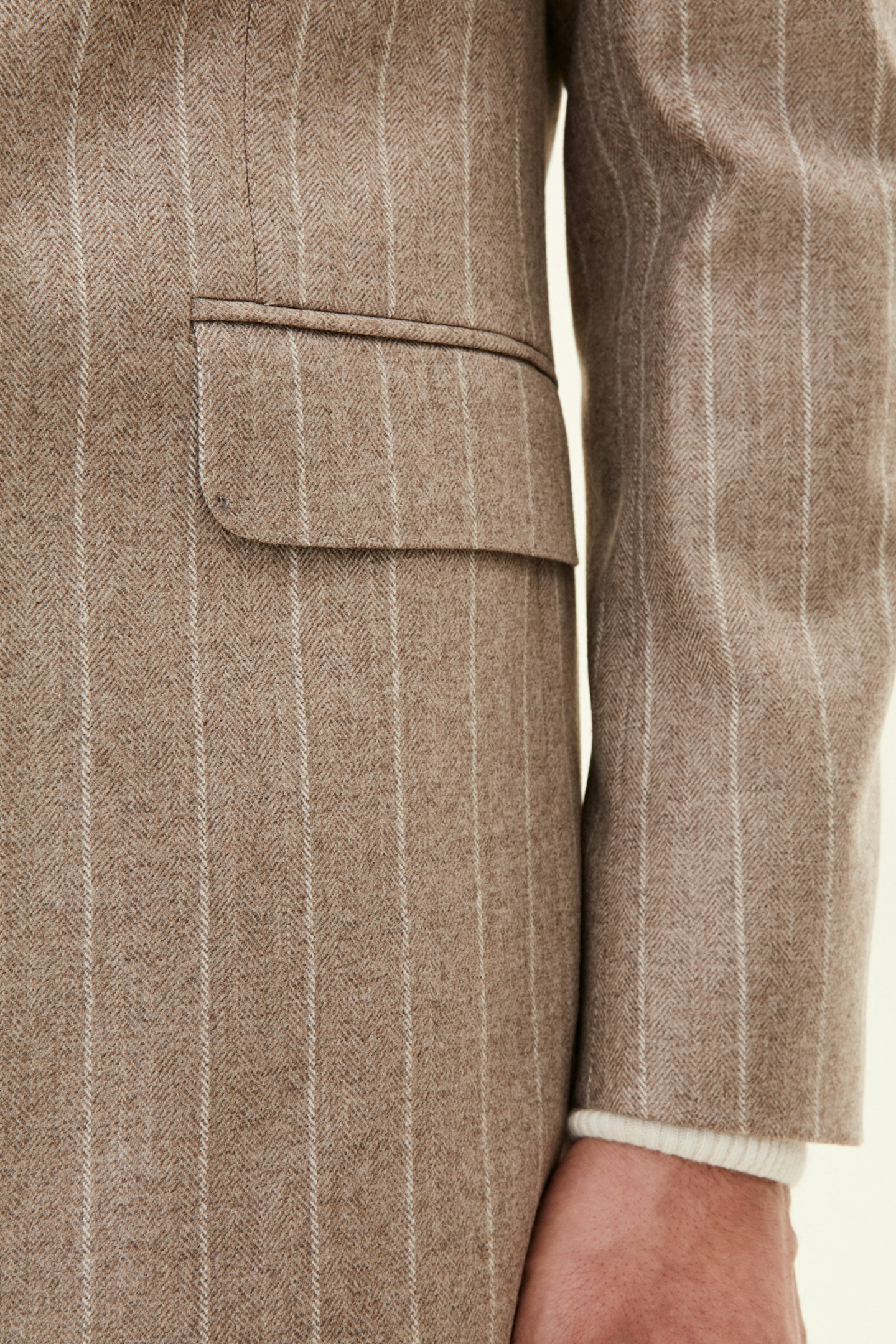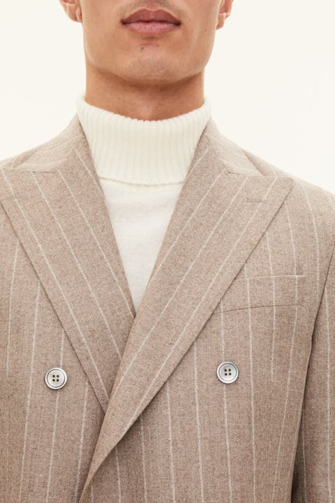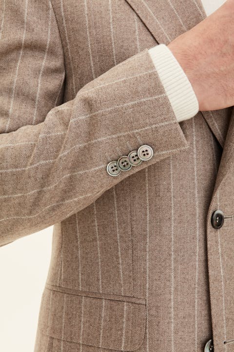 Farris-blazeren er en dobbeltspent modell med spisse jakkeslag og klafflommer, laget i et lyst beige stoff med klassisk fiskebeinsdesign og benhvite striper. Stoffet består av 100% Superfine Merino Wool "Zelander", som gir eksepsjonell mykhet og slitestyrke. Den glatte og fine fiberstrukturen til Zelander-ullen gir en luksuriøs følelse mot huden, og jakkens helfôrede design gjør den både funksjonell og elegant. Dette tidløse plagget passer for både formelle og uformelle anledninger.