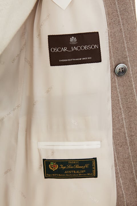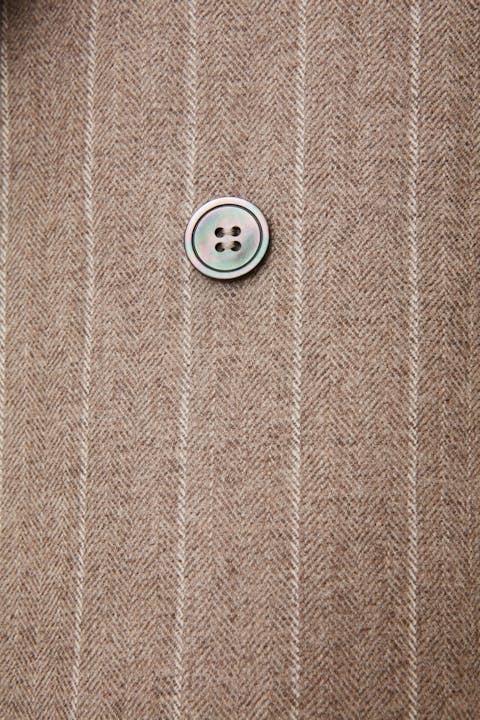 Farris-blazeren er en dobbeltspent modell med spisse jakkeslag og klafflommer, laget i et lyst beige stoff med klassisk fiskebeinsdesign og benhvite striper. Stoffet består av 100% Superfine Merino Wool "Zelander", som gir eksepsjonell mykhet og slitestyrke. Den glatte og fine fiberstrukturen til Zelander-ullen gir en luksuriøs følelse mot huden, og jakkens helfôrede design gjør den både funksjonell og elegant. Dette tidløse plagget passer for både formelle og uformelle anledninger.