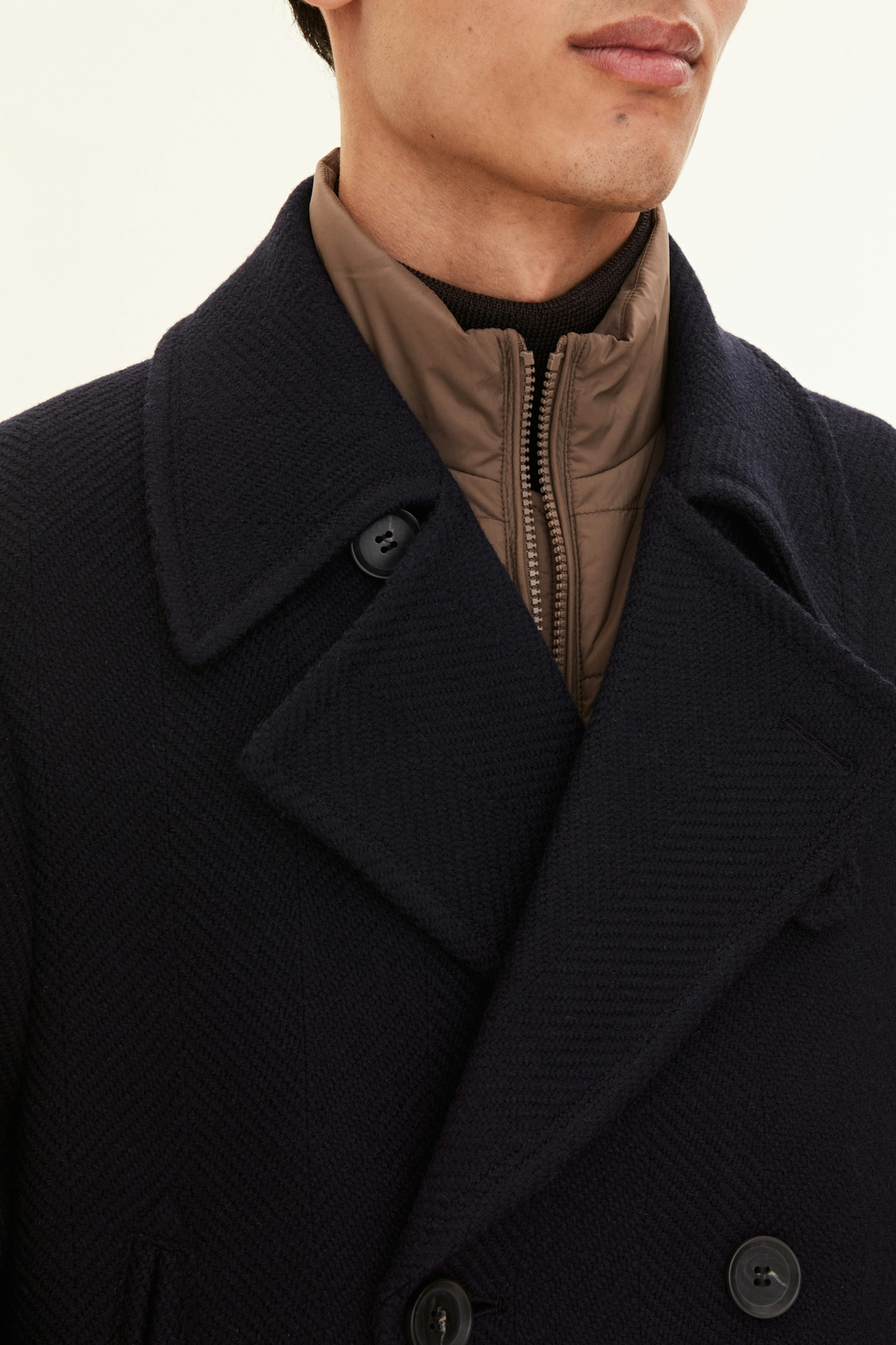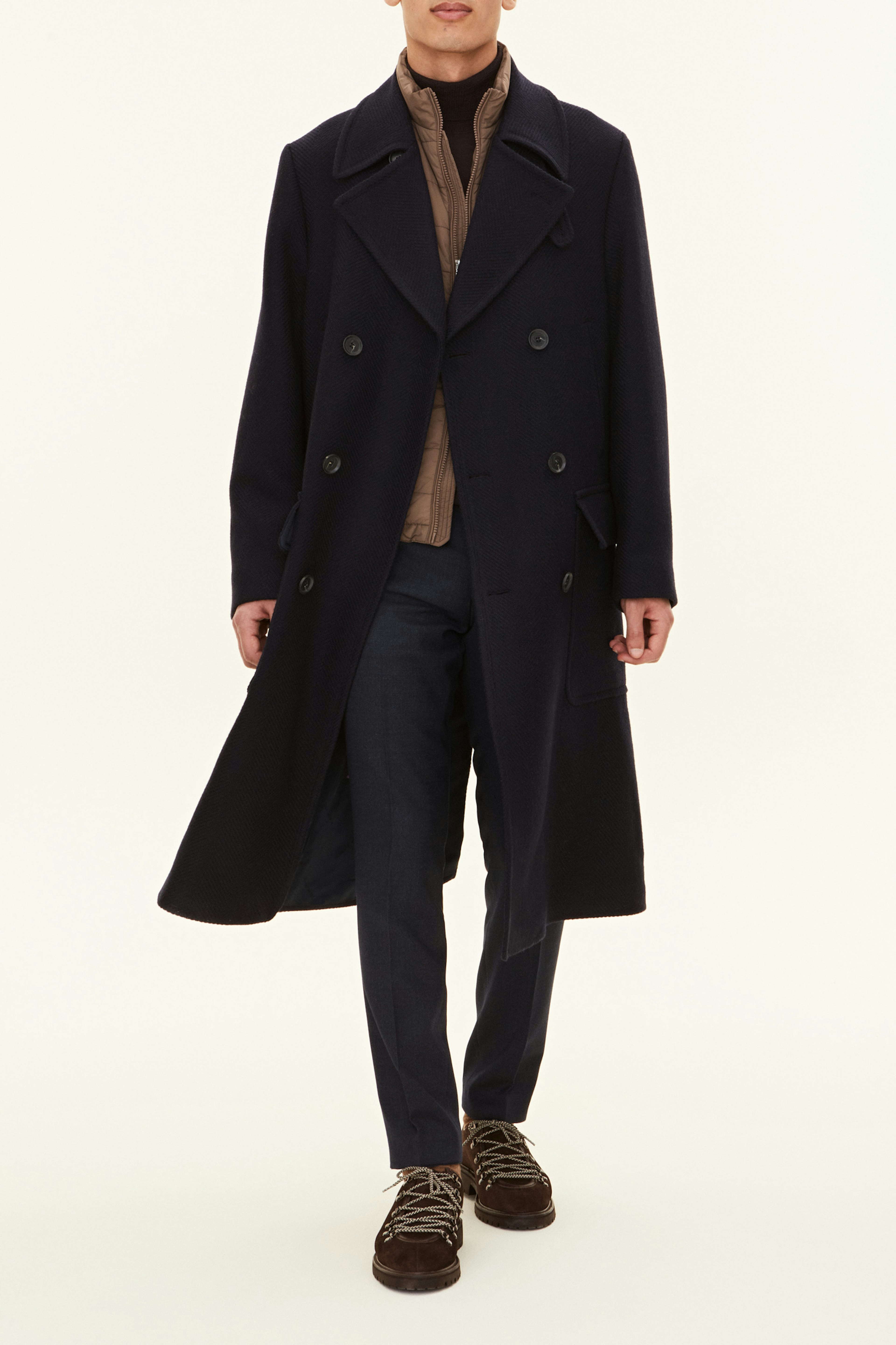 Modellen Piero er en dobbeltspent lang frakk med utenpåsydde lommer, stormklaff og oversized krage. Den er laget av et fiskebeinsmønstret stoff i 100 % virgin ull fra Angelico, som gir et mykt fall og en litt ullen overflate som bidrar til et intellektuelt og moderne utseende. Virgin ull er kjent for sin mykhet og naturlige pusteevne, noe som gjør kåpen egnet for både formelle og uformelle anledninger. Det karakteristiske fiskebeinsmønsteret skaper en klassisk estetikk som aldri går av moten.