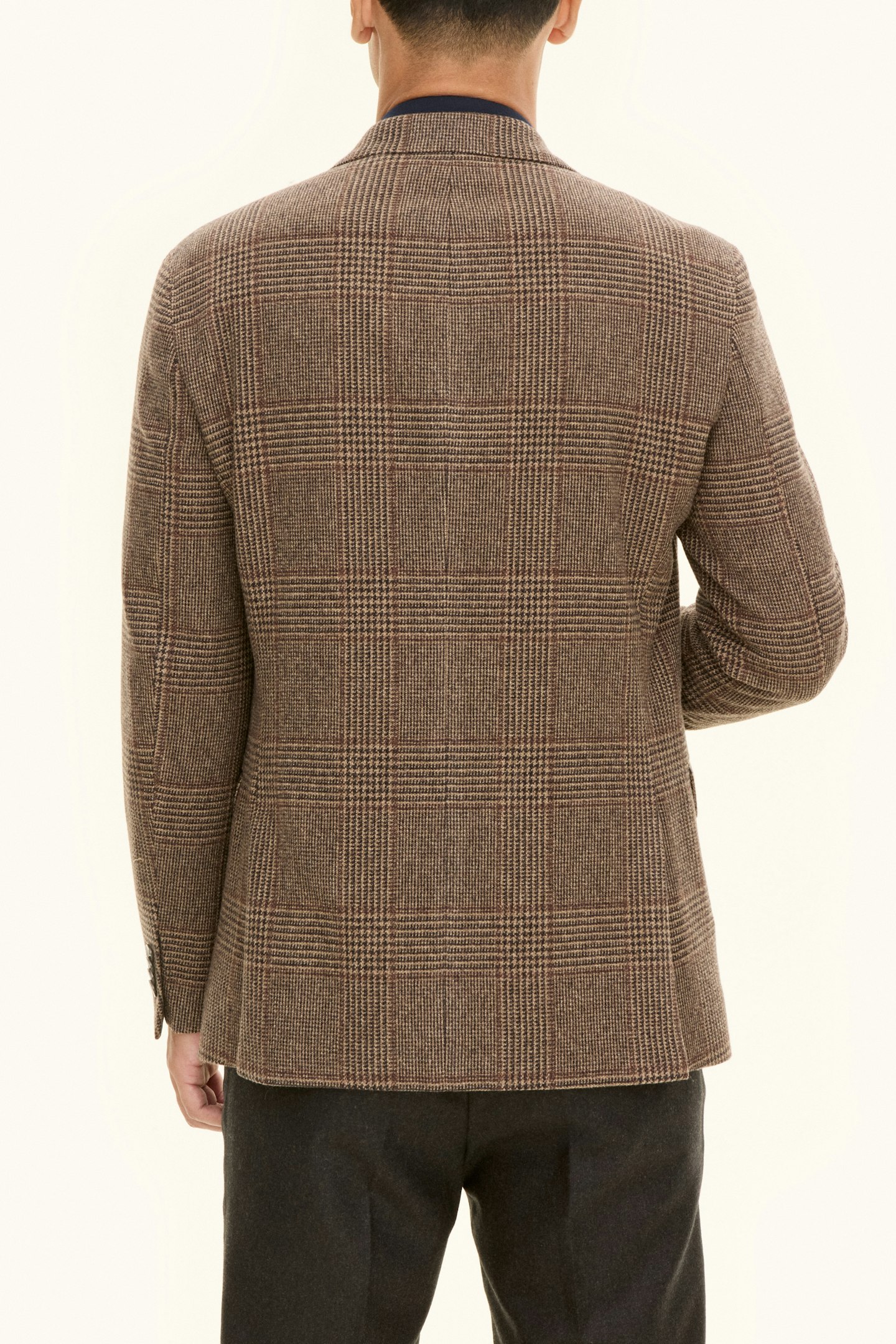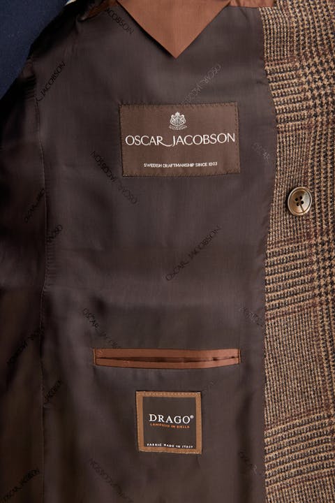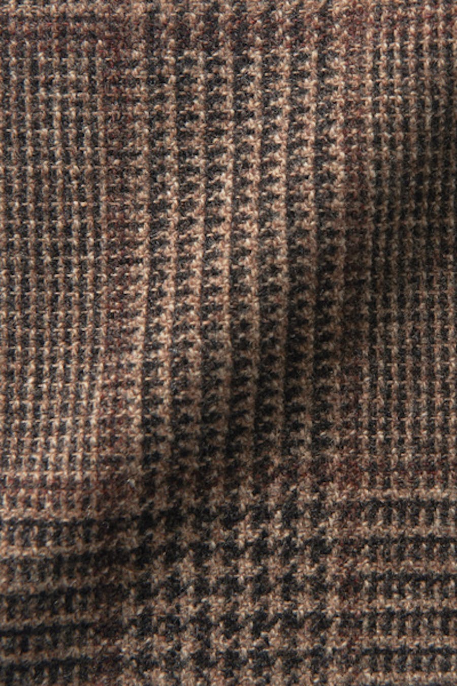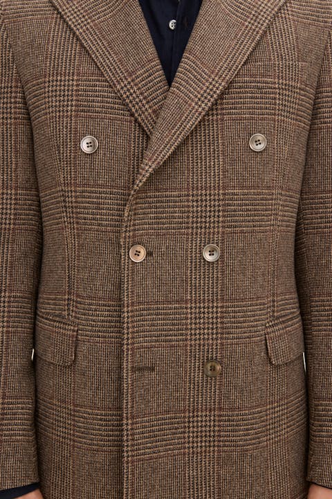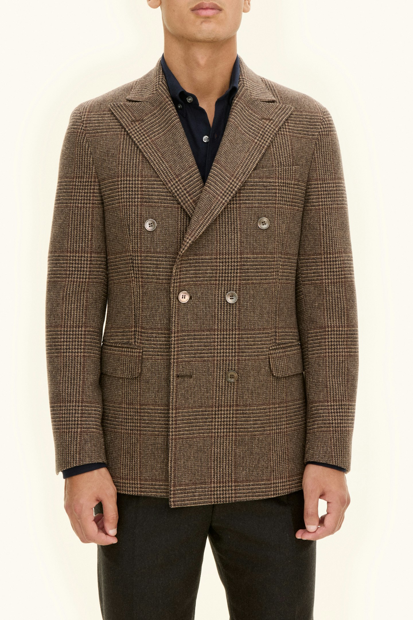 Farris-blazeren er en dobbeltspent modell med spisse jakkeslag, halvfôret for økt bevegelsesfrihet og utstyrt med klafflommer. Laget i en luksuriøs brun Prince of Wales-rute, kombinerer stoffet 95 % virgin ull og 5 % kasjmir for en elegant følelse med subtil glans. Vevd av Drago i Biella, Italia, har dette stoffet en mørk beige base med rødbrune overlegg for en sofistikert estetikk. Det ukonstruerte designet og den nøye utformede konstruksjonen gjør blazeren til et tidløst valg for både formelle og uformelle anledninger.