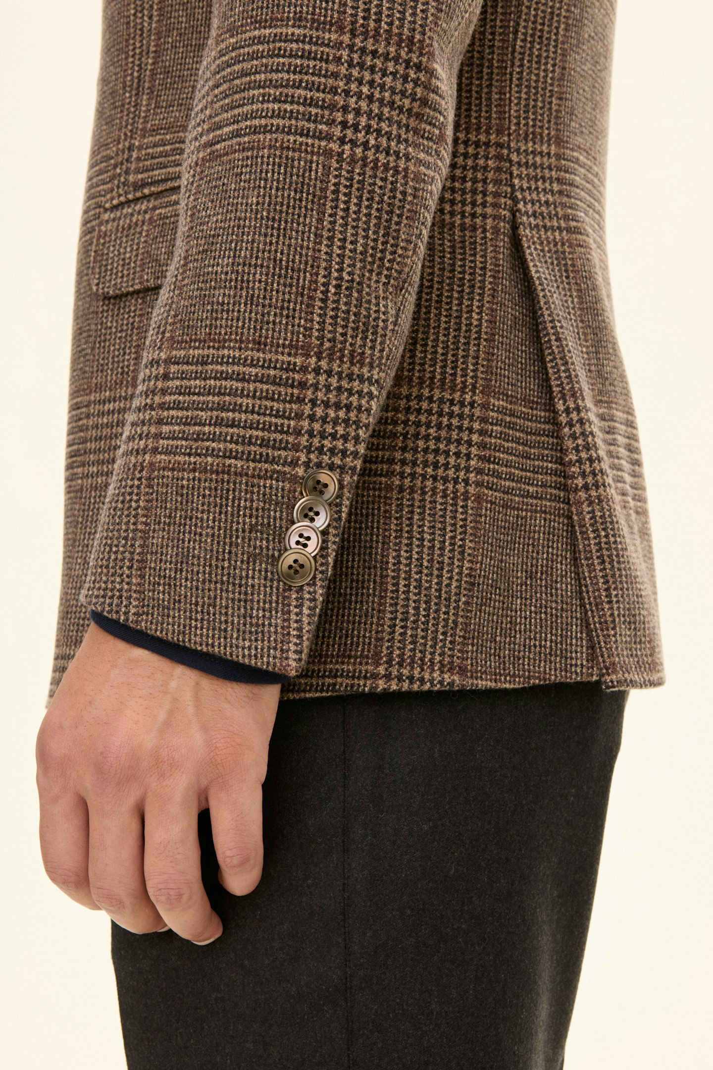 Farris-blazeren er en dobbeltspent modell med spisse jakkeslag, halvfôret for økt bevegelsesfrihet og utstyrt med klafflommer. Laget i en luksuriøs brun Prince of Wales-rute, kombinerer stoffet 95 % virgin ull og 5 % kasjmir for en elegant følelse med subtil glans. Vevd av Drago i Biella, Italia, har dette stoffet en mørk beige base med rødbrune overlegg for en sofistikert estetikk. Det ukonstruerte designet og den nøye utformede konstruksjonen gjør blazeren til et tidløst valg for både formelle og uformelle anledninger.