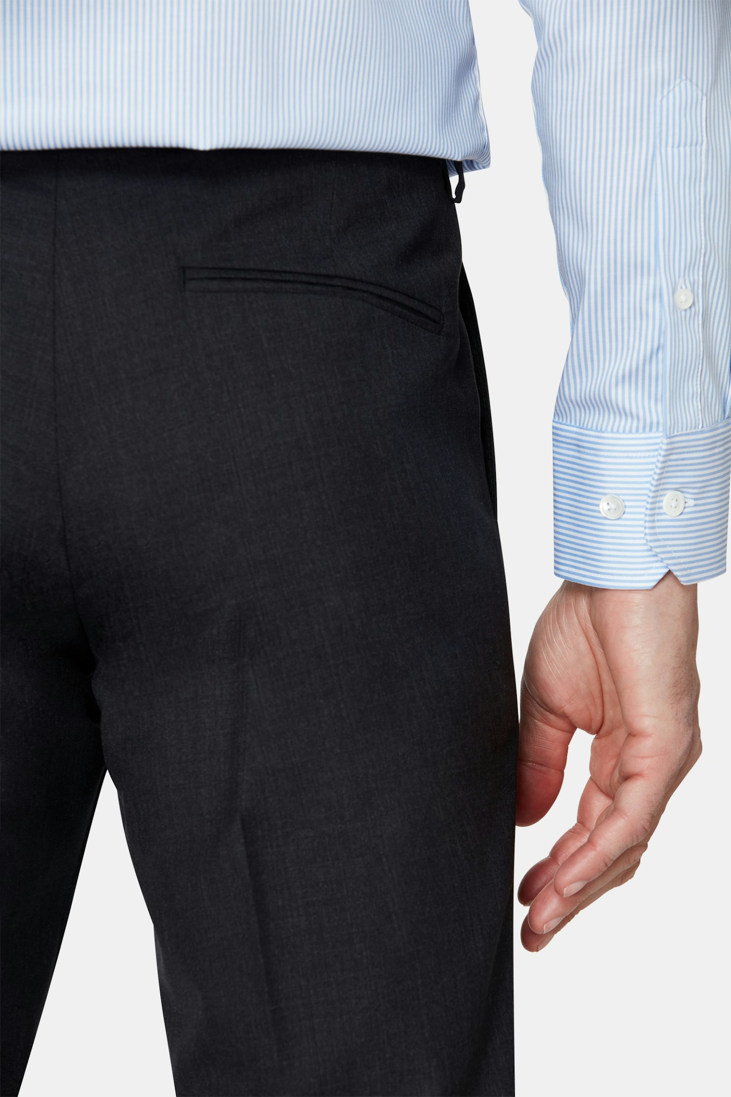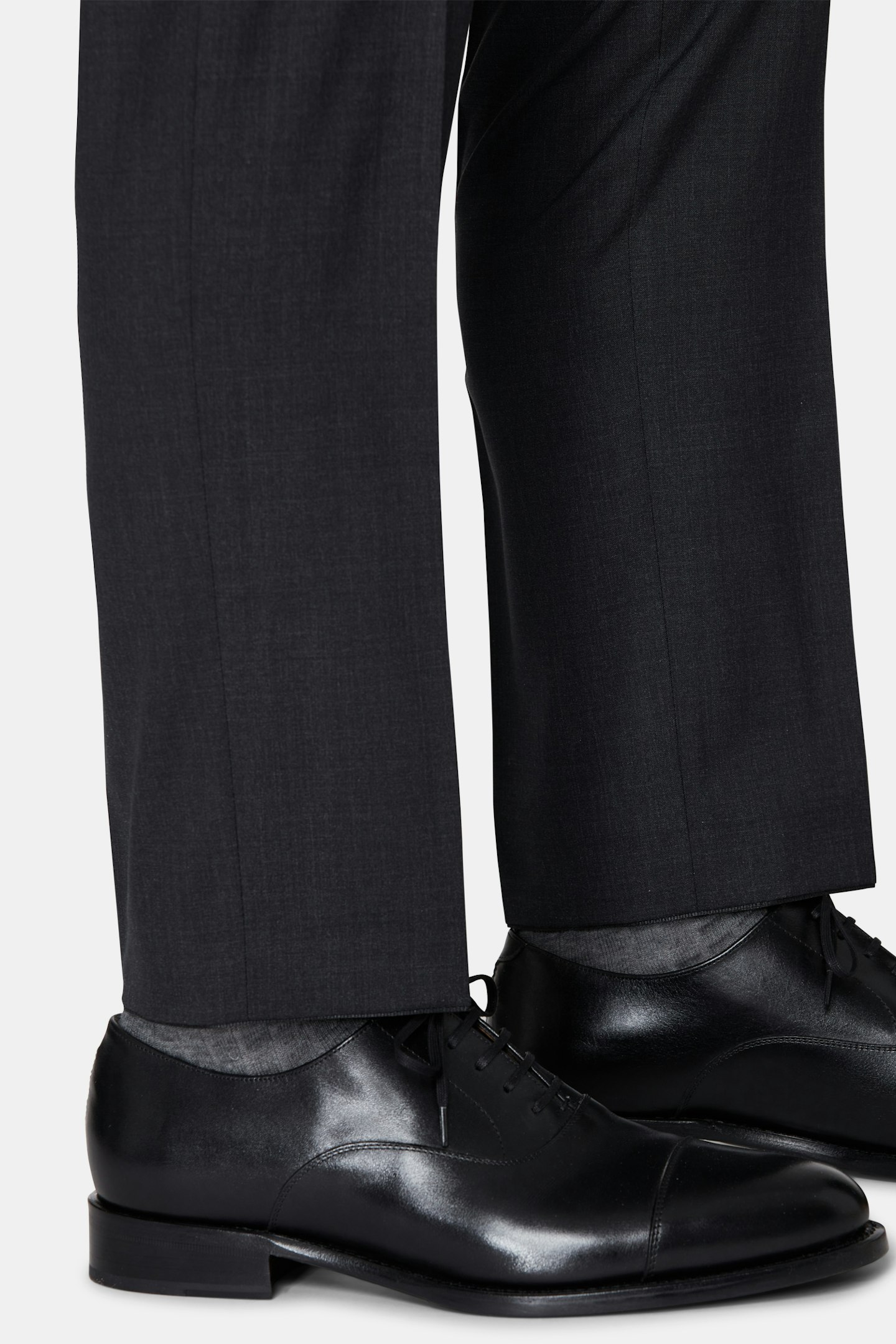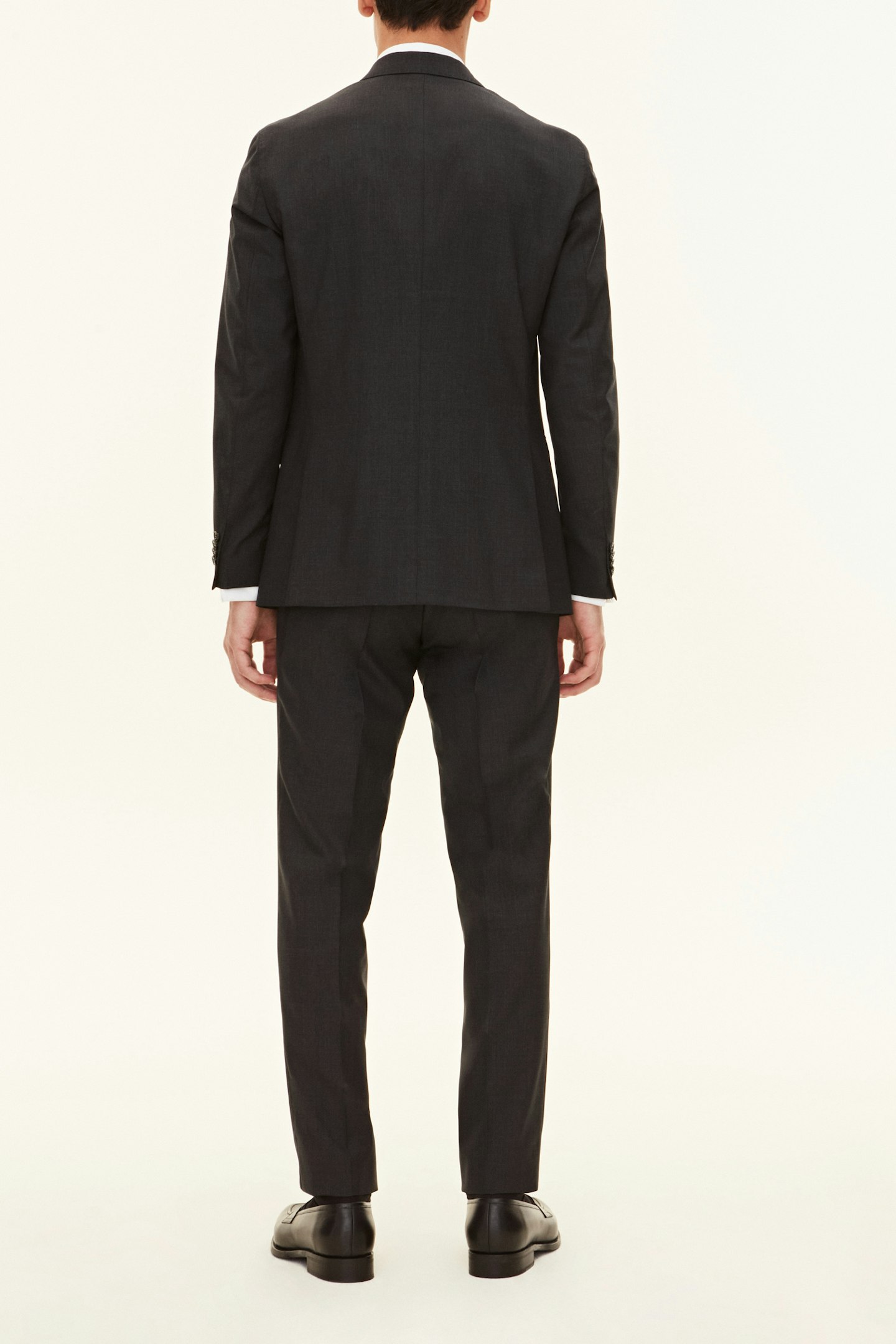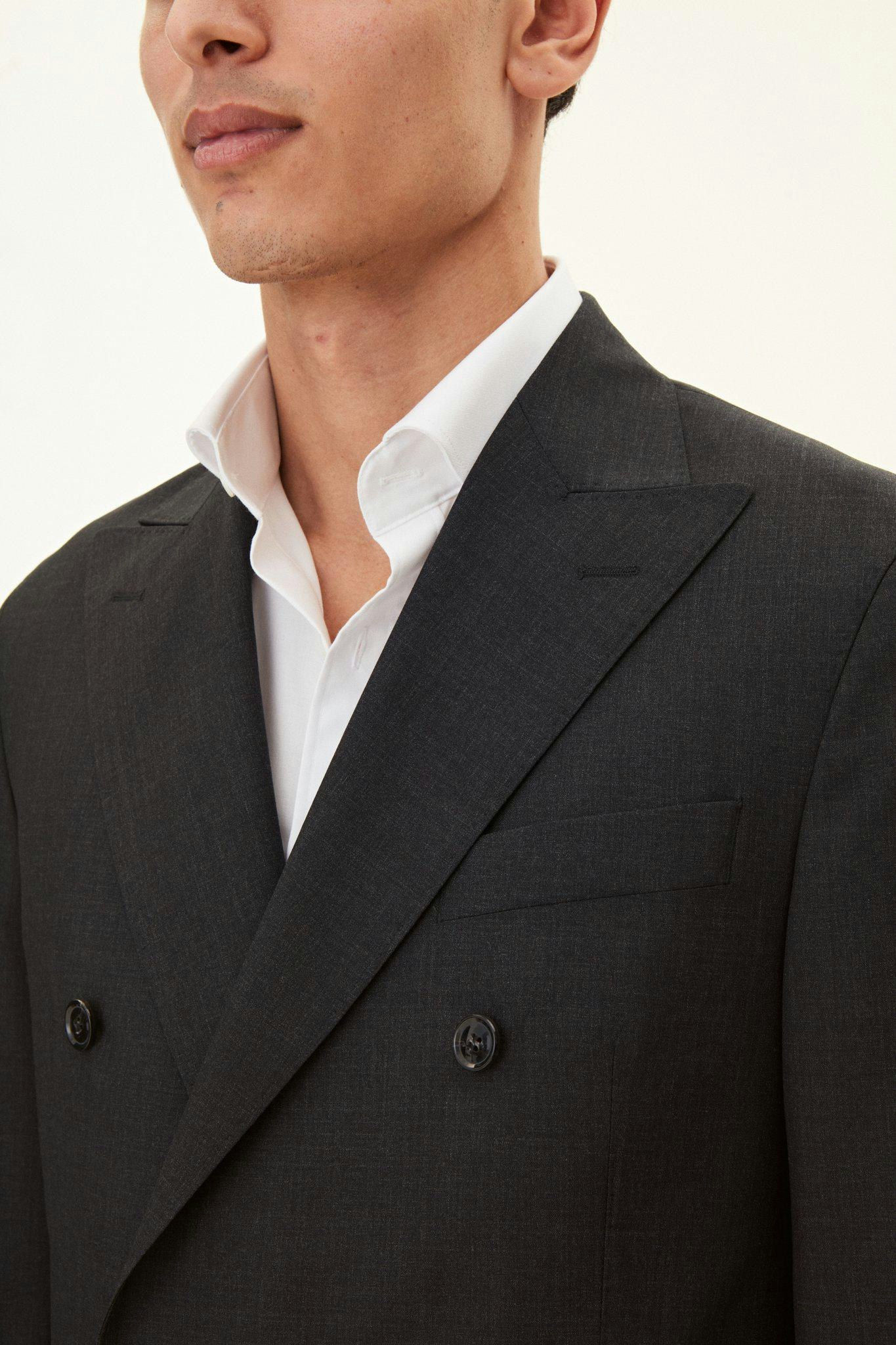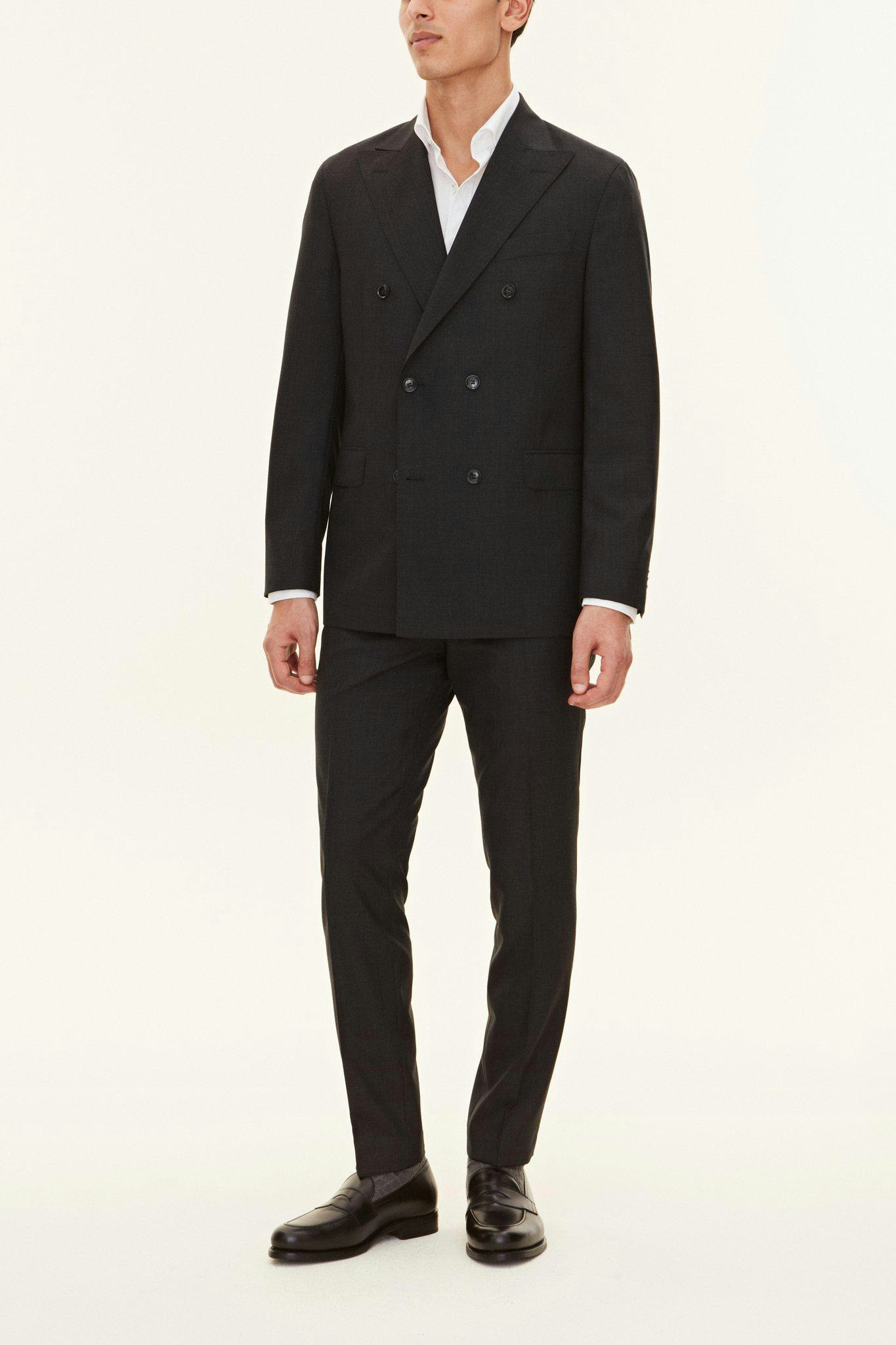 Klassisk dobbeltspent dress i regular fit med spisse slag og mykt konstruerte skuldre. Laget av glatt Super 120'S ull fra veveriet Vitale Barberis Canonico. Buksen har en klassisk passform som smalner av mot foten og en klassisk bukselengde som akkurat berører skoen.