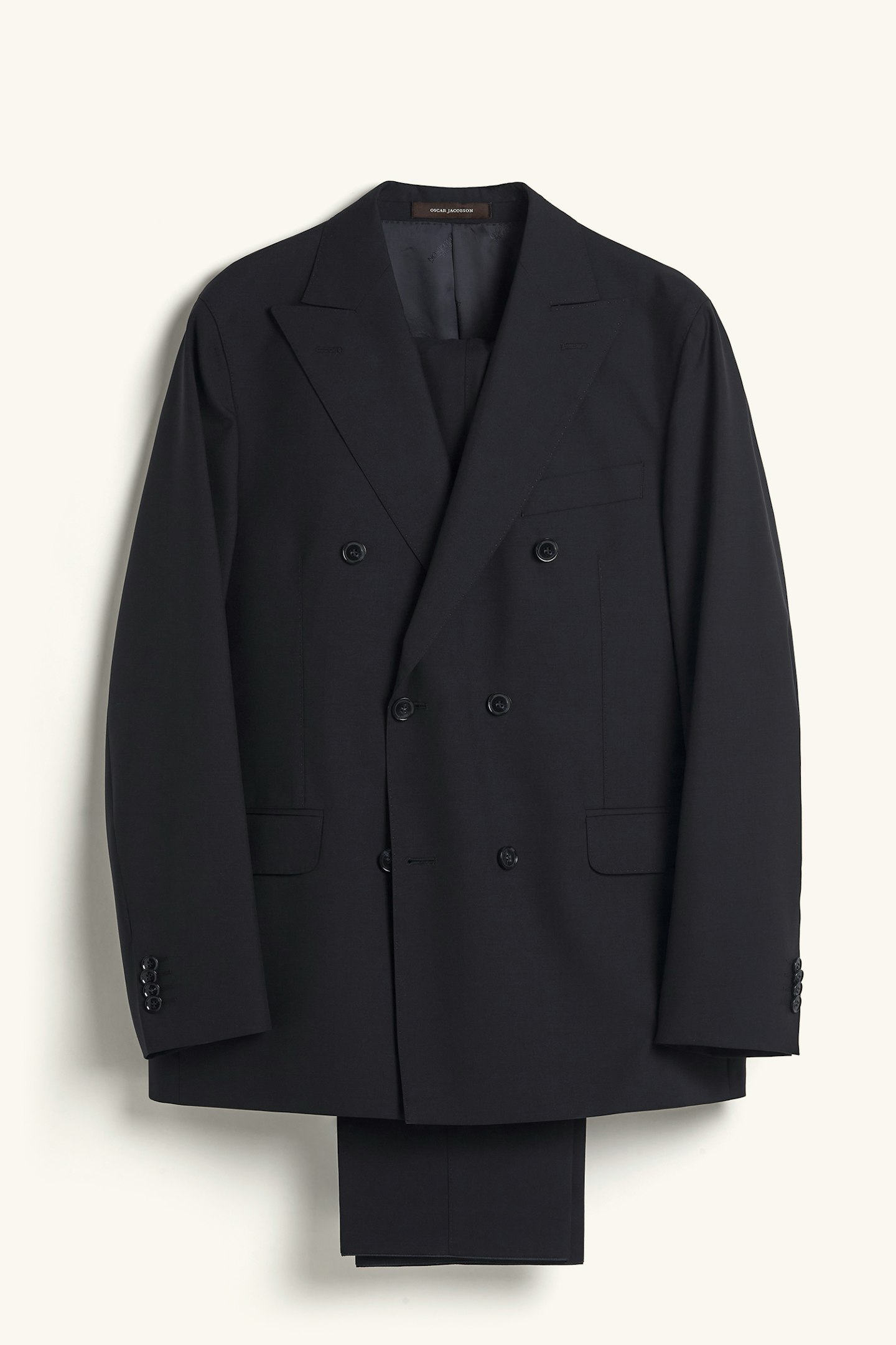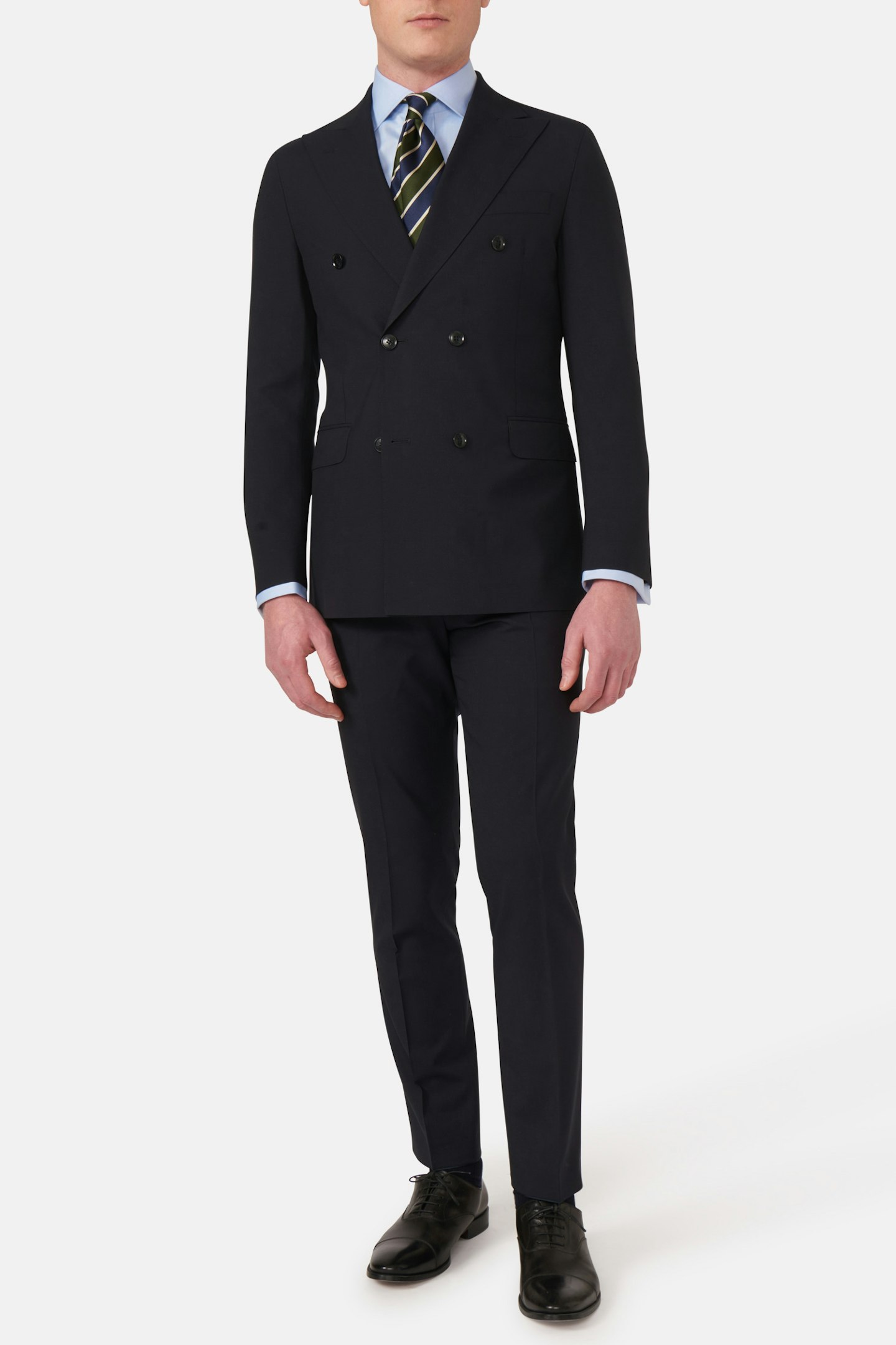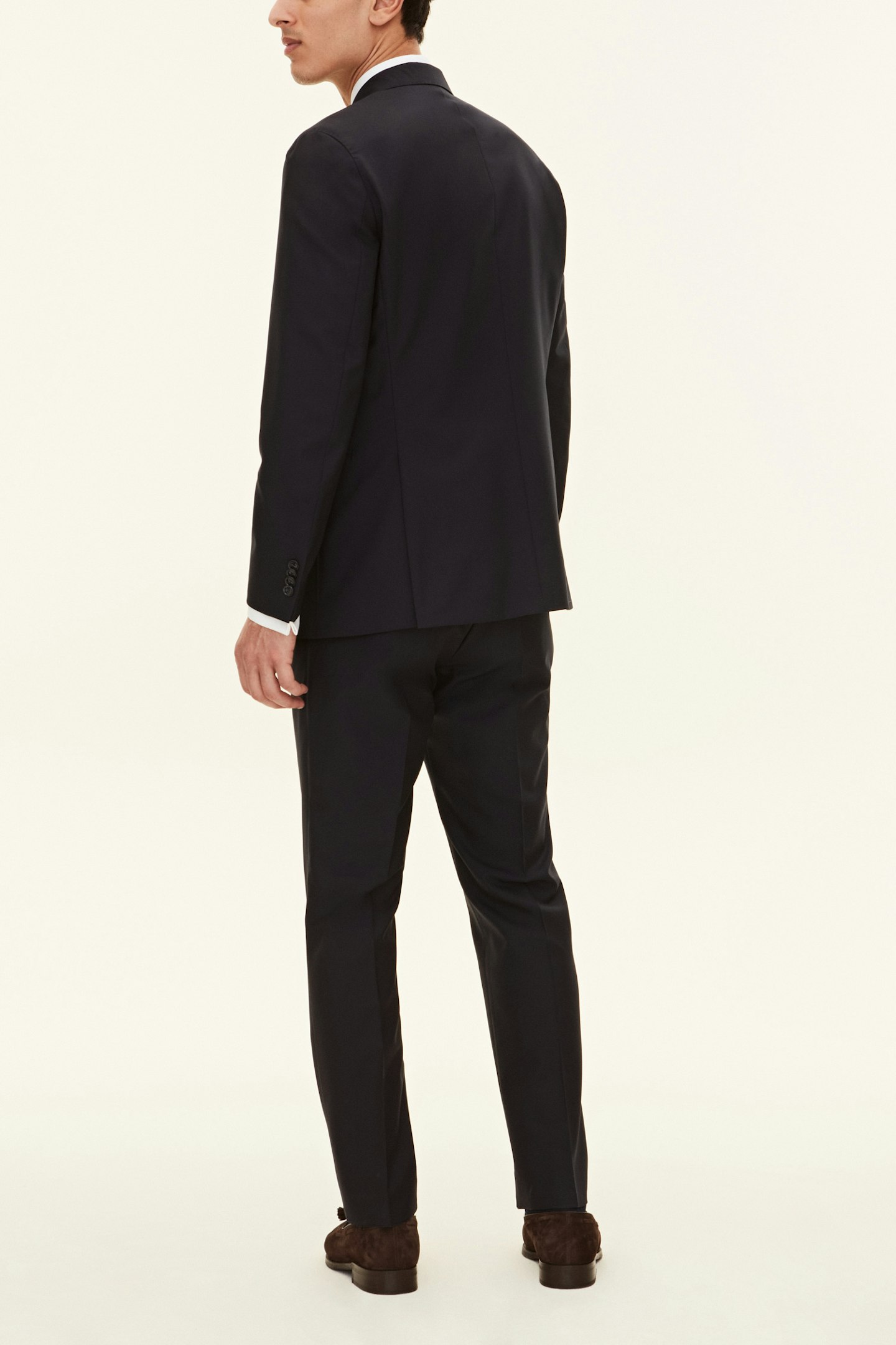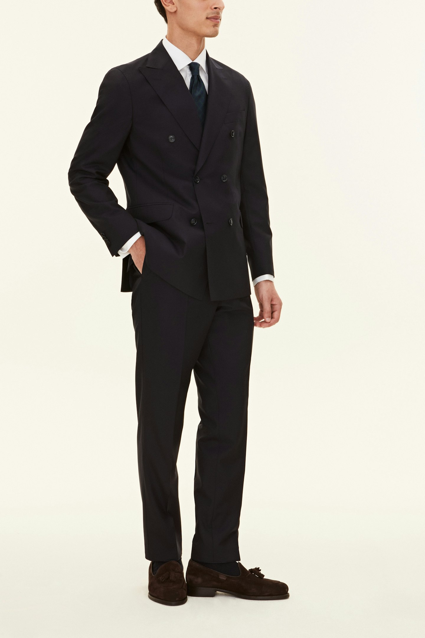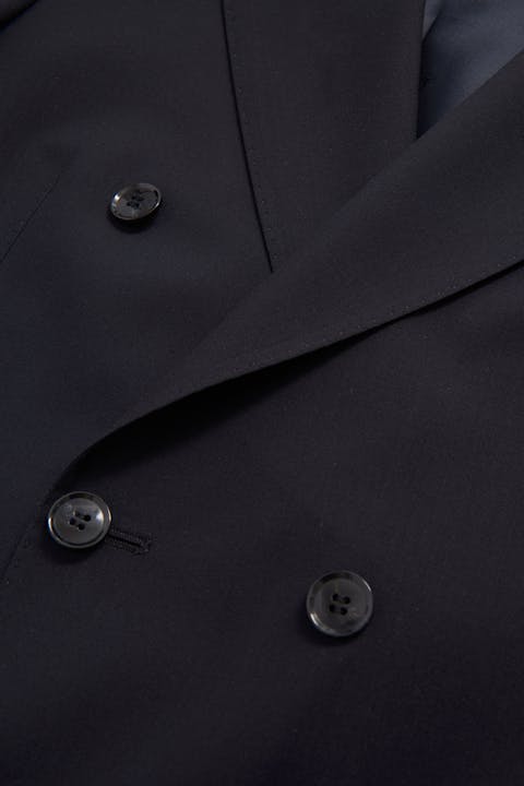 Klassisk dobbeltspent dress i regular fit med spisse slag og mykt konstruerte skuldre. Laget av glatt Super 120'S ull fra veveriet Vitale Barberis Canonico. Buksen har en klassisk passform som smalner av mot foten og en klassisk bukselengde som akkurat berører skoen.