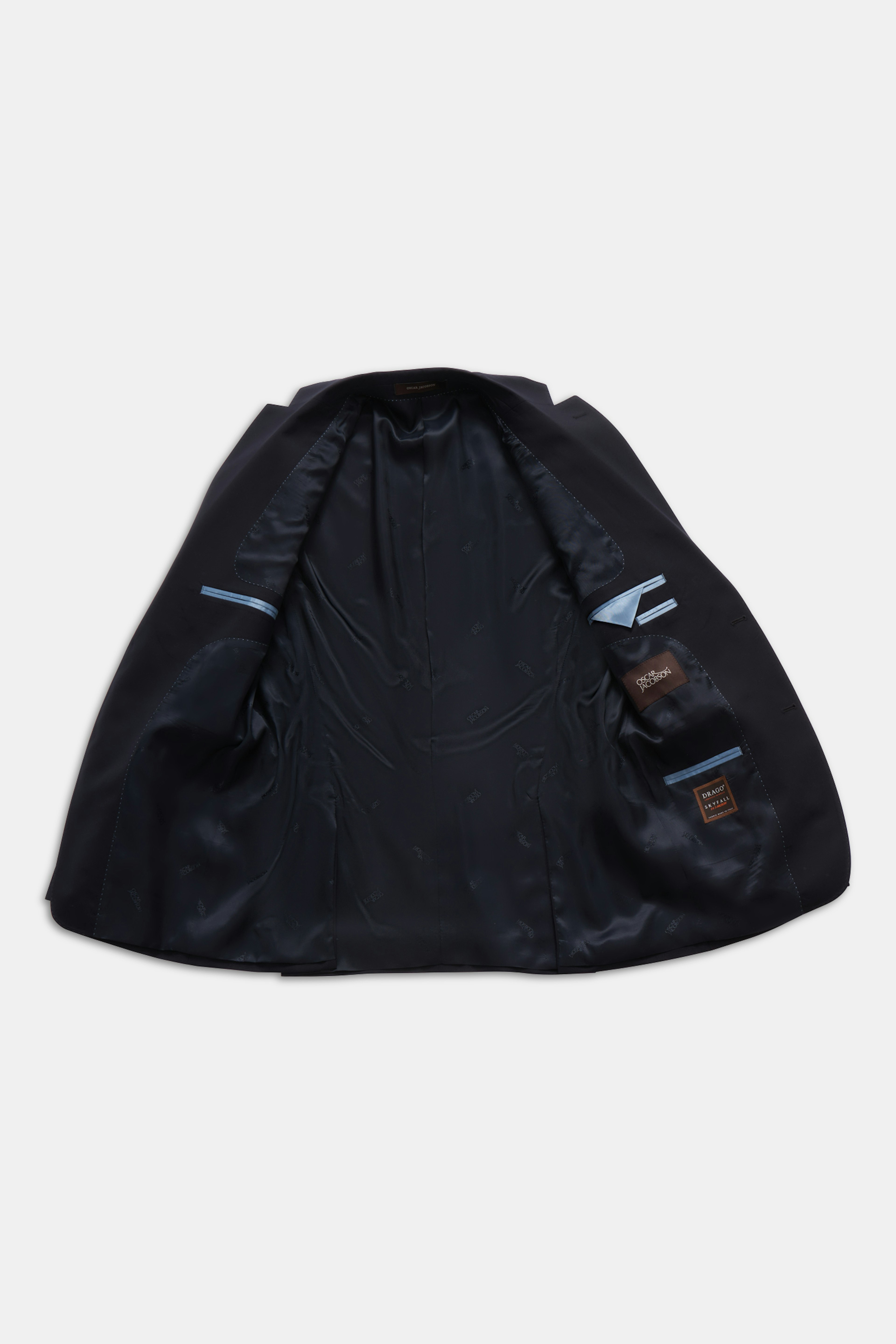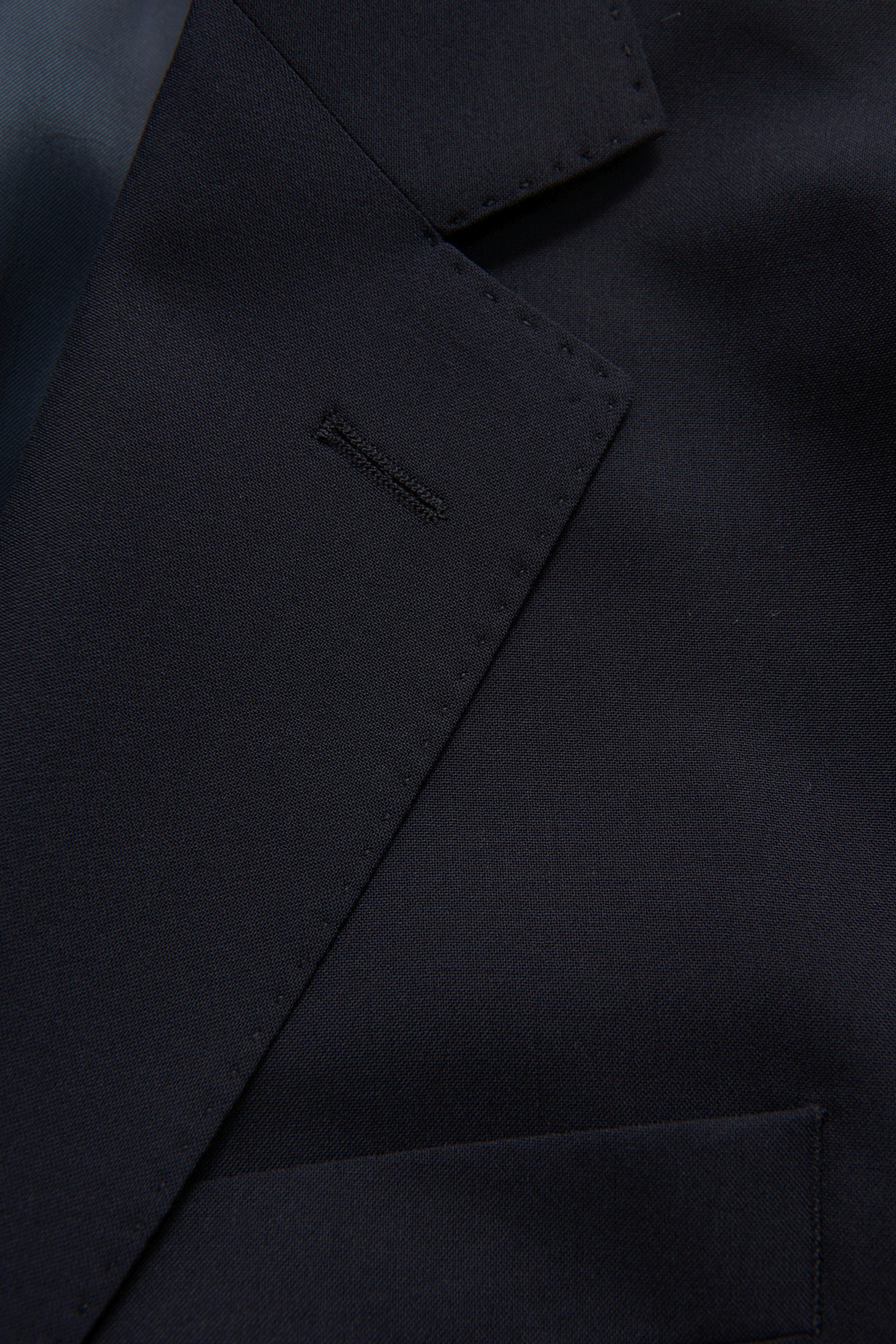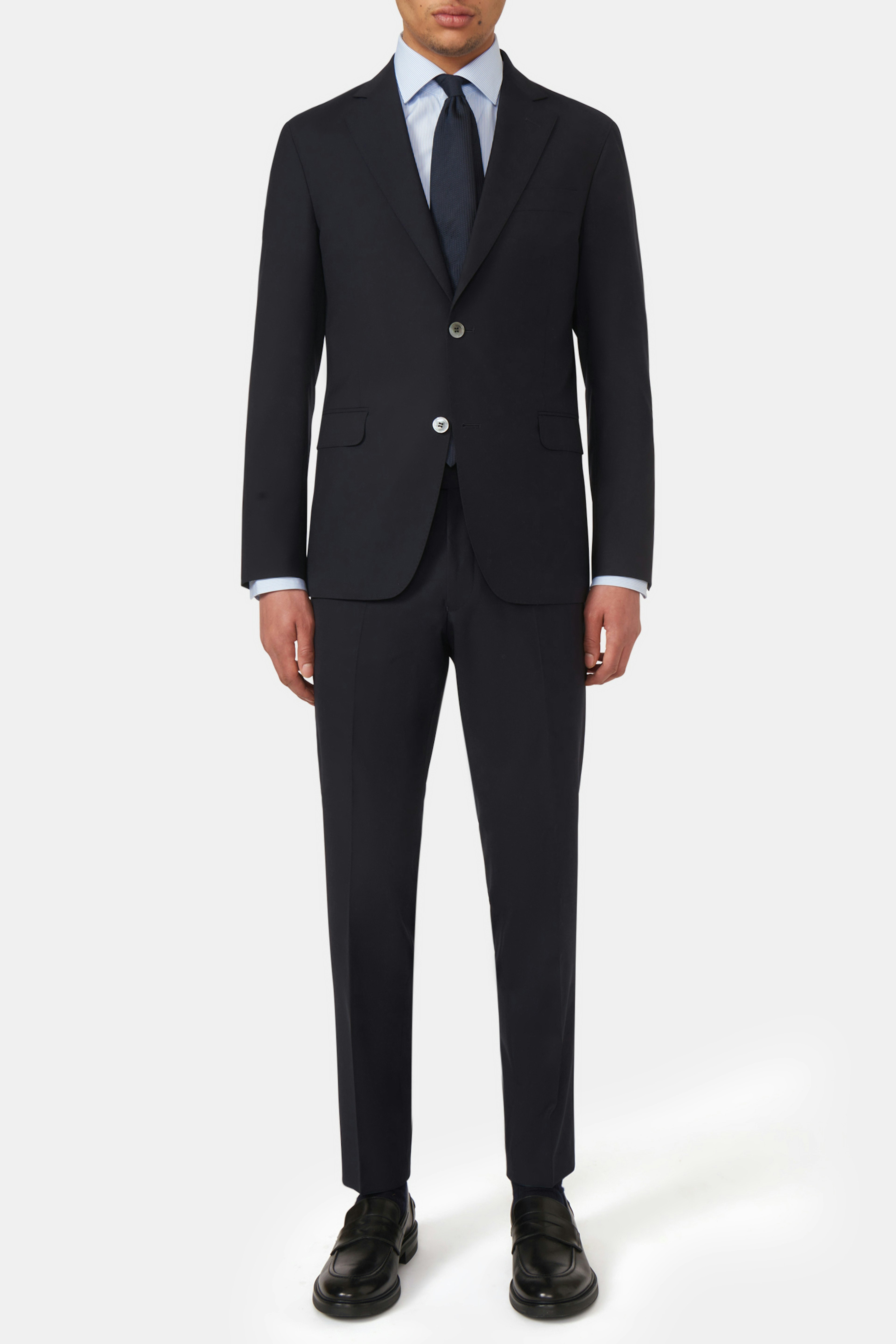 Modellen er helfôret og har et mykt konstruert bryst- og skulderparti. Passformen er av moderne snitt, men noe romsligere enn våre smaleste modeller. Laget av ull og silke fra det italienske veveriet Drago. Denne dressen er et utmerket valg både for jobben og festen.