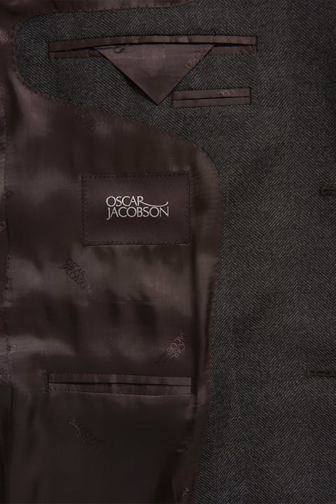 Formell blazer med myk oppbygd skulder, helfôr og en rak silhuett. Enkelt og fint fiskebeinsmønster fra Marzotto i Super 110’s ull.