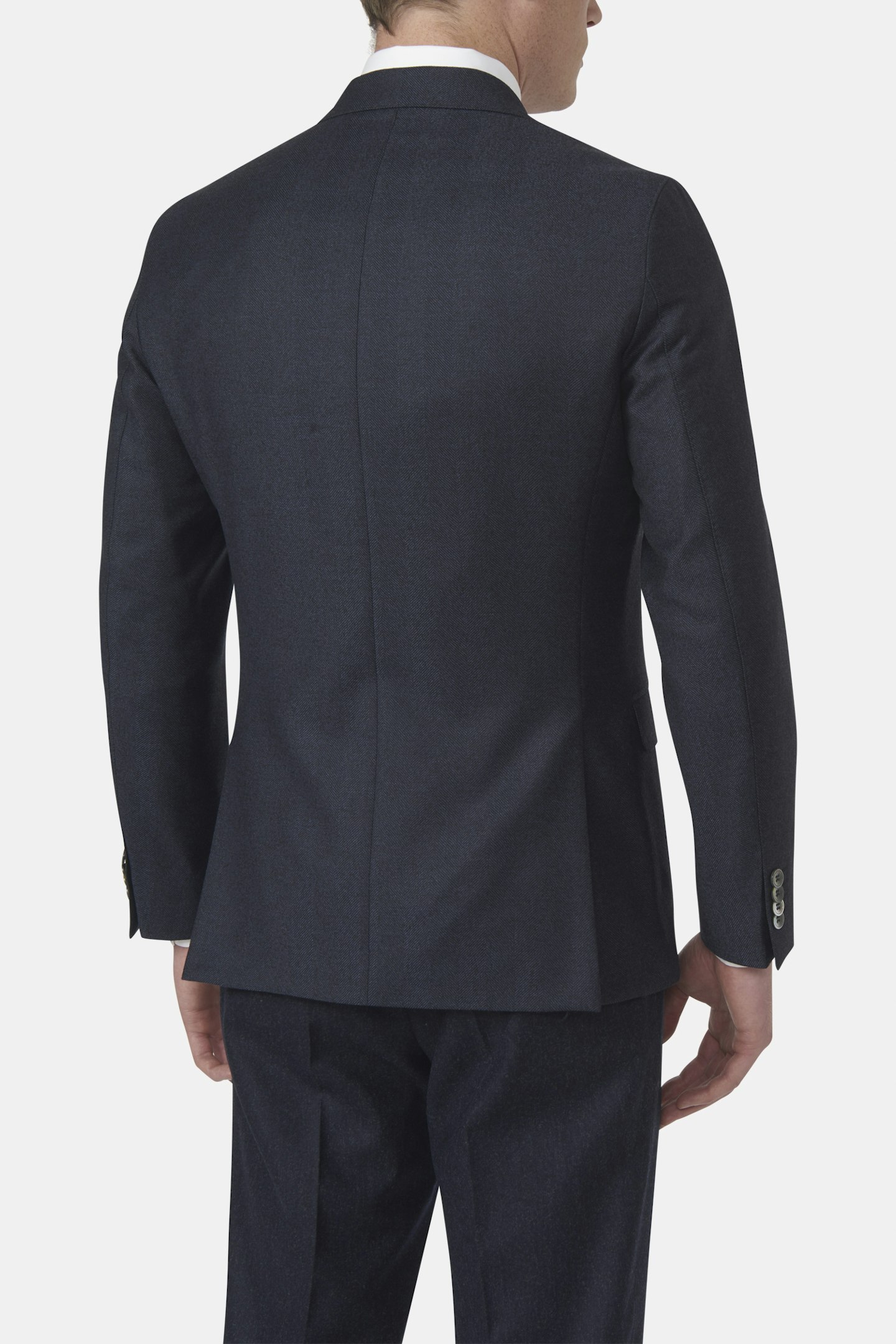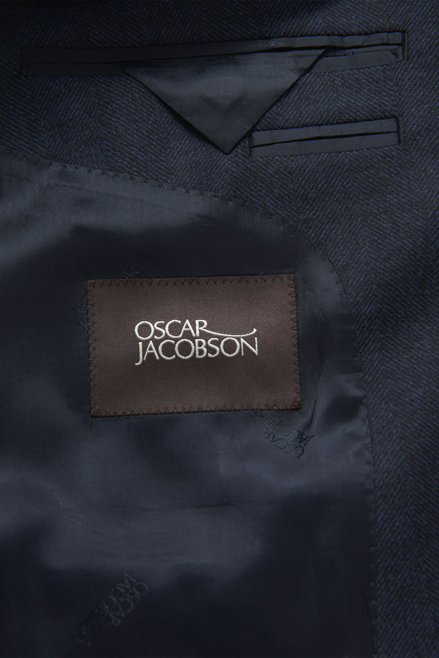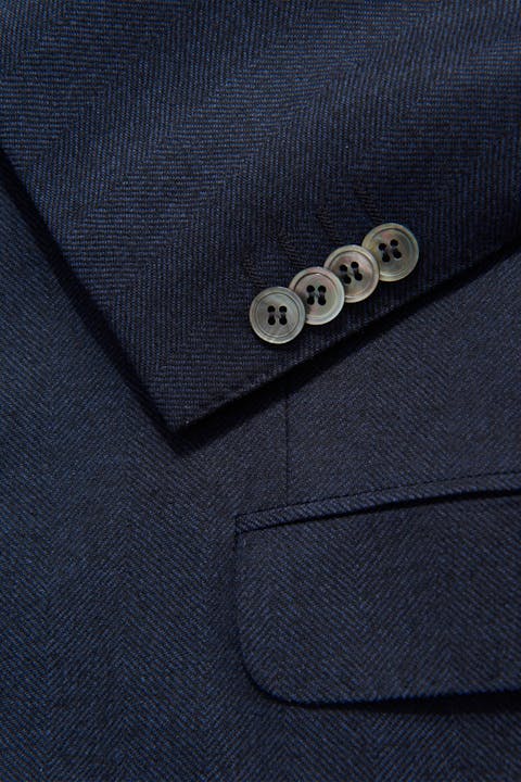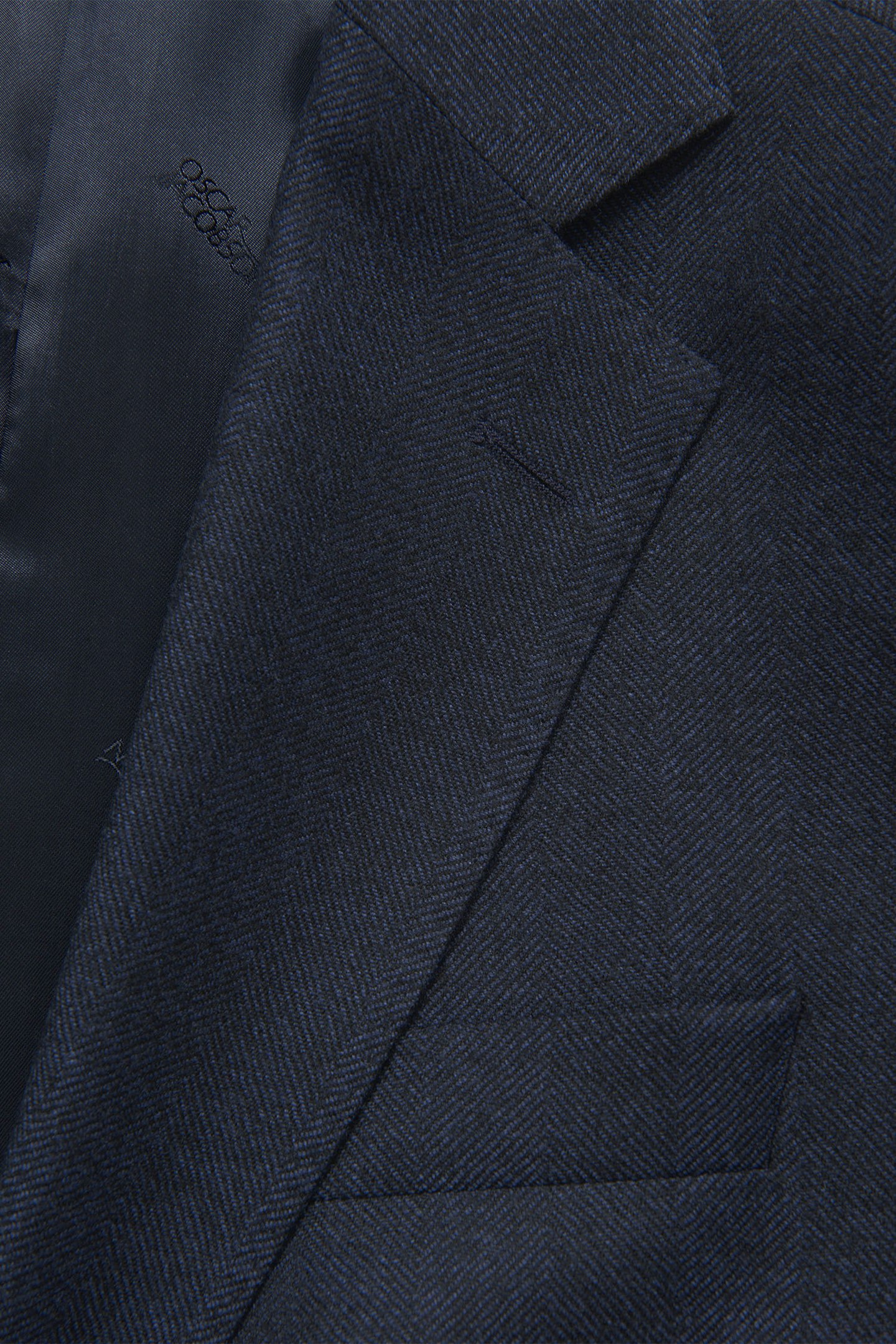 Formell blazer med myk oppbygd skulder, helfôr og en rak silhuett. Enkelt og fint fiskebeinsmønster fra Marzotto i Super 110’s ull.