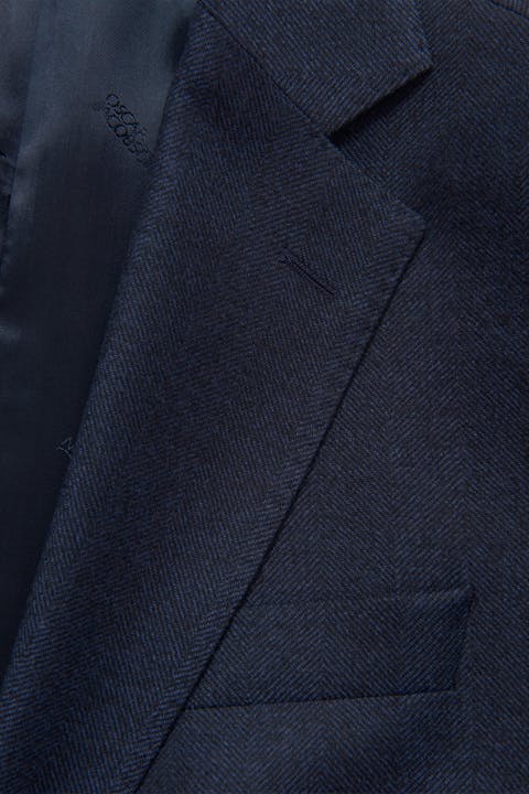 Formell blazer med myk oppbygd skulder, helfôr og en rak silhuett. Enkelt og fint fiskebeinsmønster fra Marzotto i Super 110’s ull.