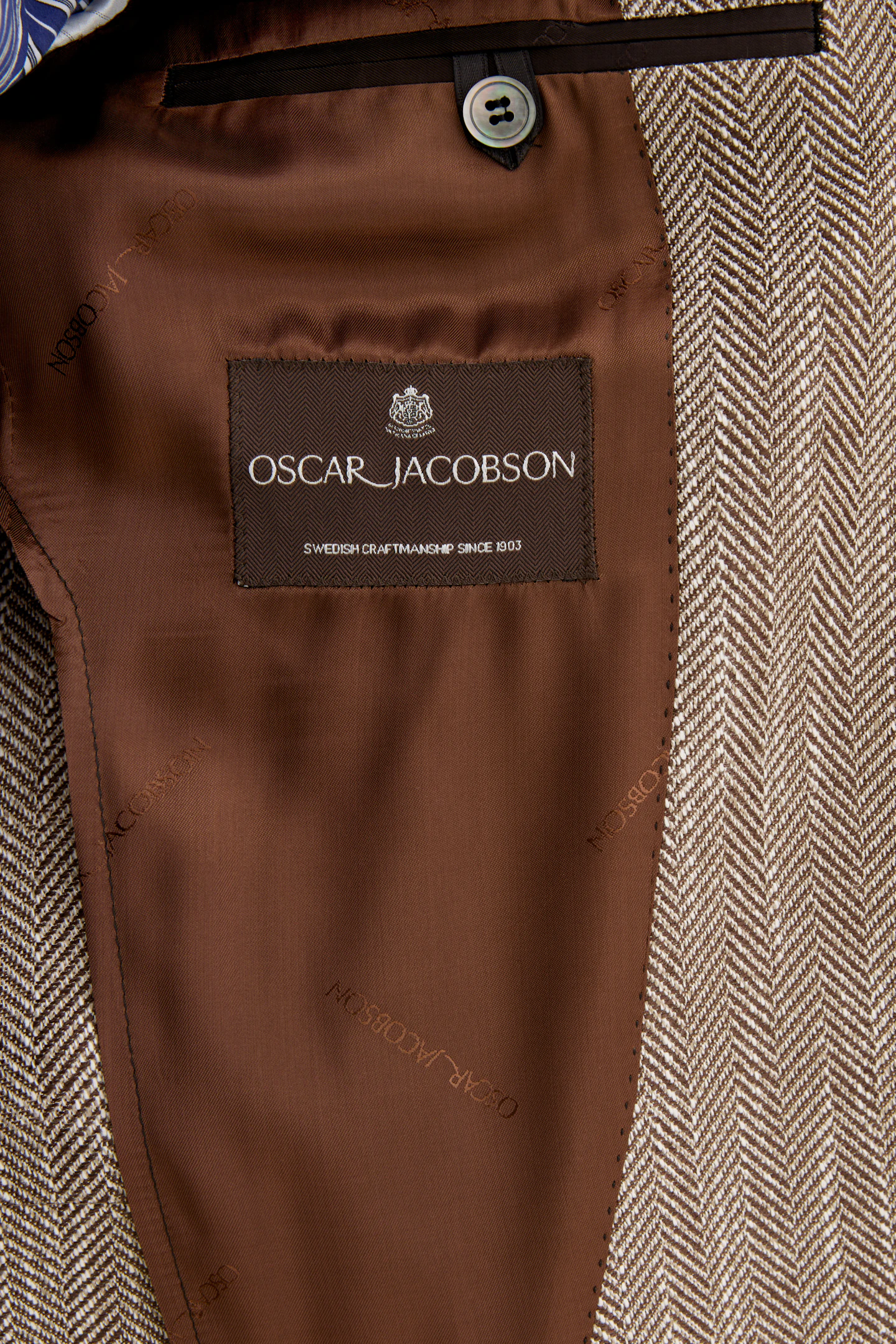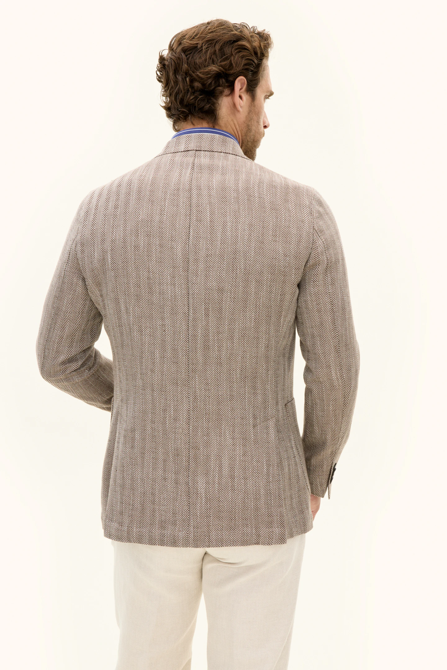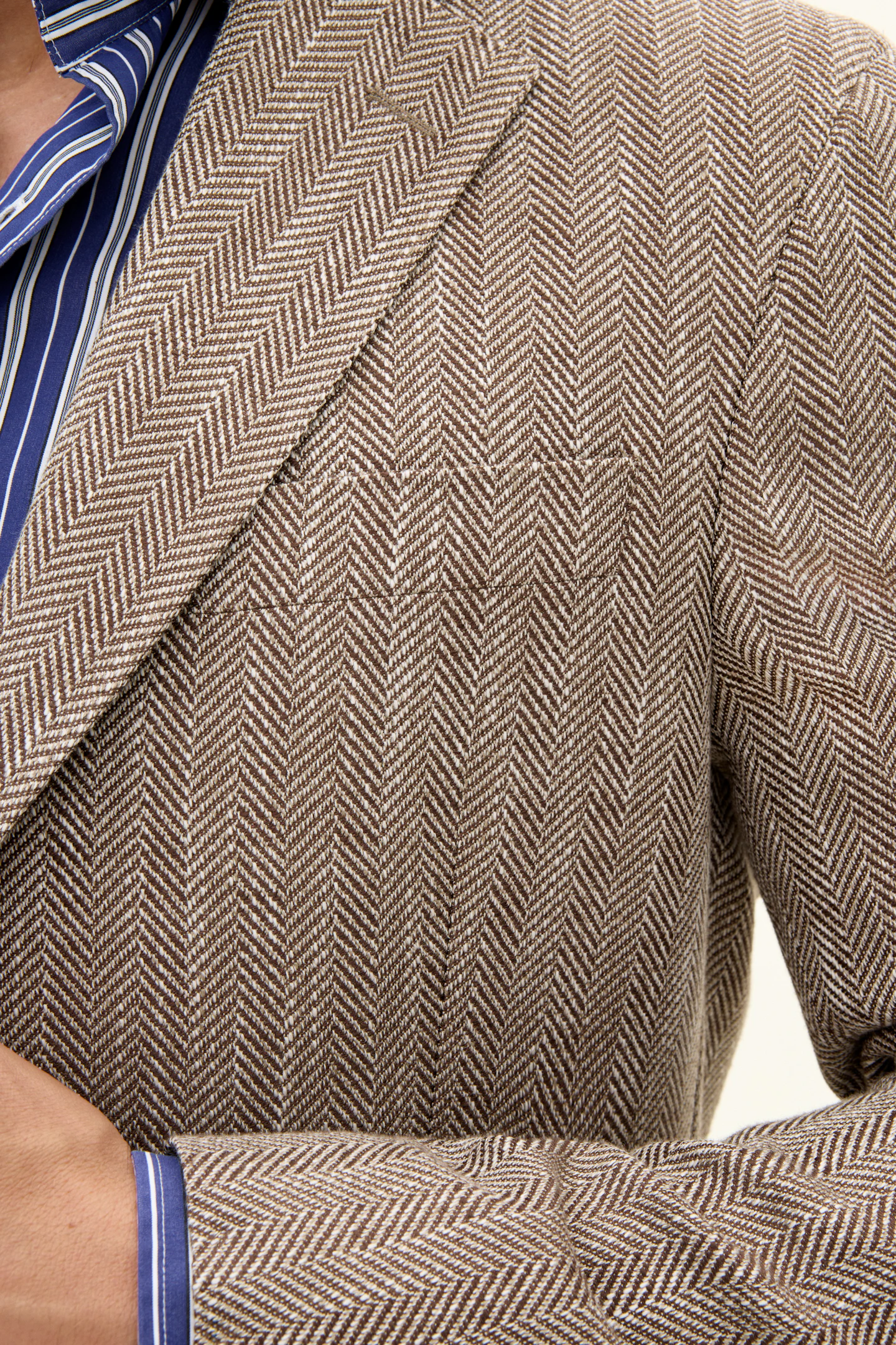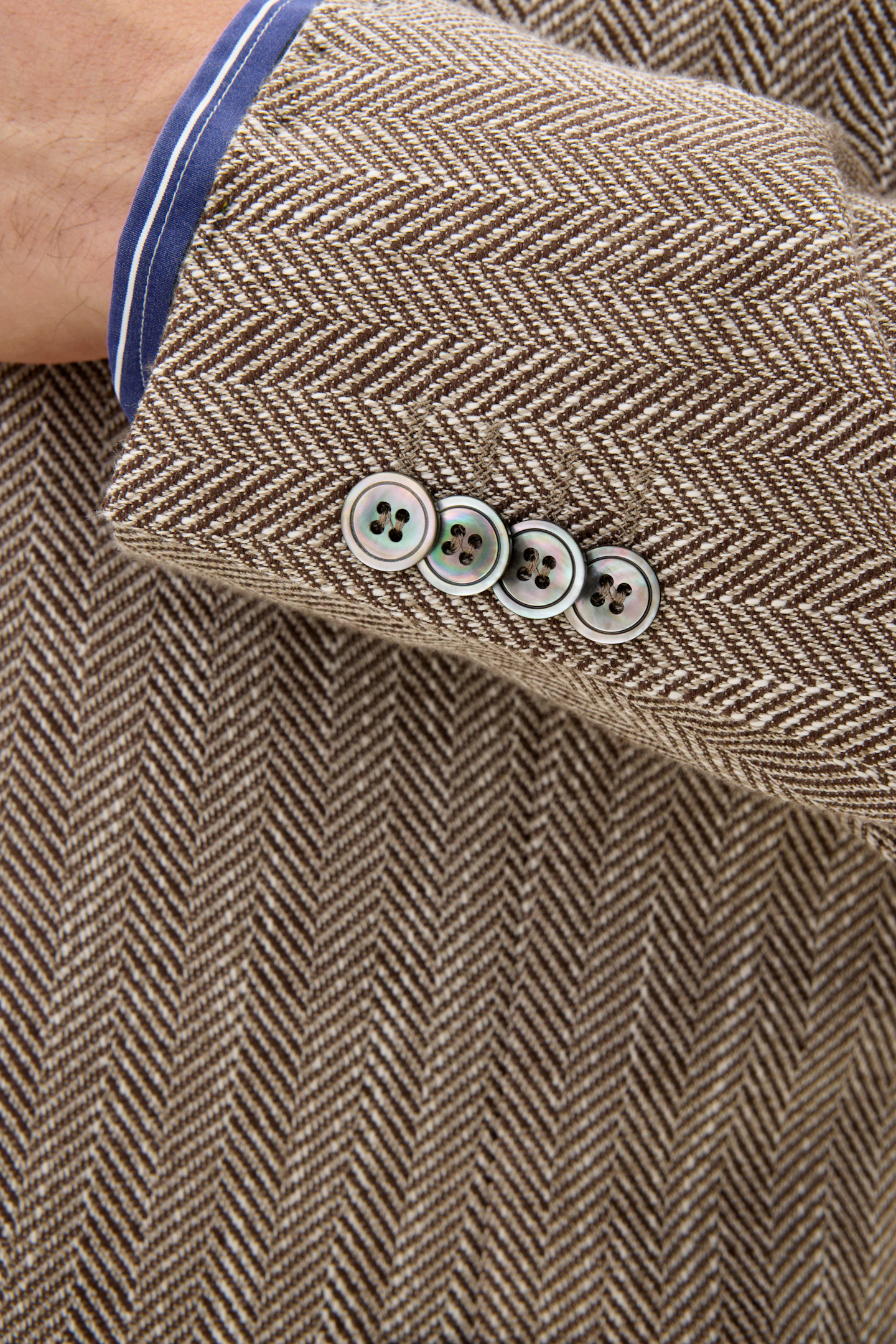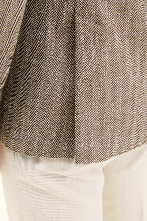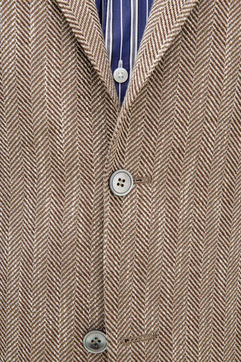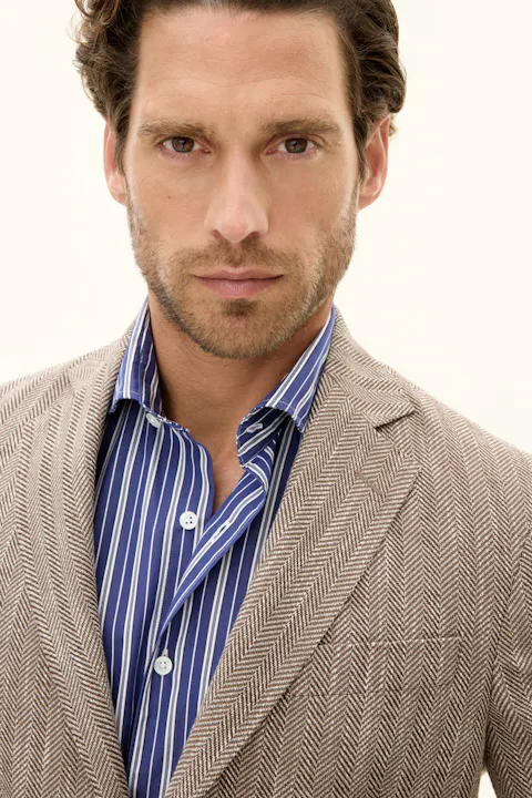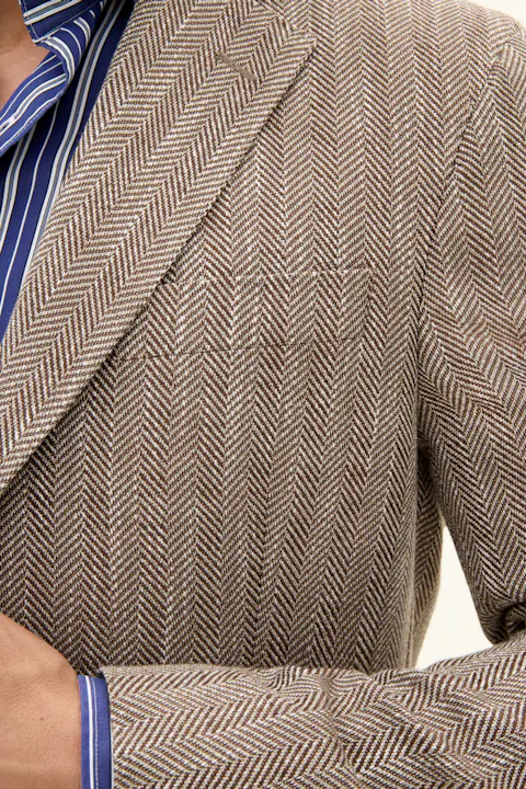 Laget av en myk bomullsblanding, har denne blazeren en regular fit. Den er designet med et tidløst fiskebensmønster, laget med vevd konstruksjon og en raffinert hopsacktekstur. Designet for å komplementere enhver garderobe med sin tidløse eleganse.