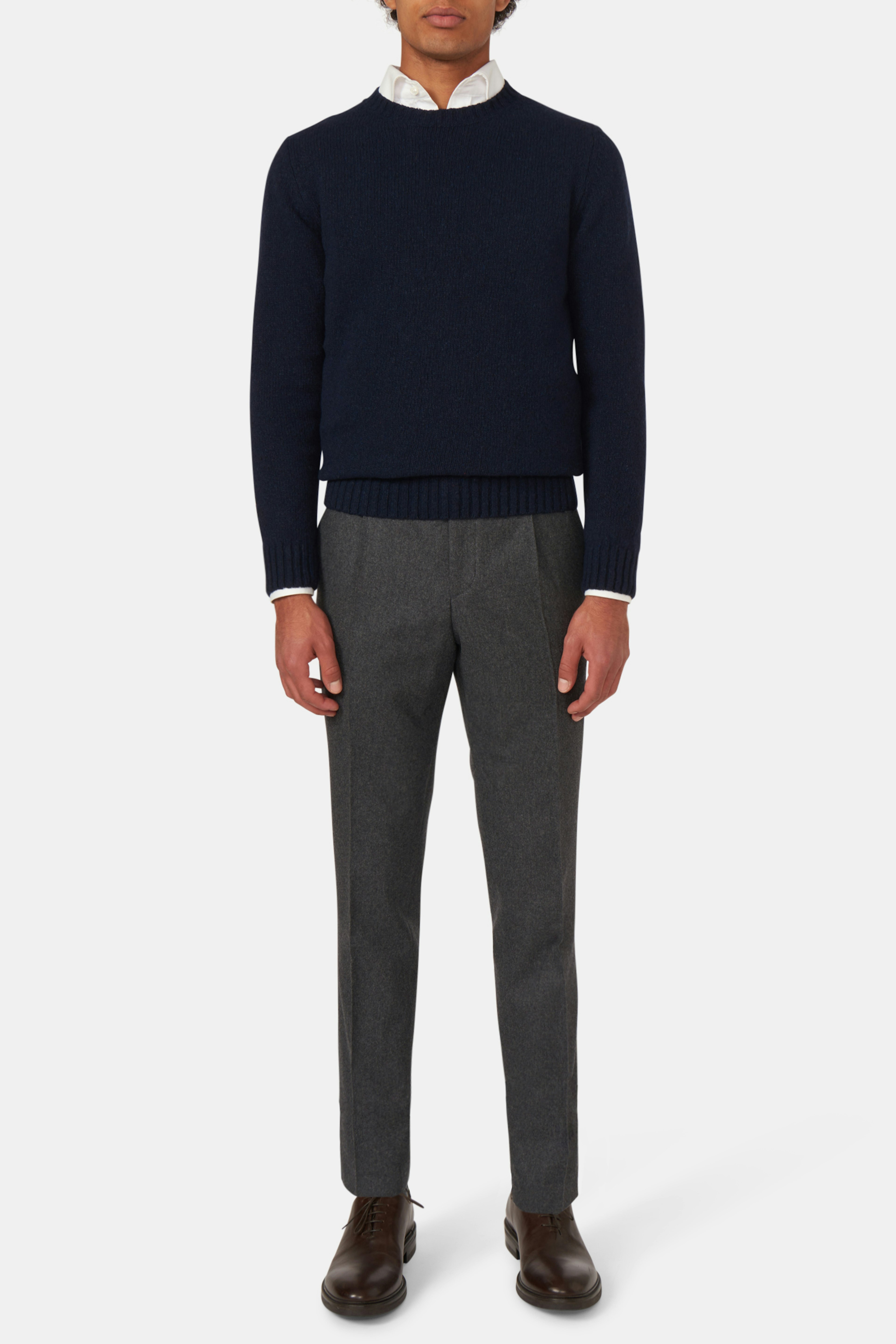 Bukse med en høyt liv, enkle legg, stilige sidespenner og avsmalet ankel. Stoff av mykt flanell som gjør den til den perfekte dressbuksen for høsten og vinteren.