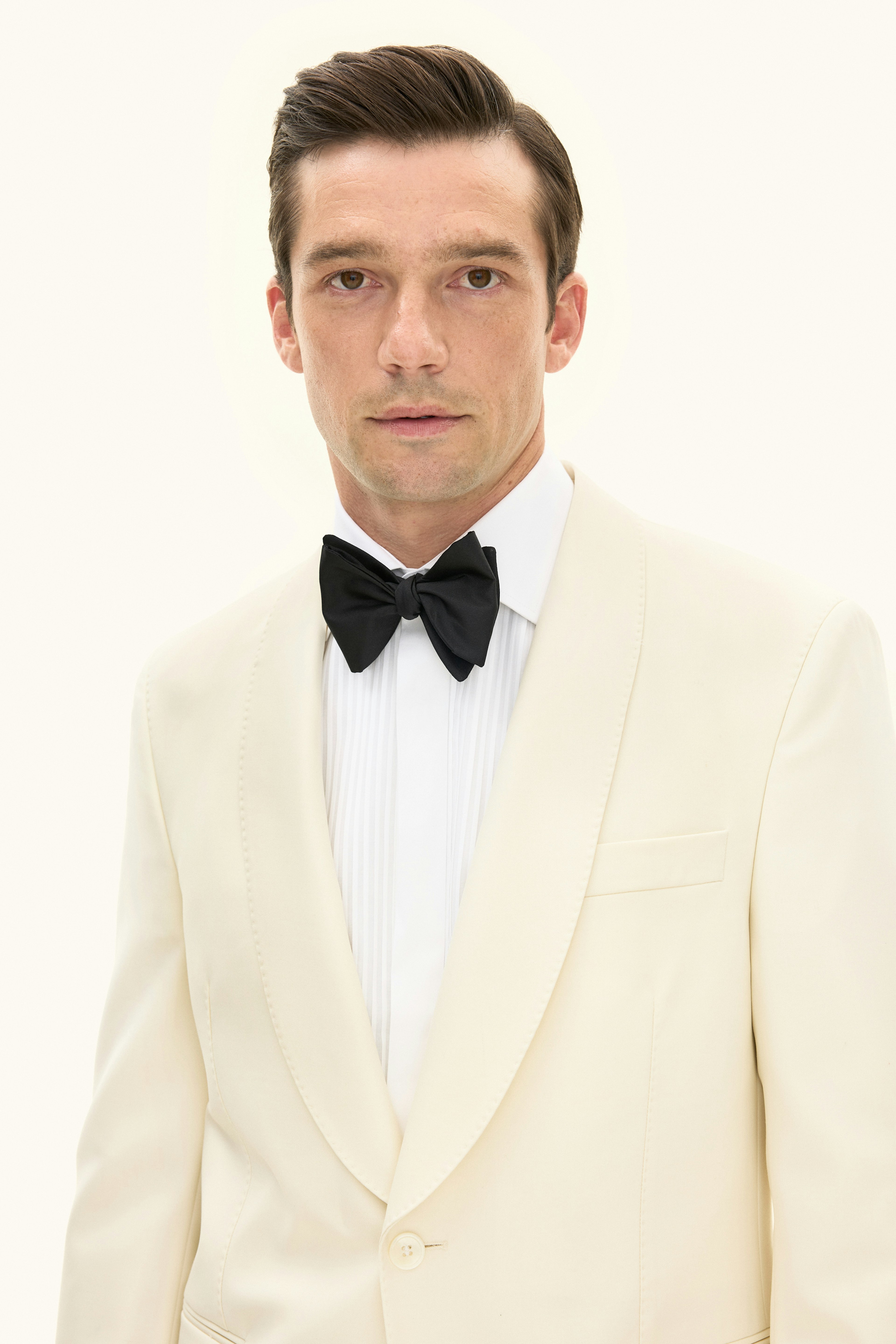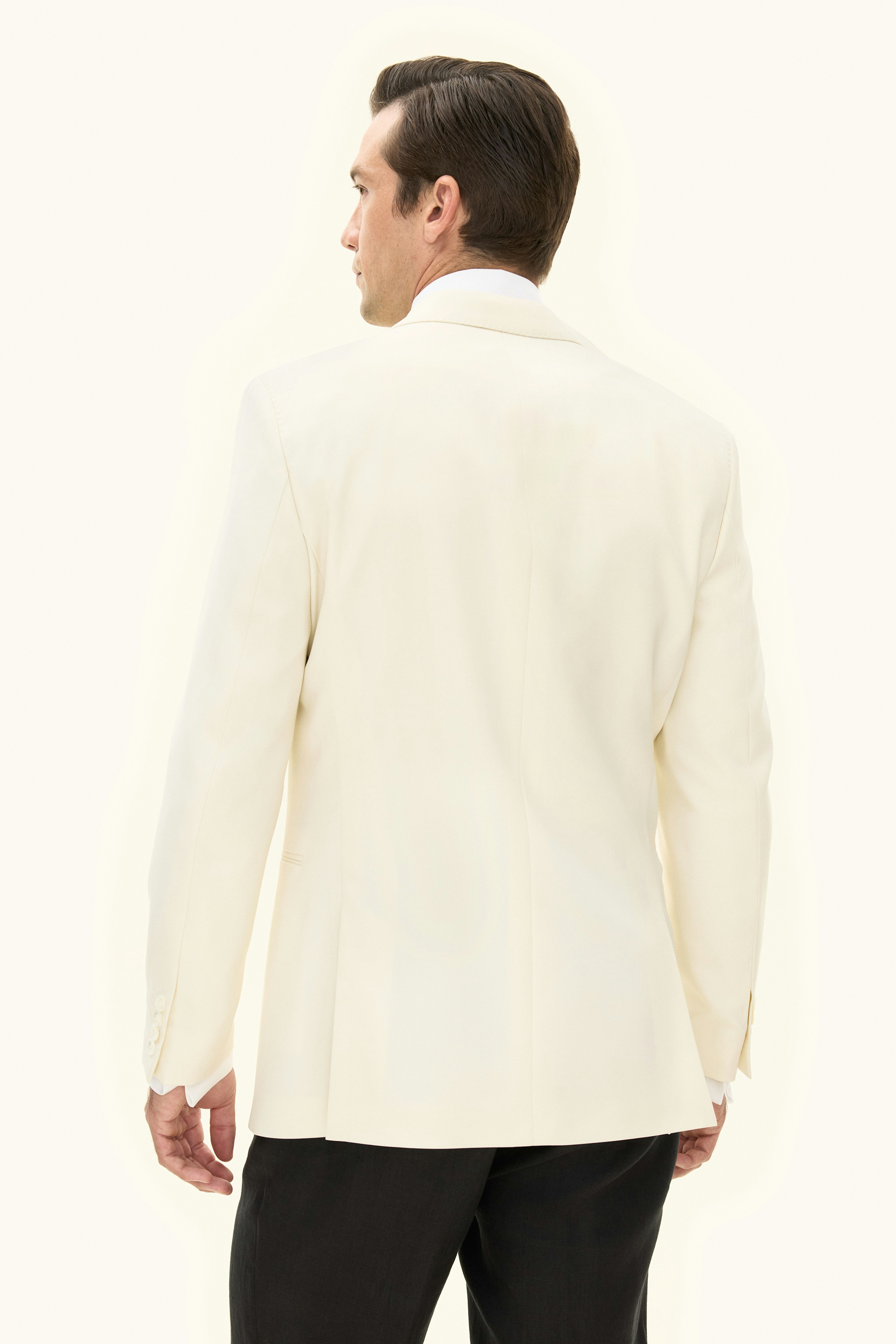 Single breasted tuxedo blazer in regular fit with a constructed shoulder and fully lined inside. The blazer is provided with shawl collar and paspoal pockets. Made from a 100 % wool fabric.