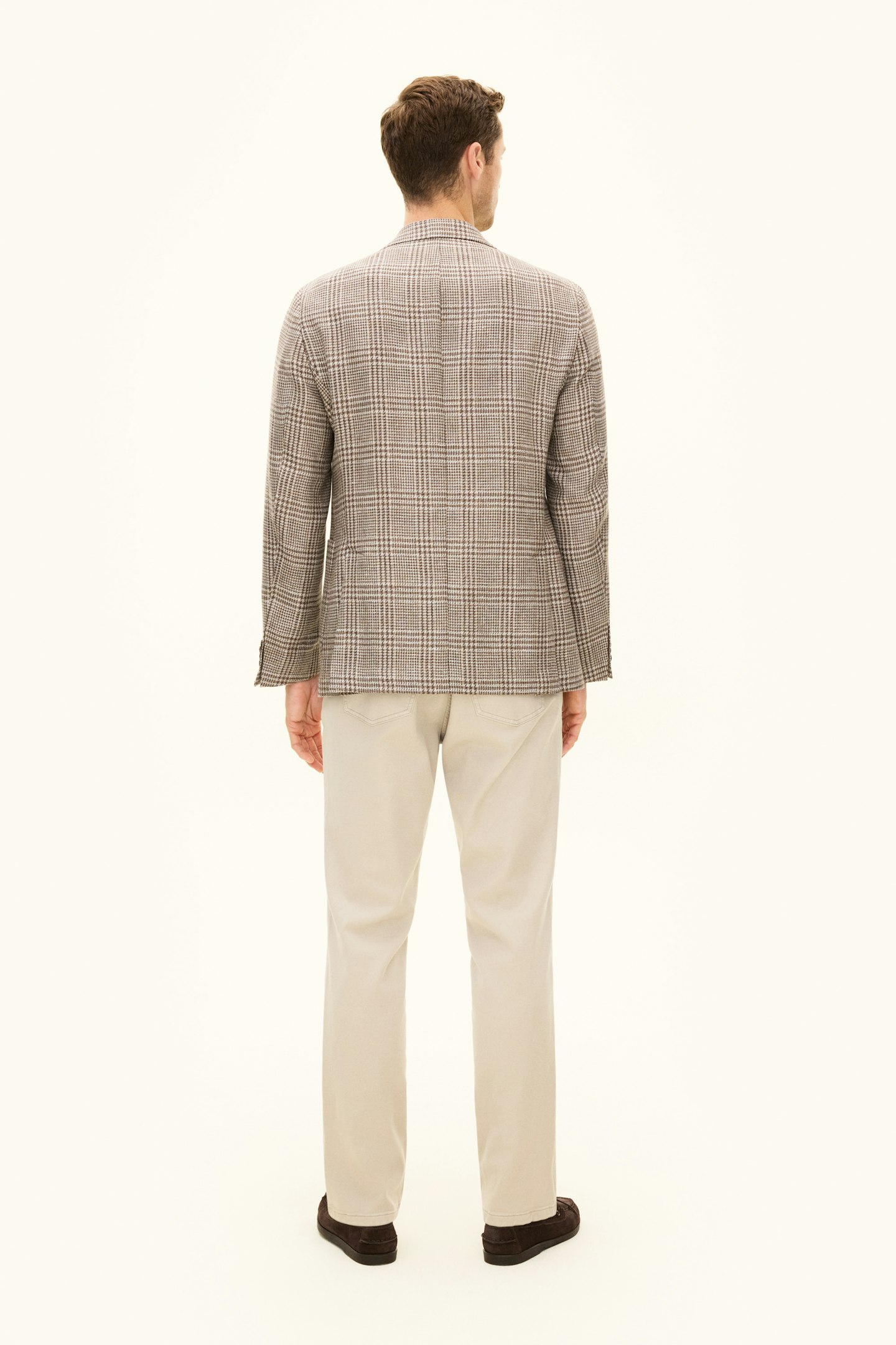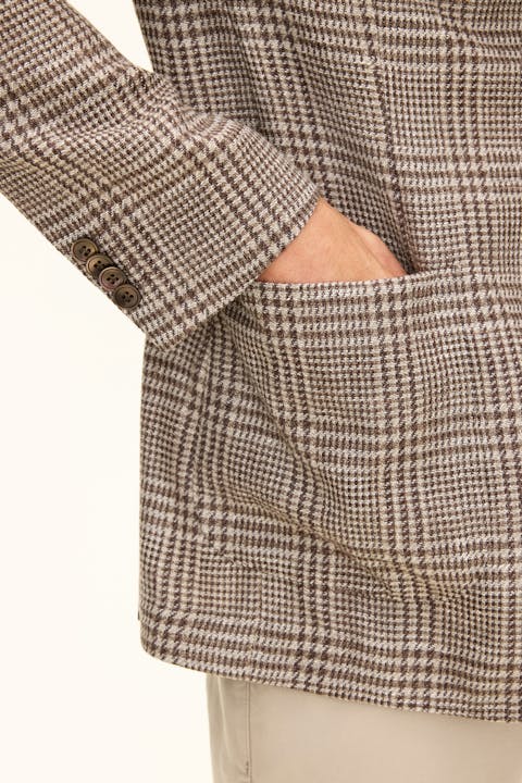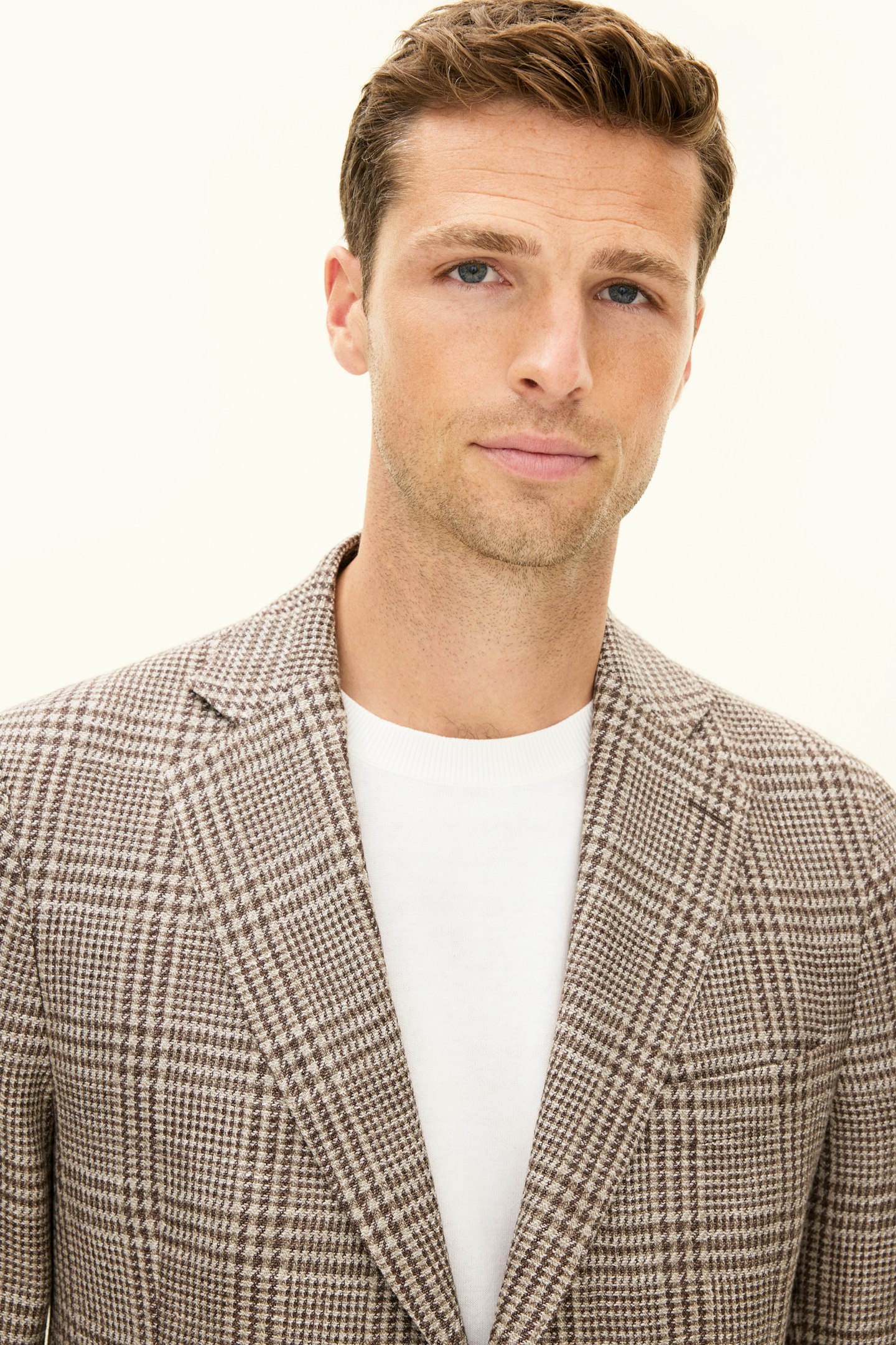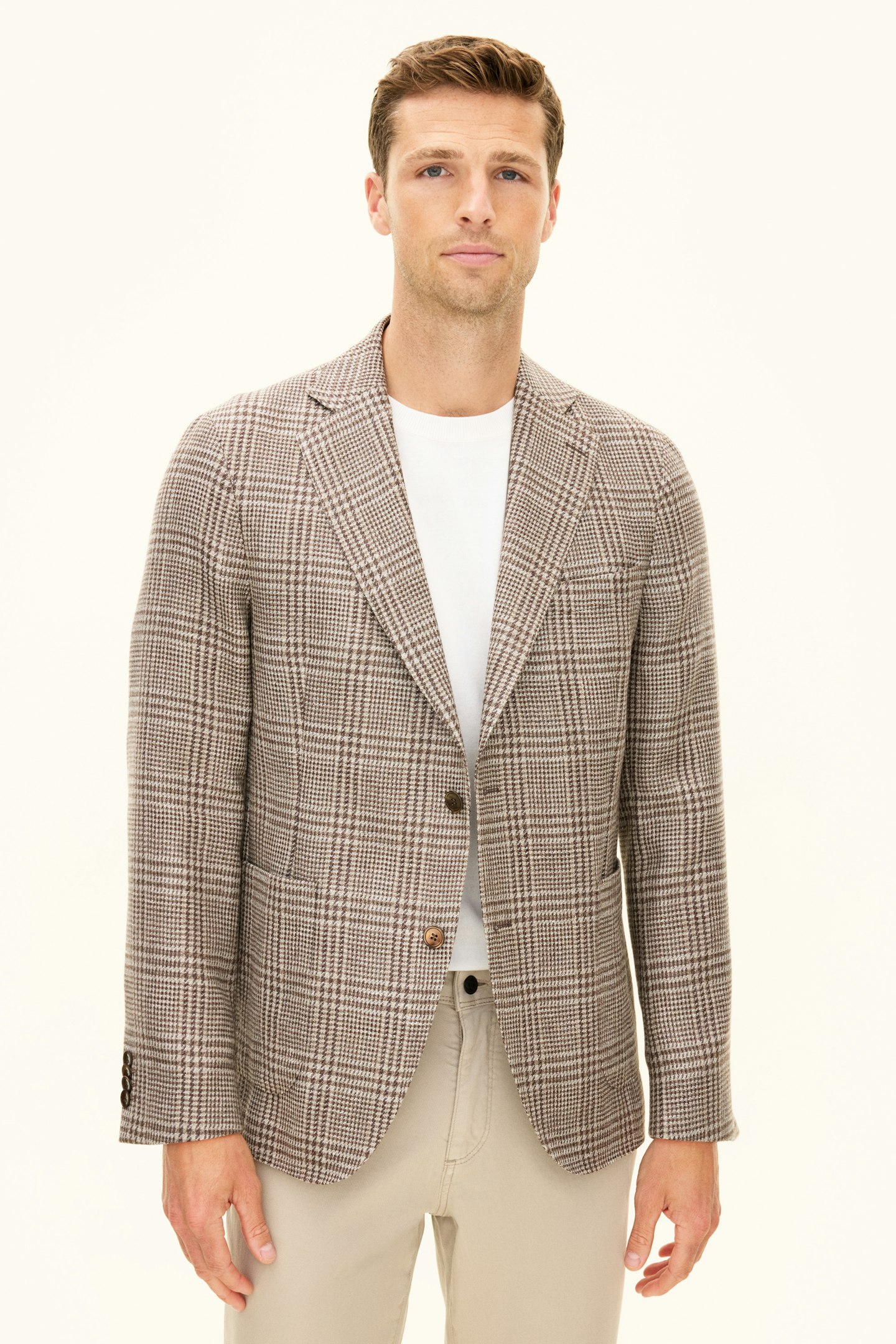 Blazer i regular fit og sofistikert glencheck-mønster, laget av en linblanding som gir både struktur og letthet. Enkeltspent og ustrukturert – et moderne plagg med klassisk karakter.