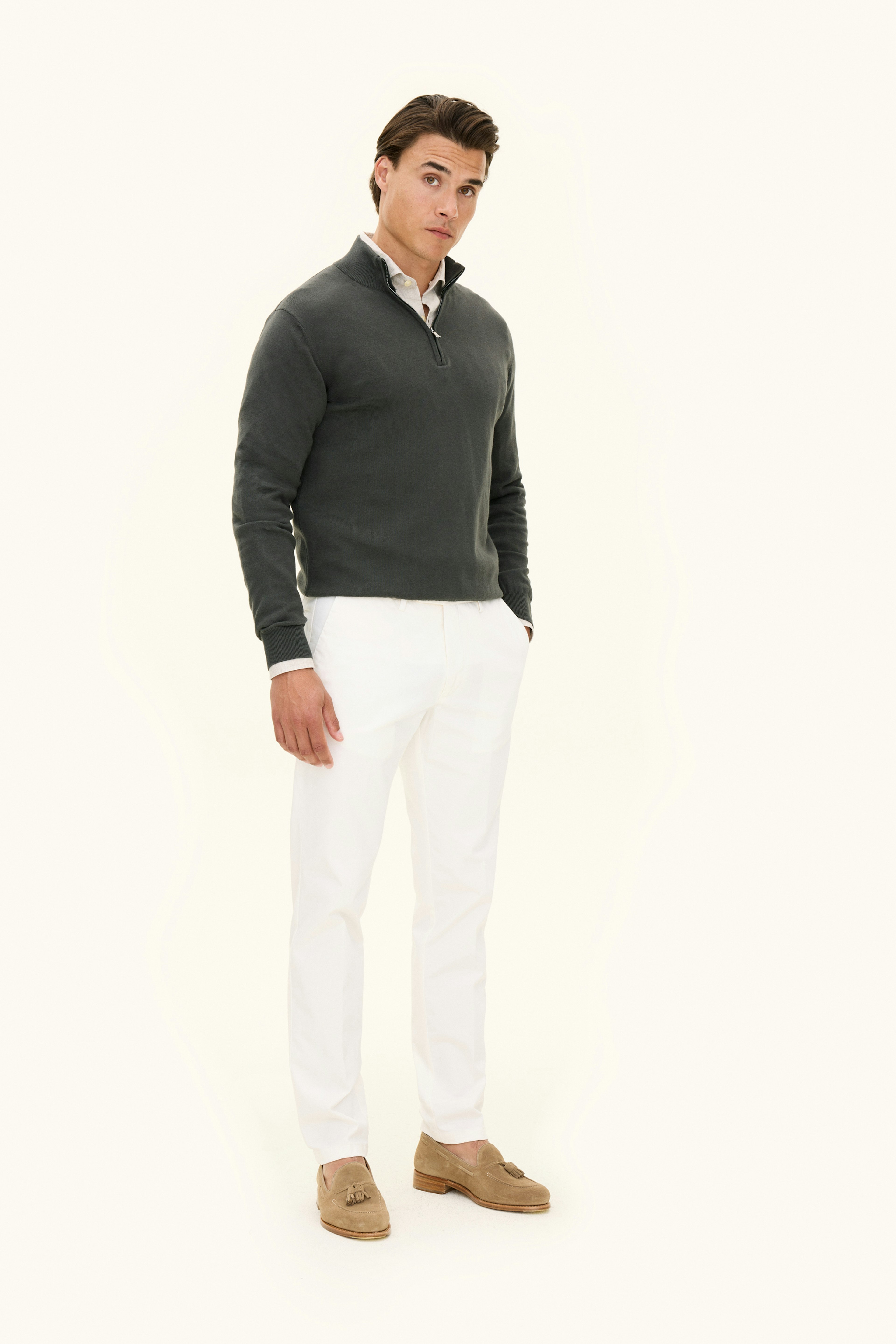 Laget av 100 % bomull, dette strikkede plagget har en slim fit. Det er designet med en sofistikert half zip-krage, stilrent med et tidløst ensfarget mønster og laget med strikket konstruksjon. Perfekt for lag-på-lag-stil eller som et fremtredende plagg.