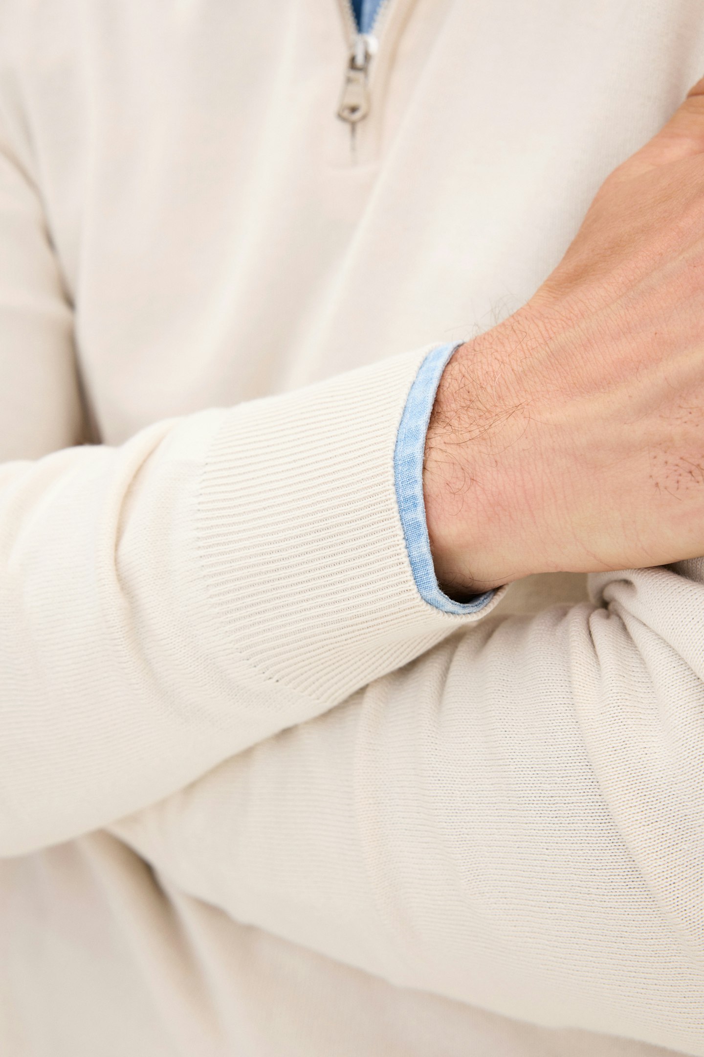 Laget av 100 % bomull, dette strikkede plagget har en slim fit. Det er designet med en sofistikert half zip-krage, stilrent med et tidløst ensfarget mønster og laget med strikket konstruksjon. Perfekt for lag-på-lag-stil eller som et fremtredende plagg.