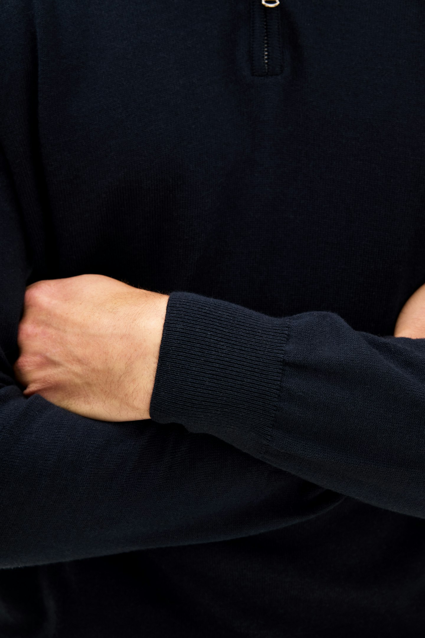 En genser med half-zip i en myk bomullsblanding med regular fit. Den strikkede teksturen gir et avslappet, men sofistikert uttrykk, mens detaljen med half-zip gjør at plagget lett kan variere mellom casual og elegant.