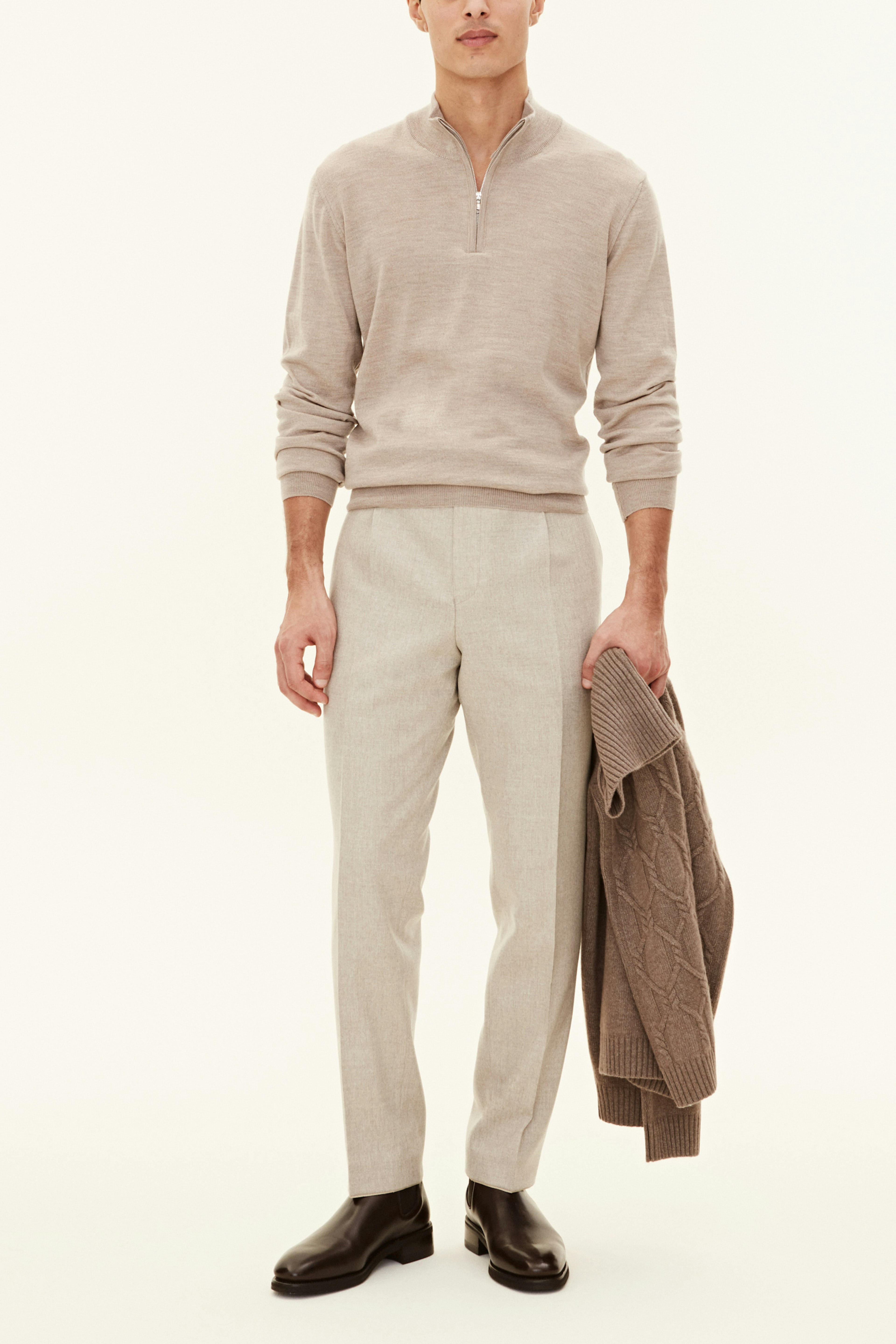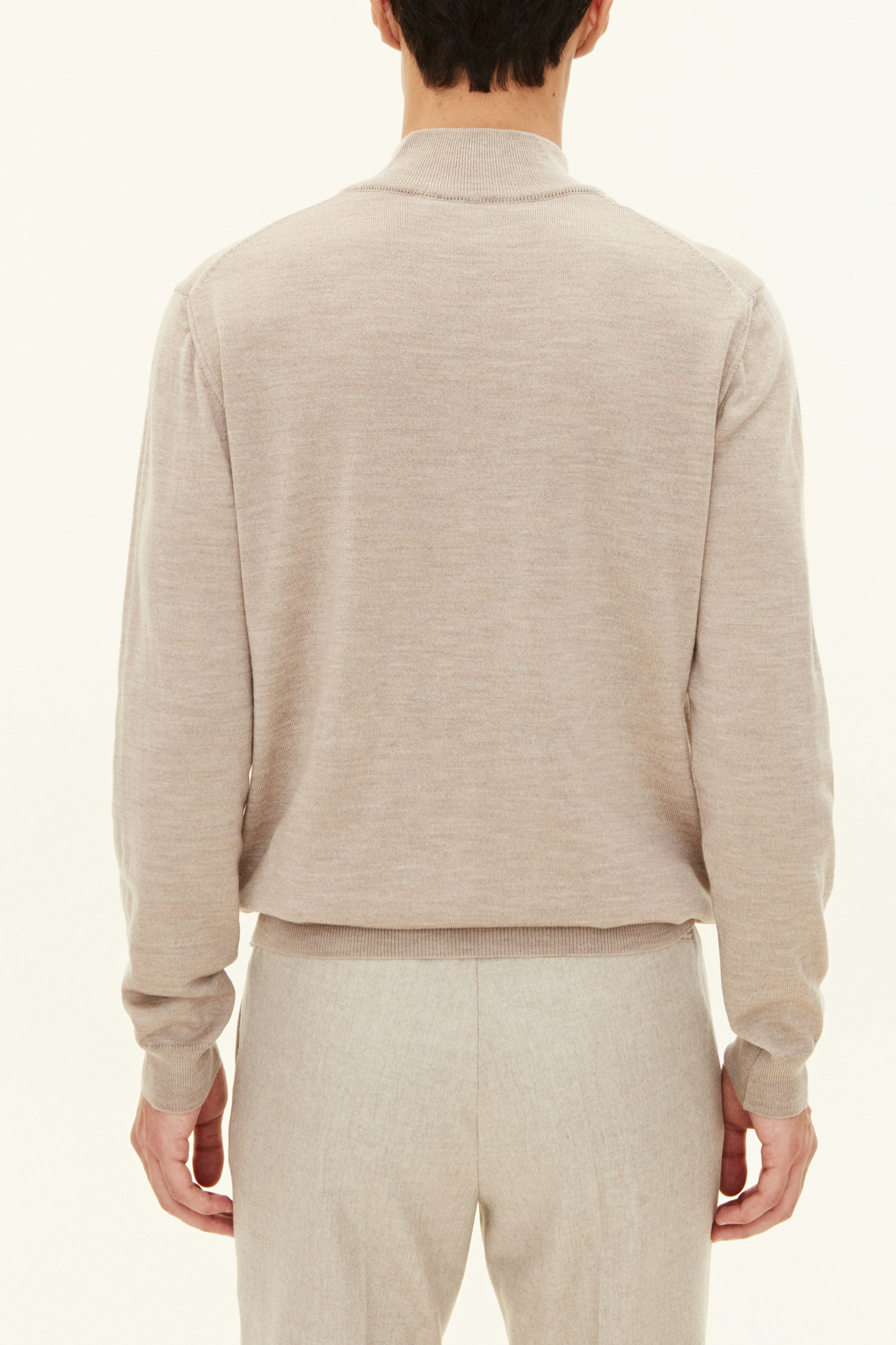 Stilig half zip-genser i ekstra fin merinoull fra Tollegno, Italia. Ullfibrene er lange og gir en luksuriøs, blank finish. Strikket i 12gg, som gjør den ideell både over en t-skjorte og skjorte, og under en blazer for en allsidig look.