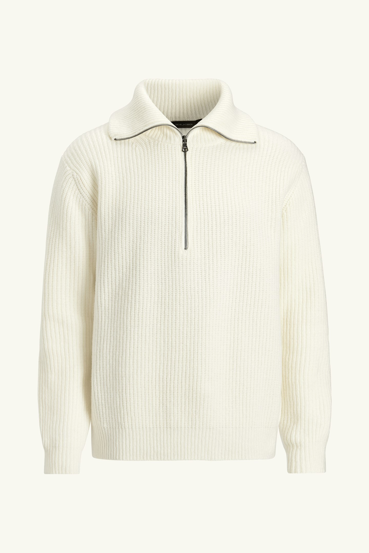 Varm half zip-genser med ekstra høy krage, strikket i 'English rib' som gir en stripet struktur. Strikket i 5gg for en kraftig og varm genser, perfekt for både innendørs og utendørs bruk.