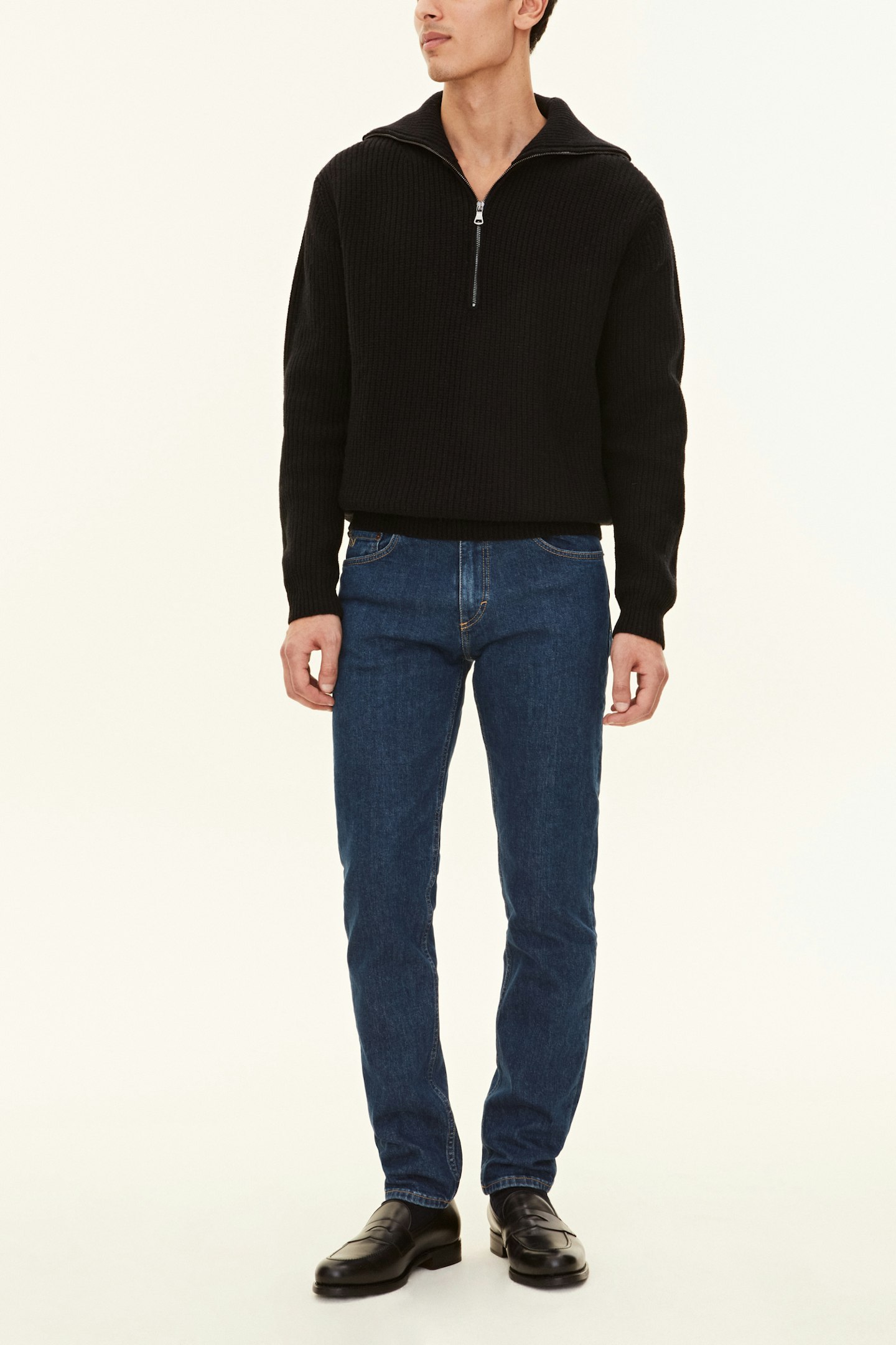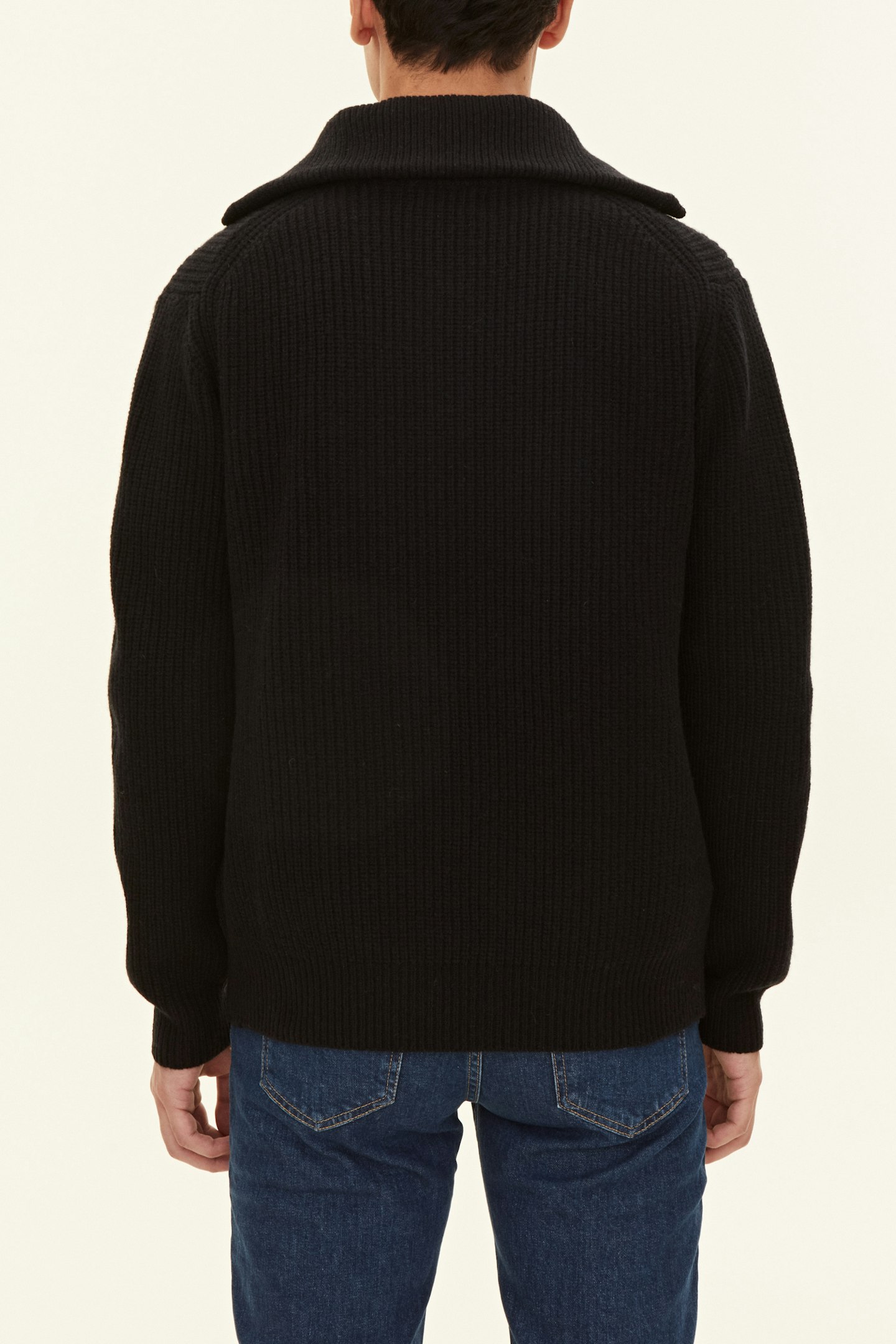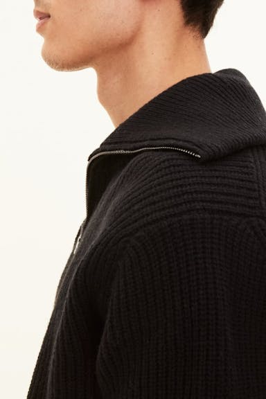 Varm half zip-genser med ekstra høy krage, strikket i 'English rib' som gir en stripet struktur. Strikket i 5gg for en kraftig og varm genser, perfekt for både innendørs og utendørs bruk.