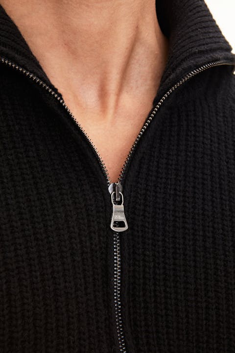 Varm half zip-genser med ekstra høy krage, strikket i 'English rib' som gir en stripet struktur. Strikket i 5gg for en kraftig og varm genser, perfekt for både innendørs og utendørs bruk.