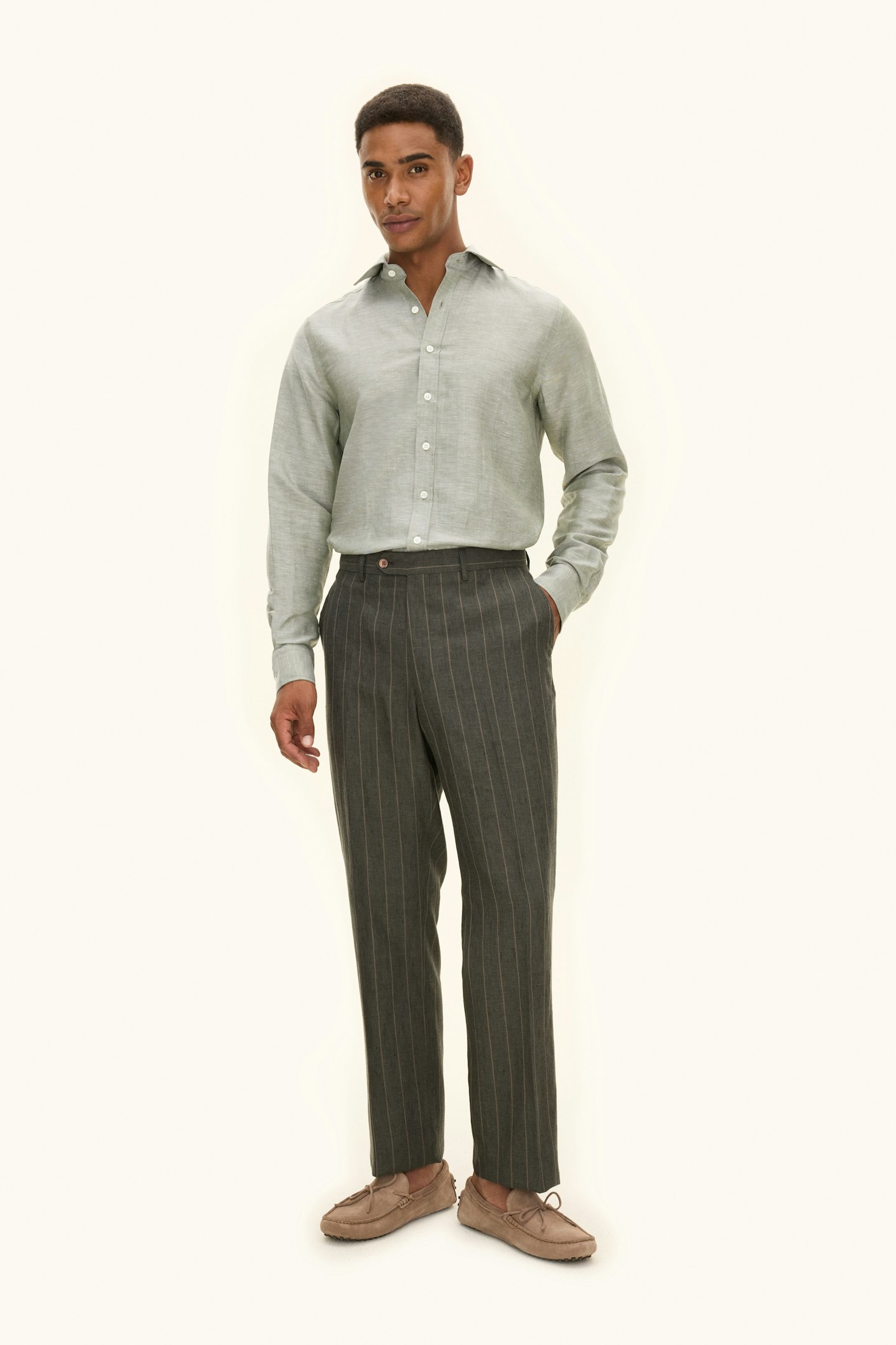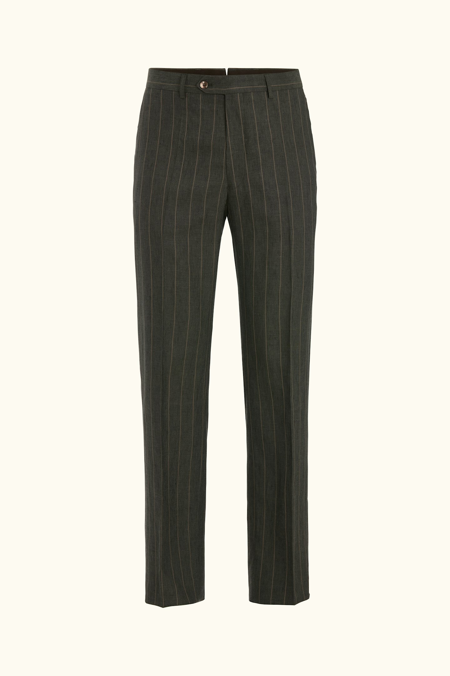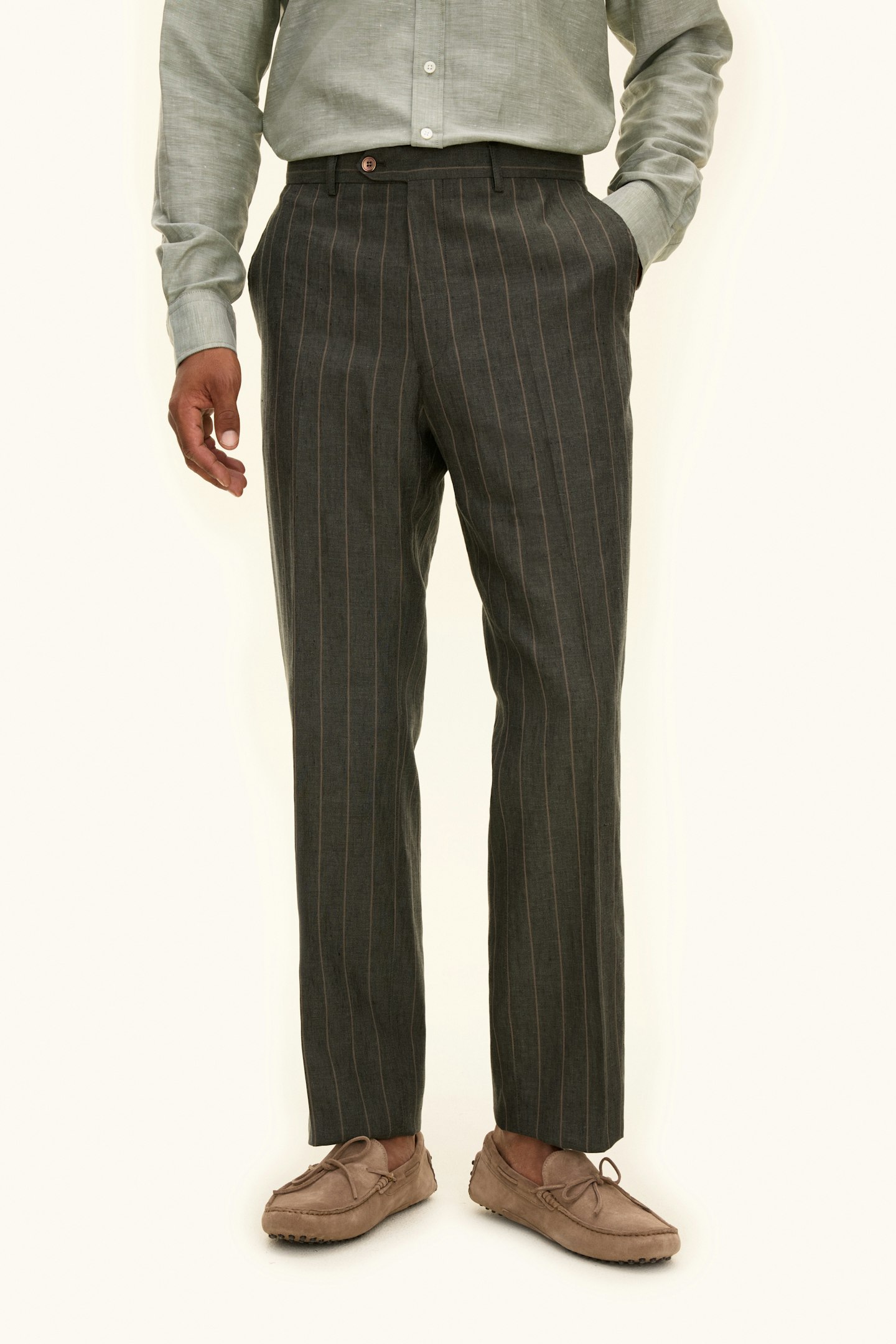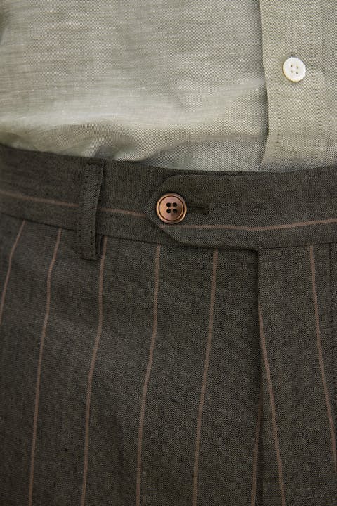 Høybukser i lin med et diskret stripete mønster. Regular fit-formen skaper en rett, luftig silhuett, mens linnet gir en naturlig kjølig følelse. En ideell stil for varme dager og sommerens mer avslappede, men stilige kombinasjoner.