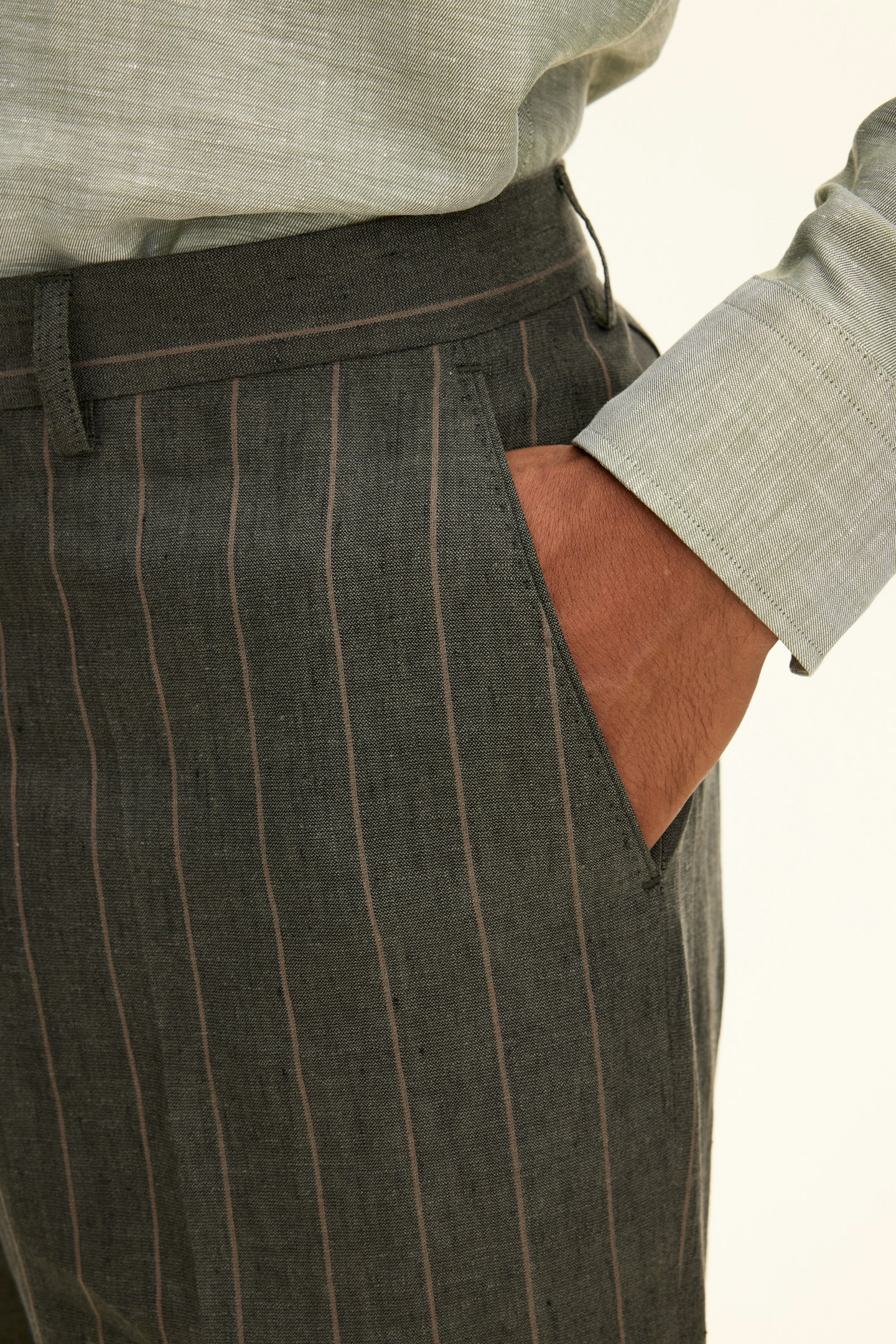 Høybukser i lin med et diskret stripete mønster. Regular fit-formen skaper en rett, luftig silhuett, mens linnet gir en naturlig kjølig følelse. En ideell stil for varme dager og sommerens mer avslappede, men stilige kombinasjoner.