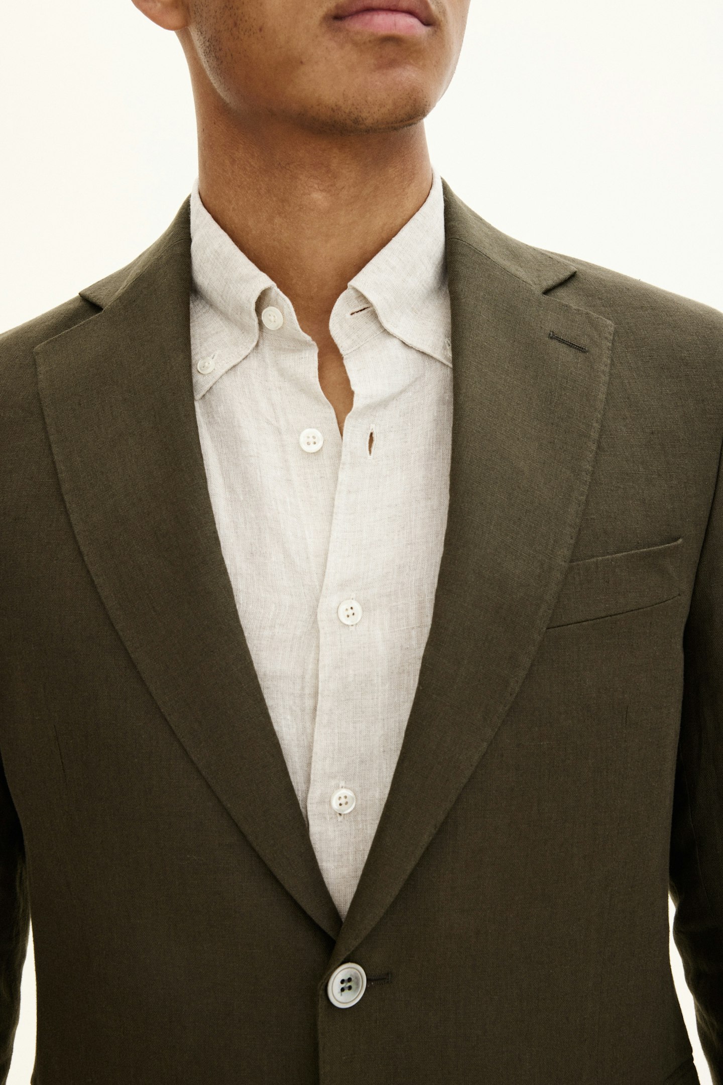 Enkeltspent blazer i regular fit med myk skulder, lommeklaff og helfôret innside. Laget av lin.