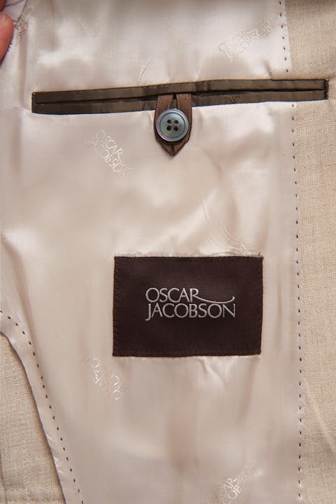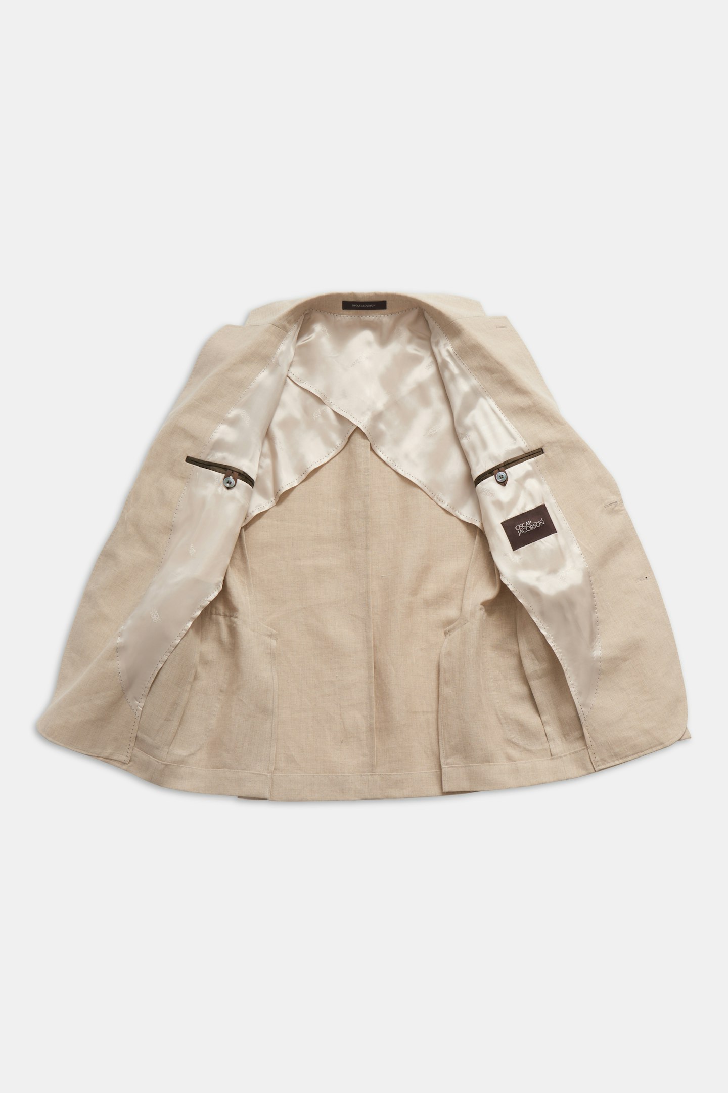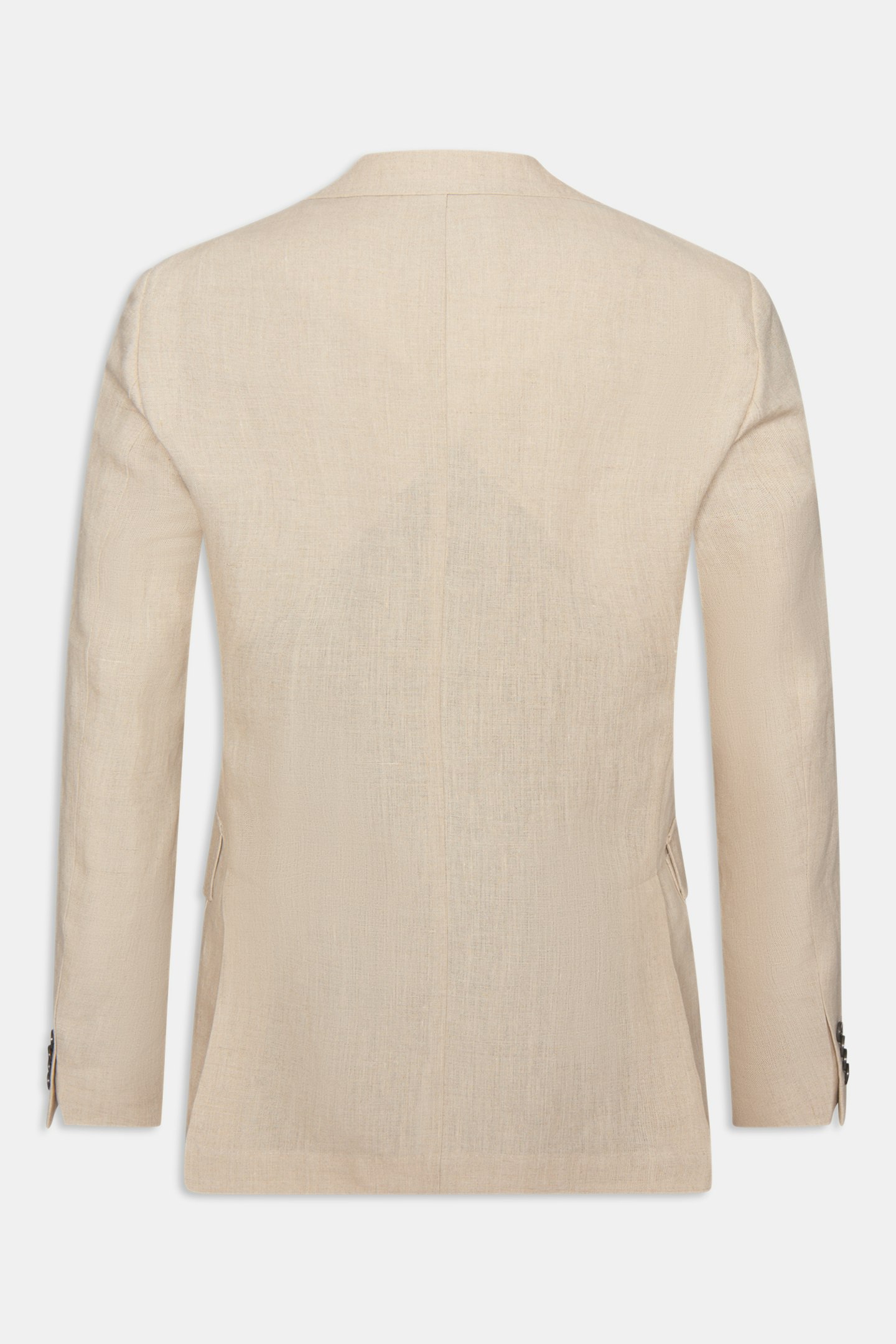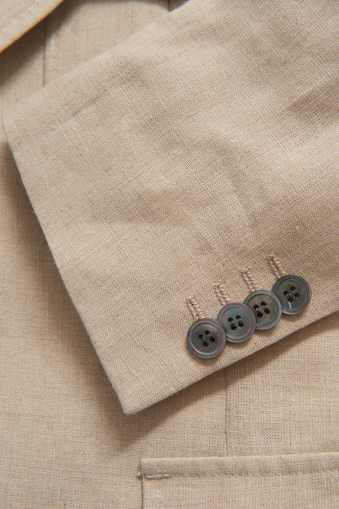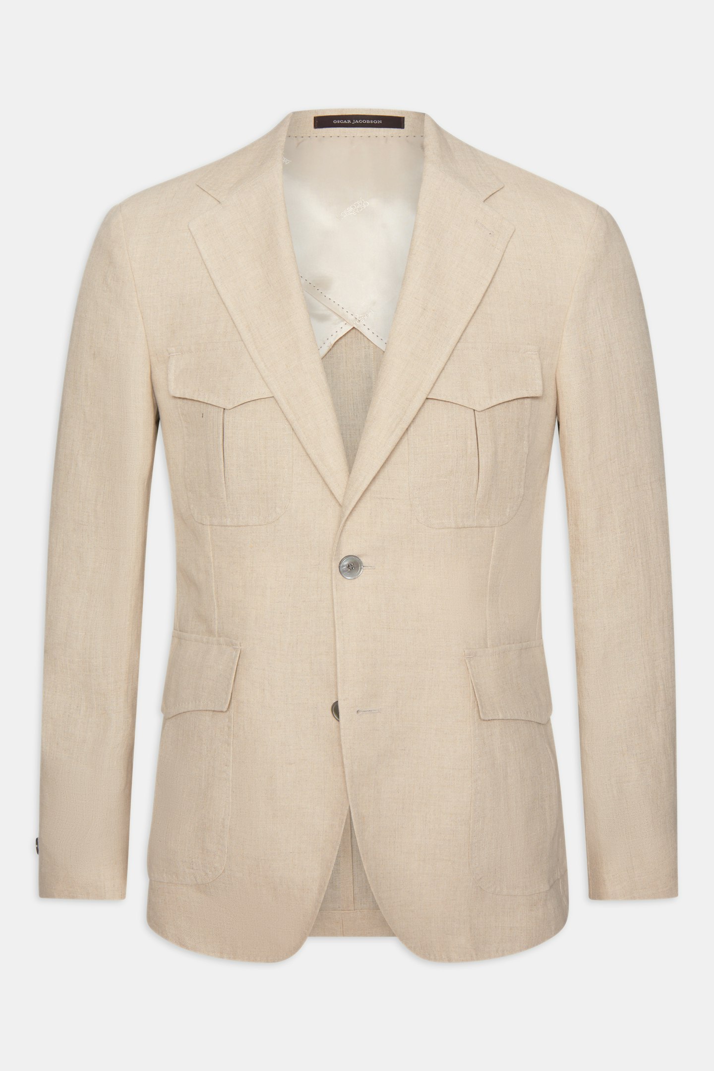 Enkeltspent blazer i safari-modell utstyrt med fire utenpåliggende lommer. Halvfôret innside, ukonstruert skulder og ekte perlemorknapper. Laget av et linstoff.