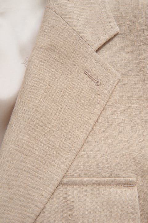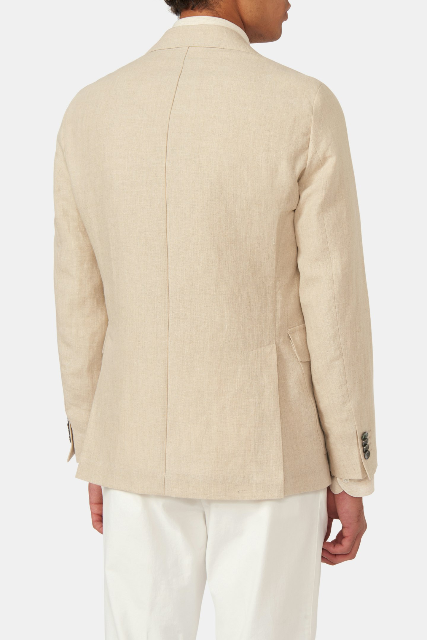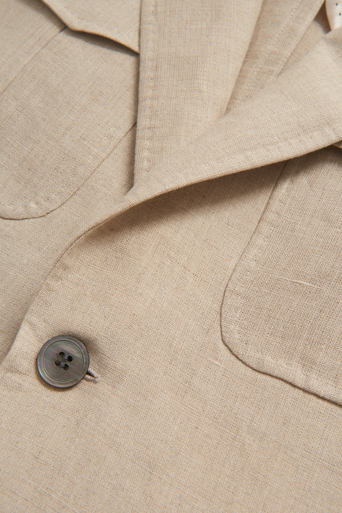 Enkeltspent blazer i safari-modell utstyrt med fire utenpåliggende lommer. Halvfôret innside, ukonstruert skulder og ekte perlemorknapper. Laget av et linstoff.